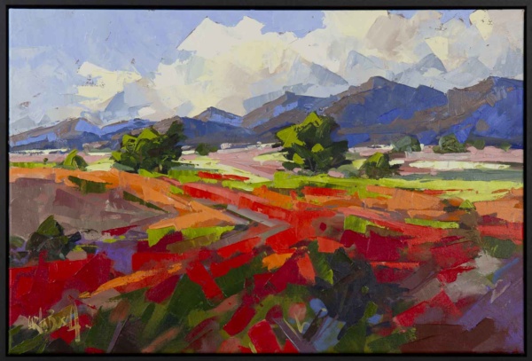 A stunning original painting with thick texture captured in the artist’s signature painterly style using palette knife. This painting is framed in a slim black open grain floating frame as shown and ready to hang.