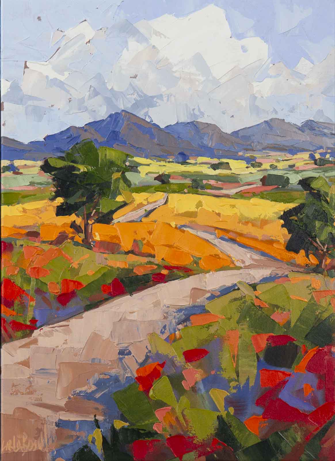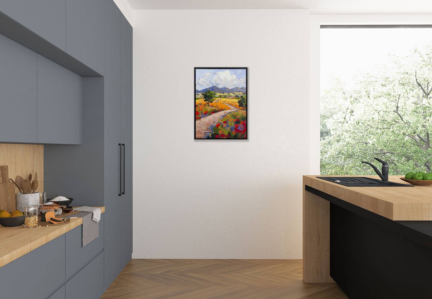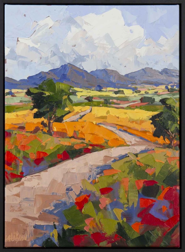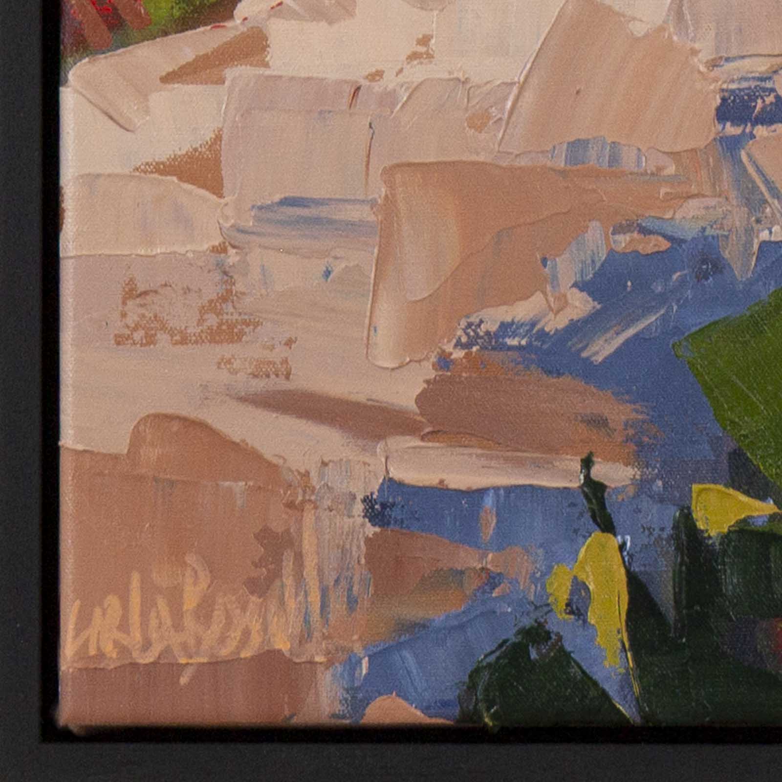 A stunning original painting with thick texture captured in the artist’s signature painterly style using palette knife. This painting is framed in a slim black open grain floating frame as shown and ready to hang.