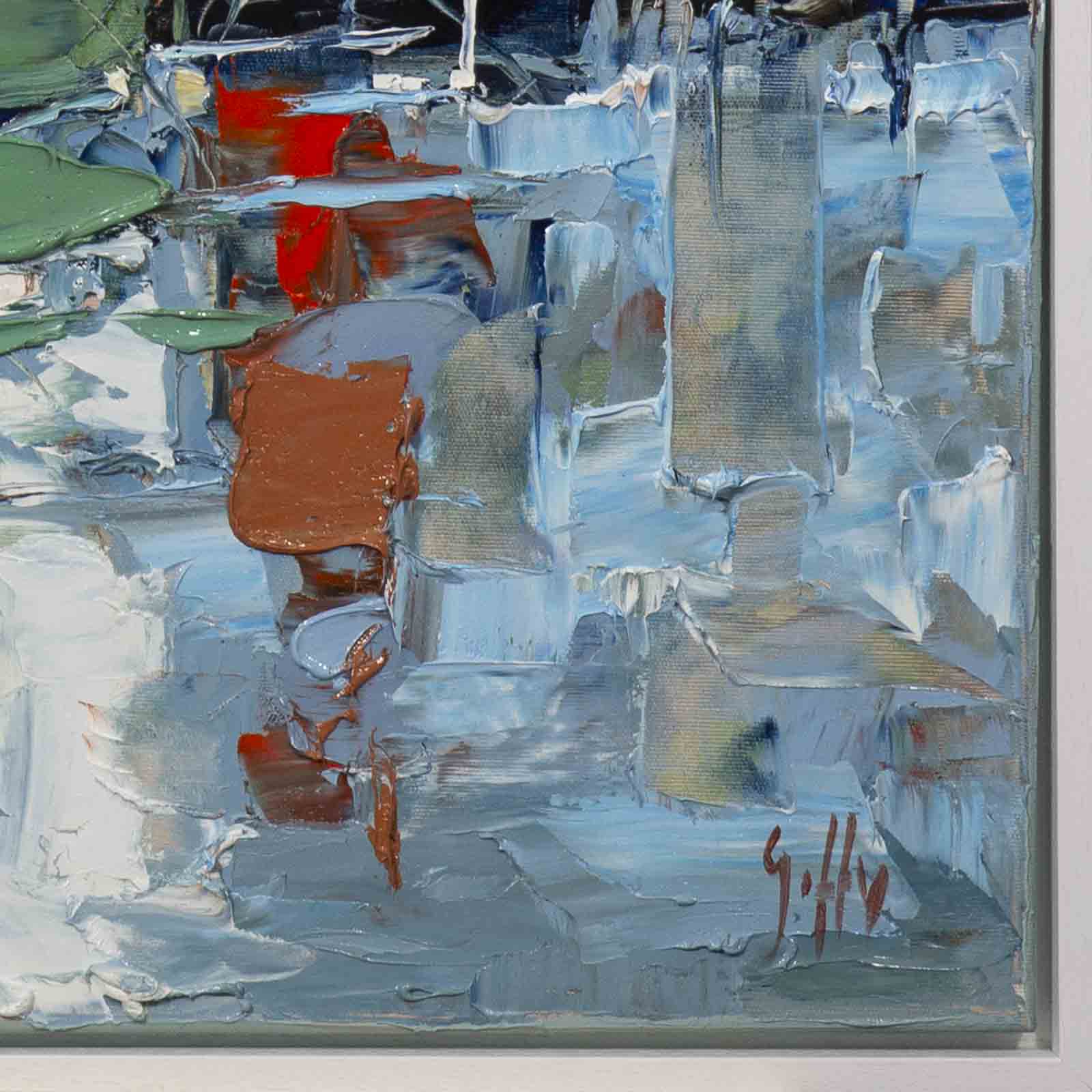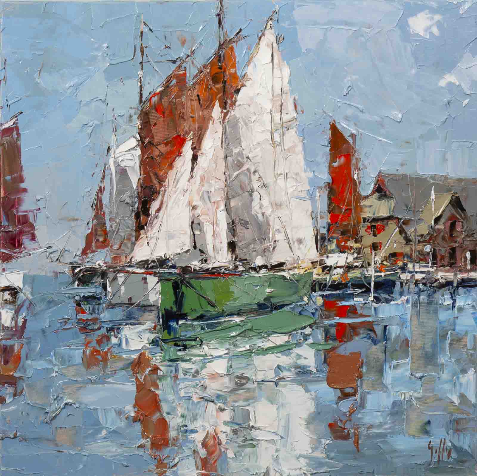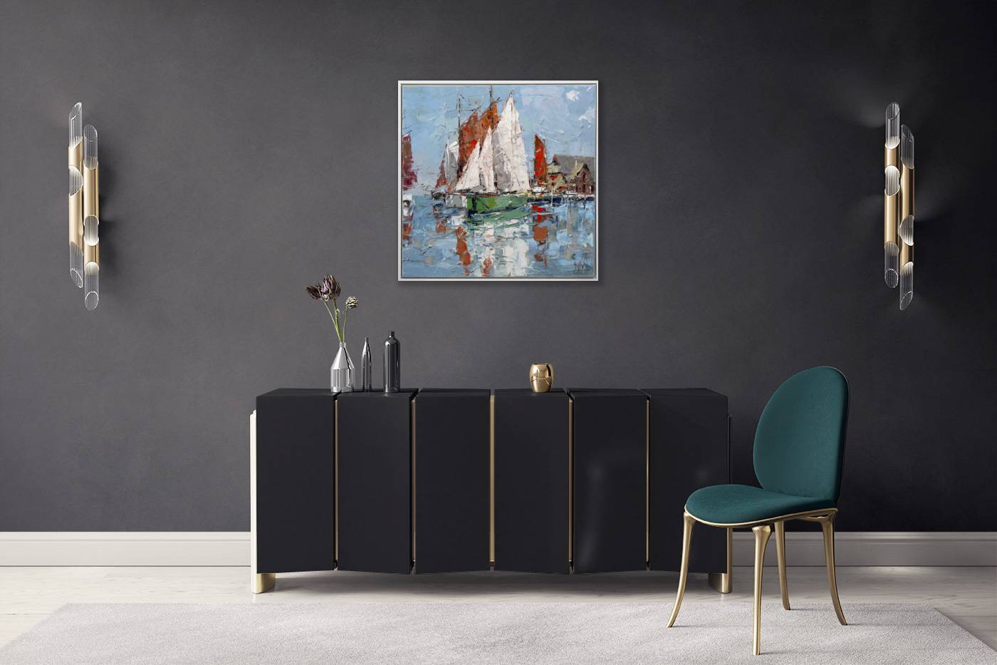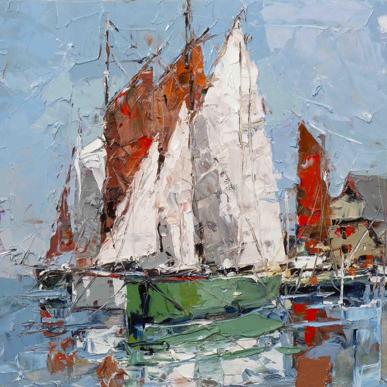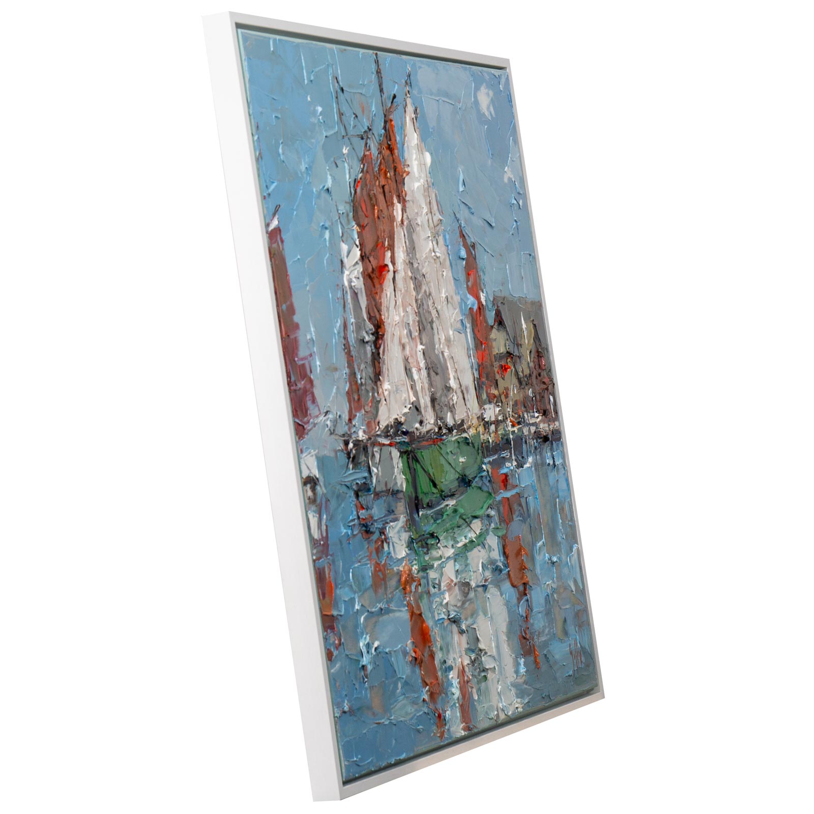 Sail Boats at The Marina, an original painting masterfully captured in Frank Getty’s beautiful palette knife painting style. Presented in a contemporary white floating frame as shown and ready to hang.