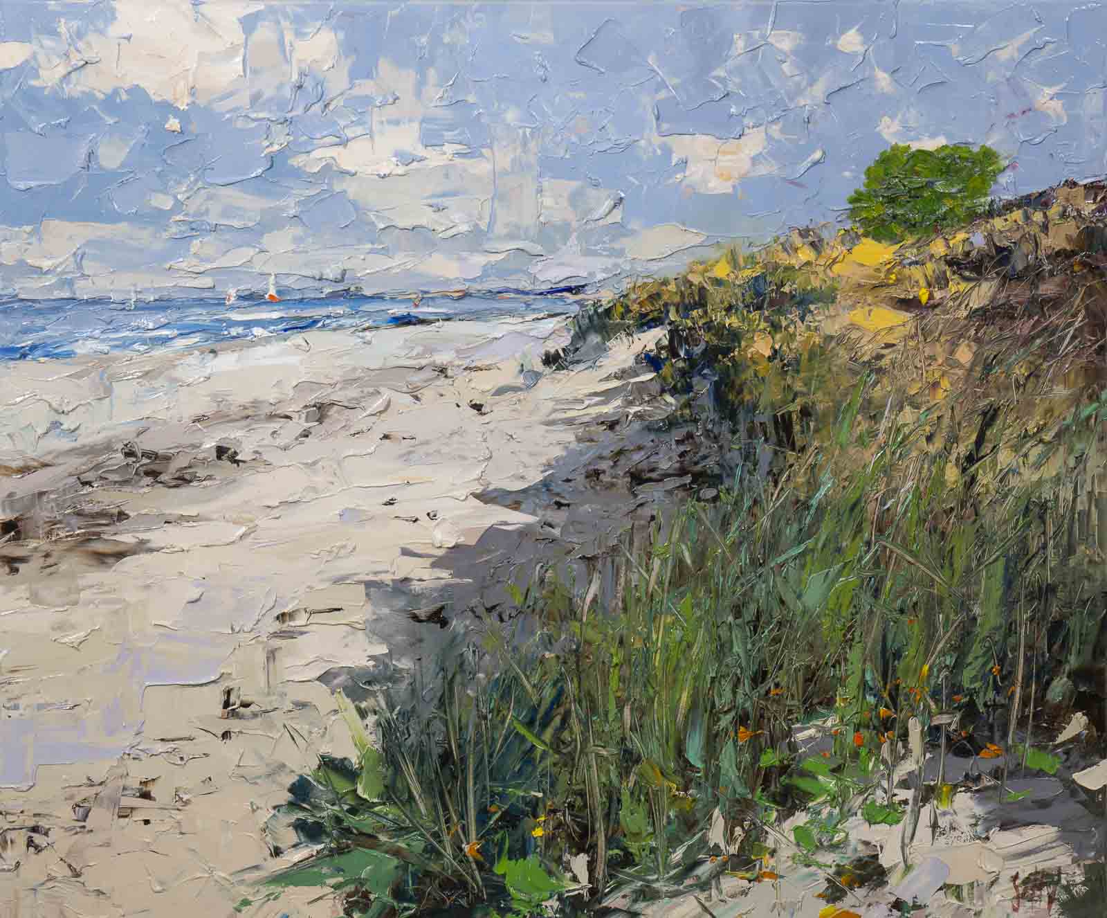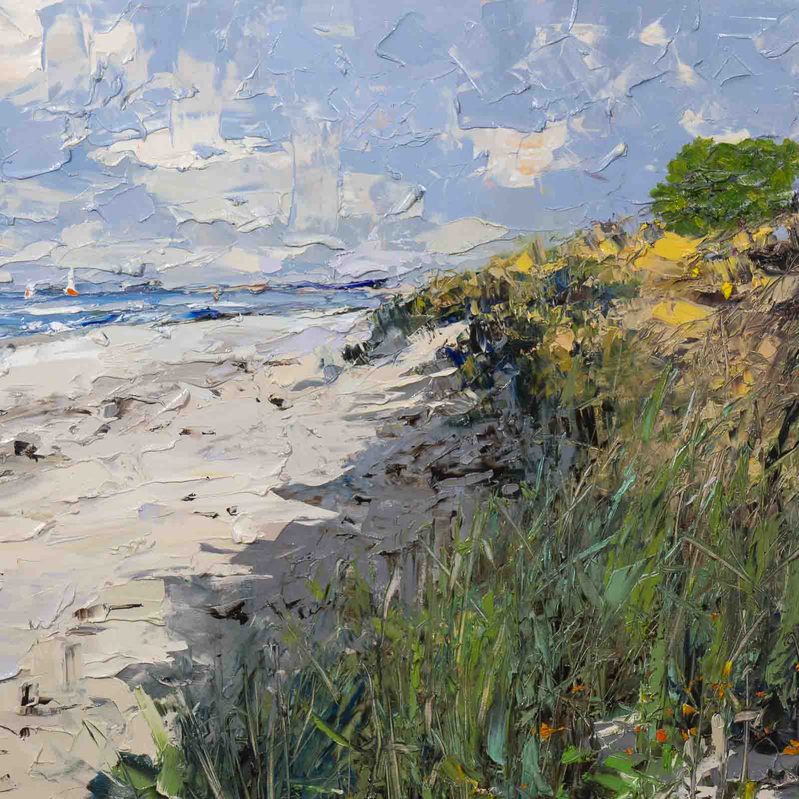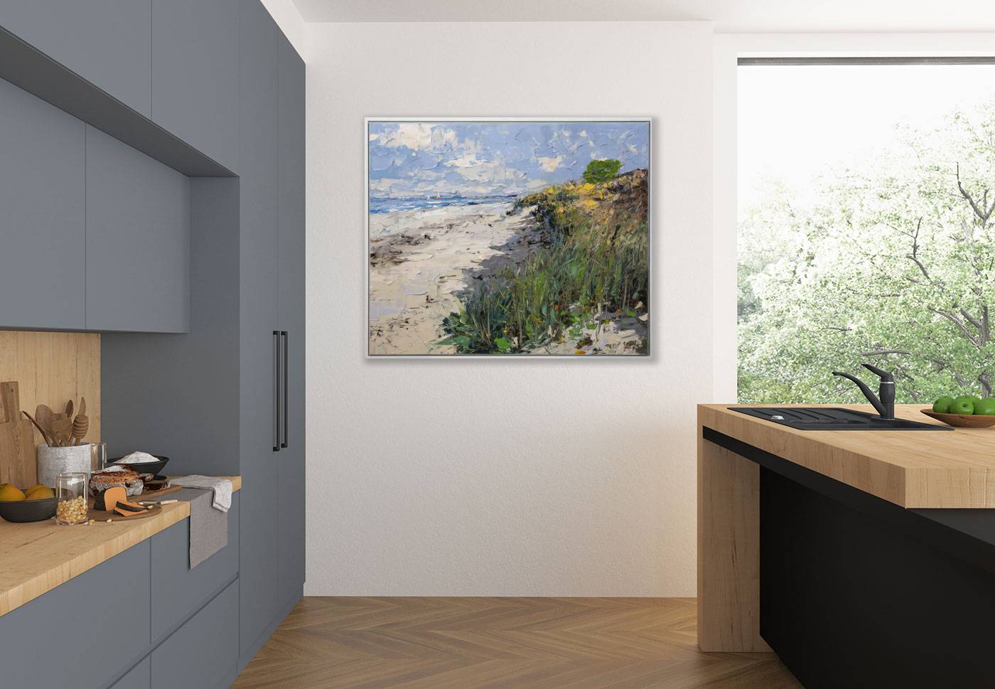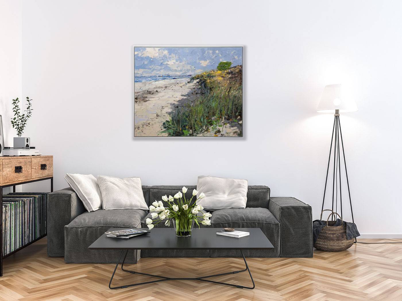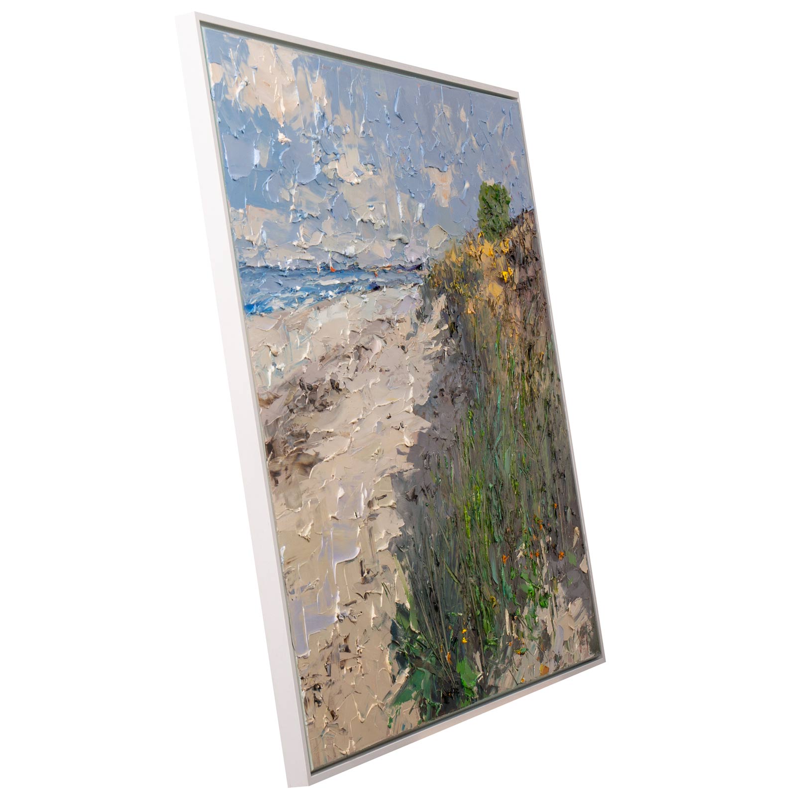 Beachside Walk, an original painting masterfully captured in Frank Getty’s beautiful palette knife painting style. Presented in a contemporary white floating frame as shown and ready to hang.