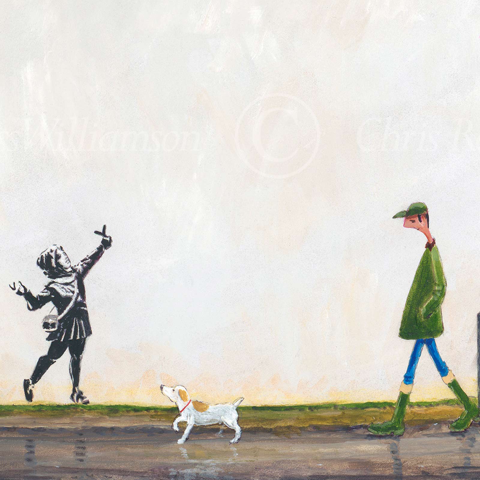 Often described as quirky and whimsical, Chris’ playful work usually involves an atmospheric land or seascape populated with his characters – the gaunt and dry-humoured, ‘Garfield Eldritch’ and his faithful Jack Russell pal, ‘Barton Darcy’. The British east coast landscape and vernacular architecture feature heavily as a backdrop and touches of humour are often evident. Chris says “I like to give people a grin if I can”.