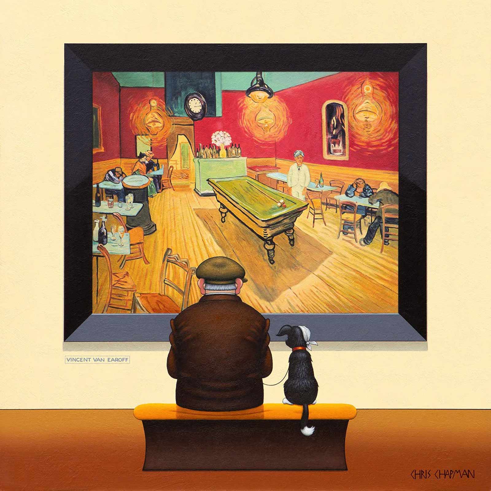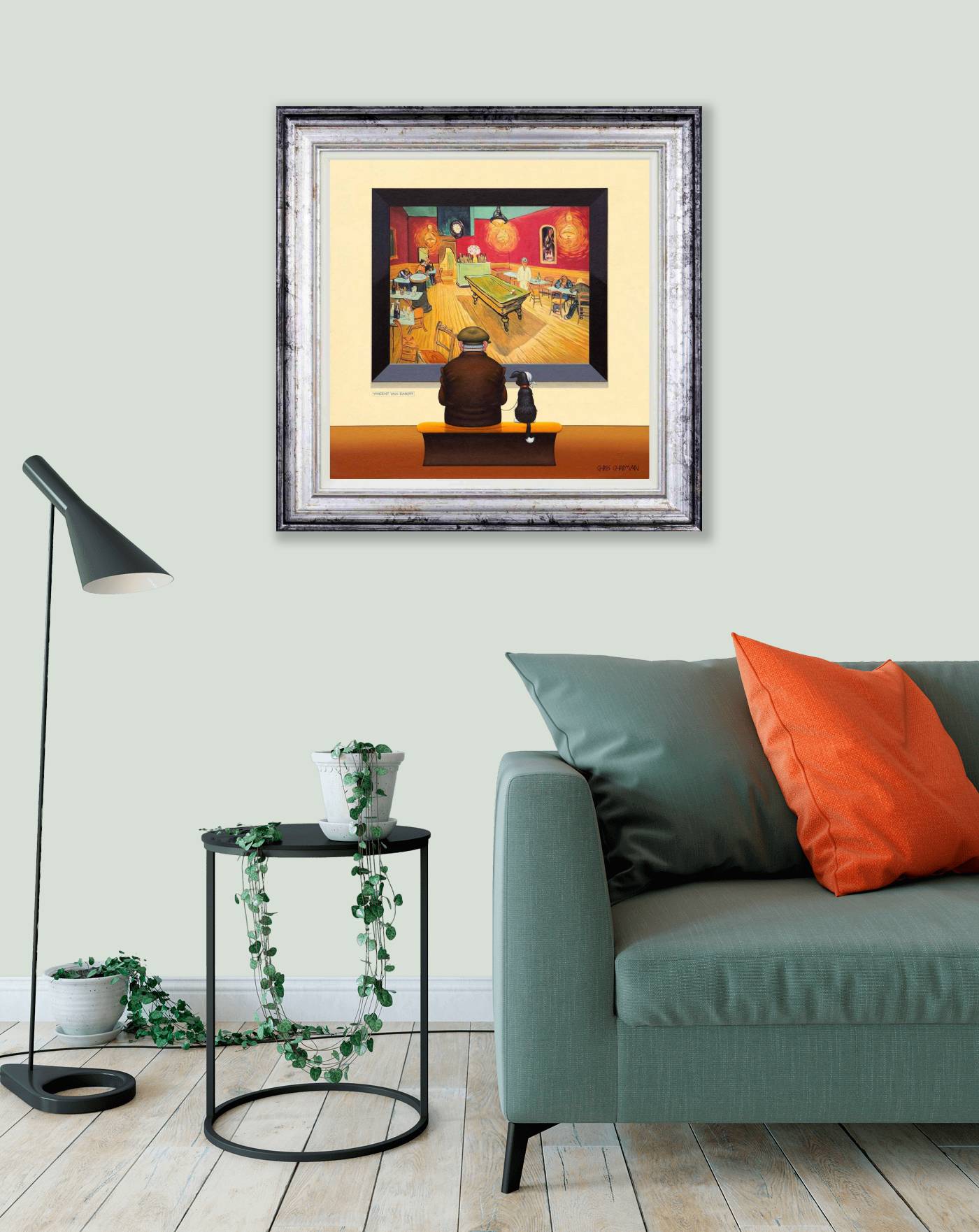 Chris Chapman Van Gough inspired print, forming part of the ‘Artist Series’. Clever and humorous, taking inspiration from the Night Café by Vincent Van Gogh. Limited edition of 35. Framed as shown in a contemporary distressed frame with white slip.
