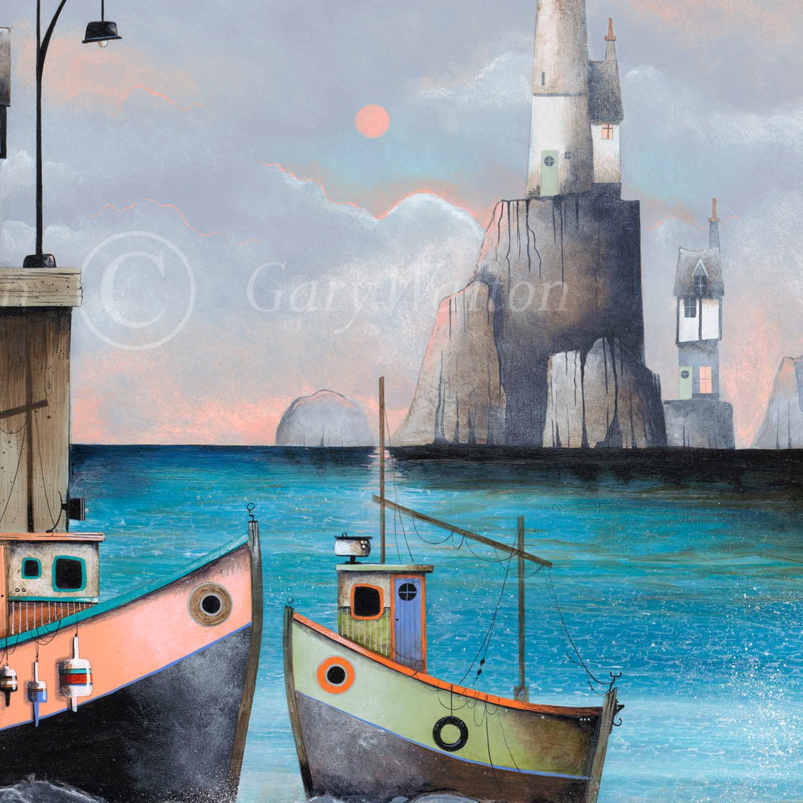 Despite having resided inland over recent years, Gary still has a strong affection for the coast. This is no more evident than in his artwork, with boats, beach huts and lighthouses providing a staple recurring motif. Whimsical buildings inhabit the rolling hills of his landscapes, providing both the audience and artist with a means to escape to his fantastical locations.
