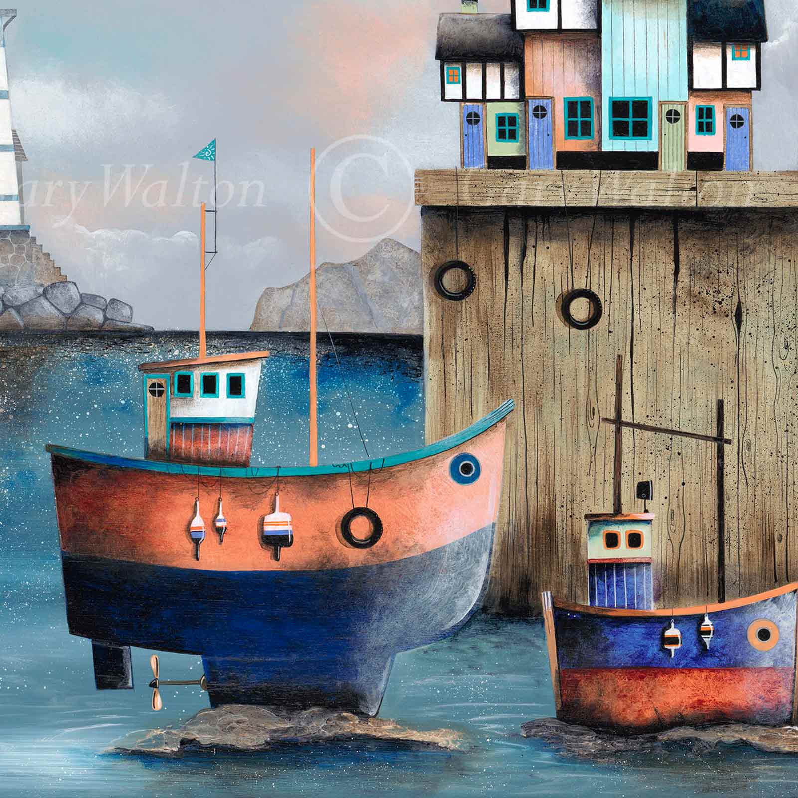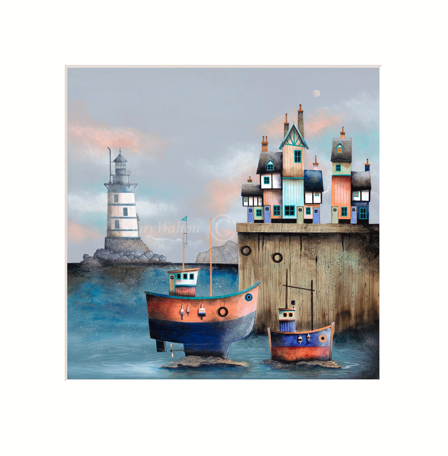 Despite having resided inland over recent years, Gary still has a strong affection for the coast. This is no more evident than in his artwork, with boats, beach huts and lighthouses providing a staple recurring motif. Whimsical buildings inhabit the rolling hills of his landscapes, providing both the audience and artist with a means to escape to his fantastical locations.