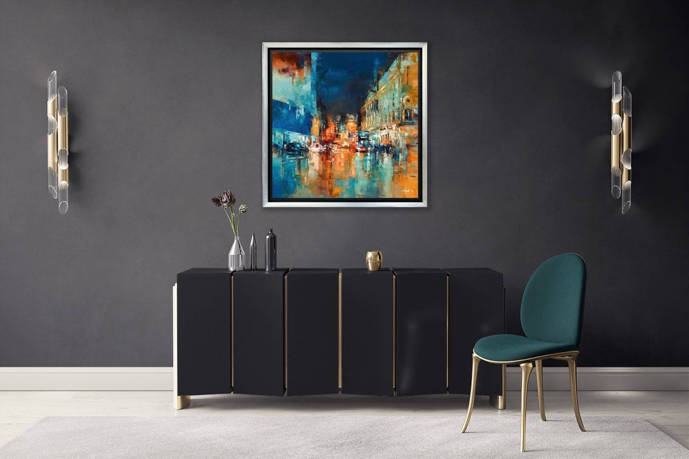 Atmospheric cityscape of London by French artist, Benoît Havard. A limited edition of 50, this Studio Edition is overpainted in areas with textured oil paint and embellished gel brush marks to enhance the final artwork. Presented framed in a black and silver contemporary floating style frame as shown and ready to hang.