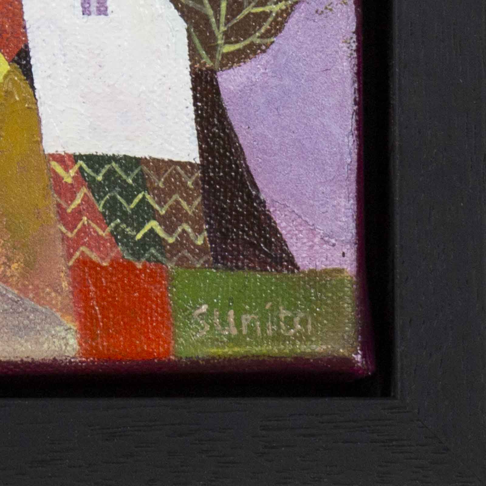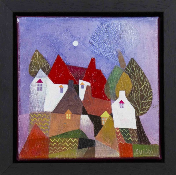 A cute and colourful original painting by Indian born artist Sunita Khedekar. Sunita invites us to enjoy her magical world in this naïve style painting from her ‘Birds Series’. Presented framed in contemporary white tray frame and ready to hang.