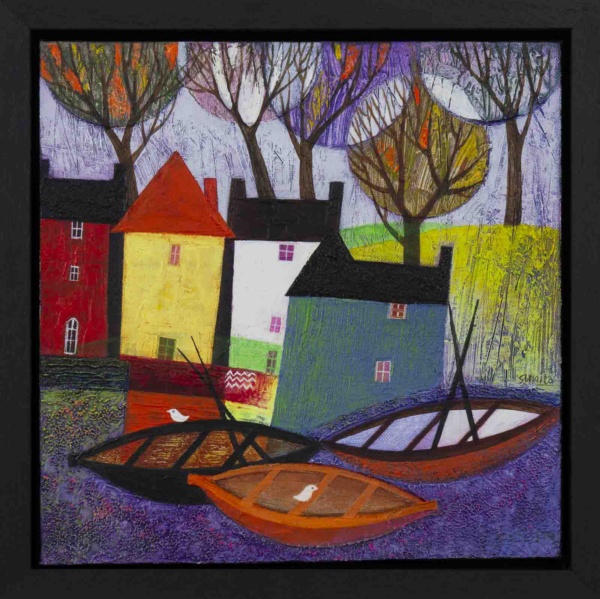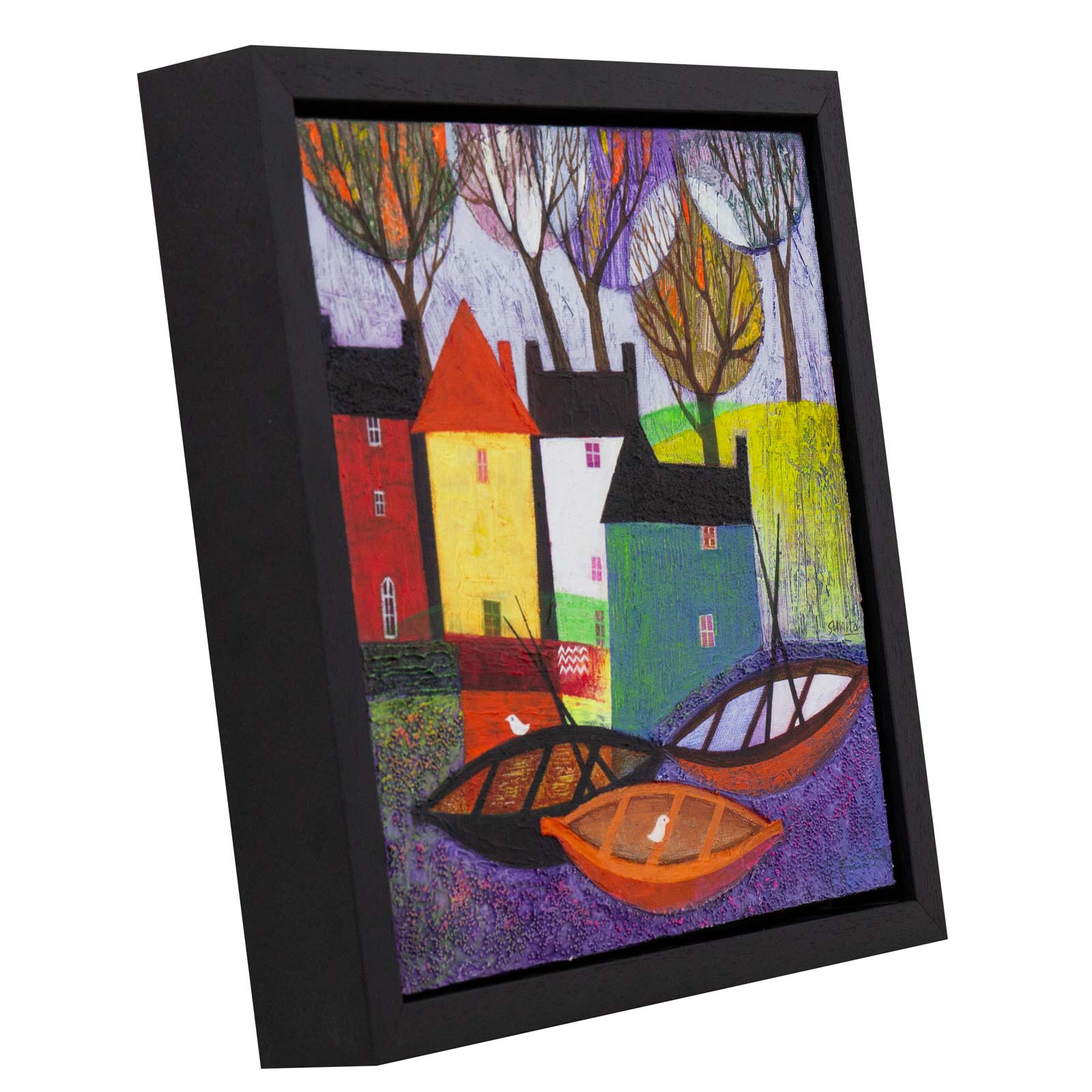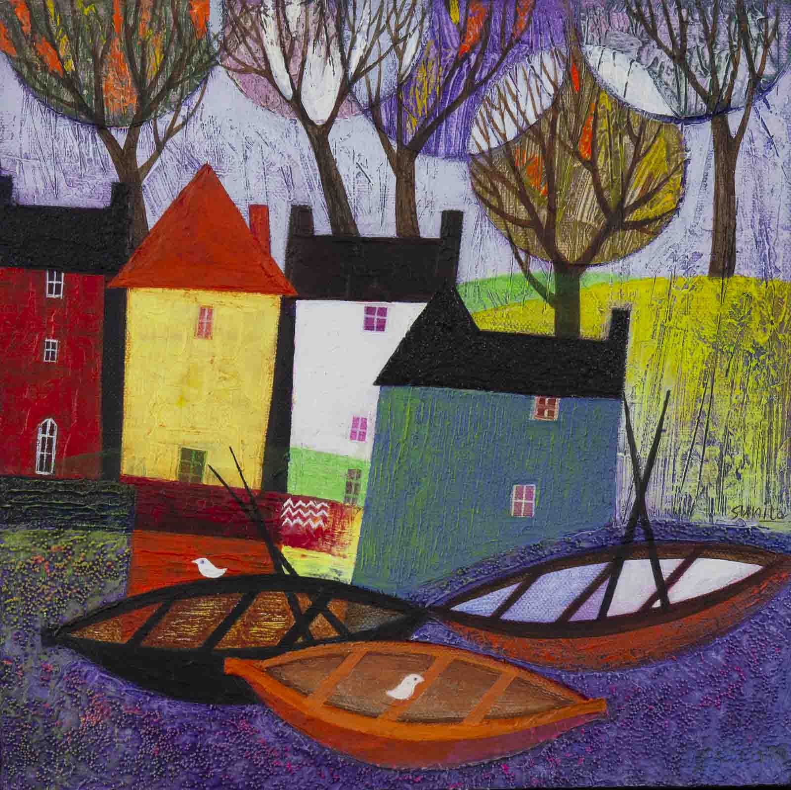 A cute and colourful original painting by Indian born artist Sunita Khedekar. Sunita invites us to enjoy her magical world in this naïve style painting from her ‘Birds Series’. Presented framed in contemporary white tray frame and ready to hang.