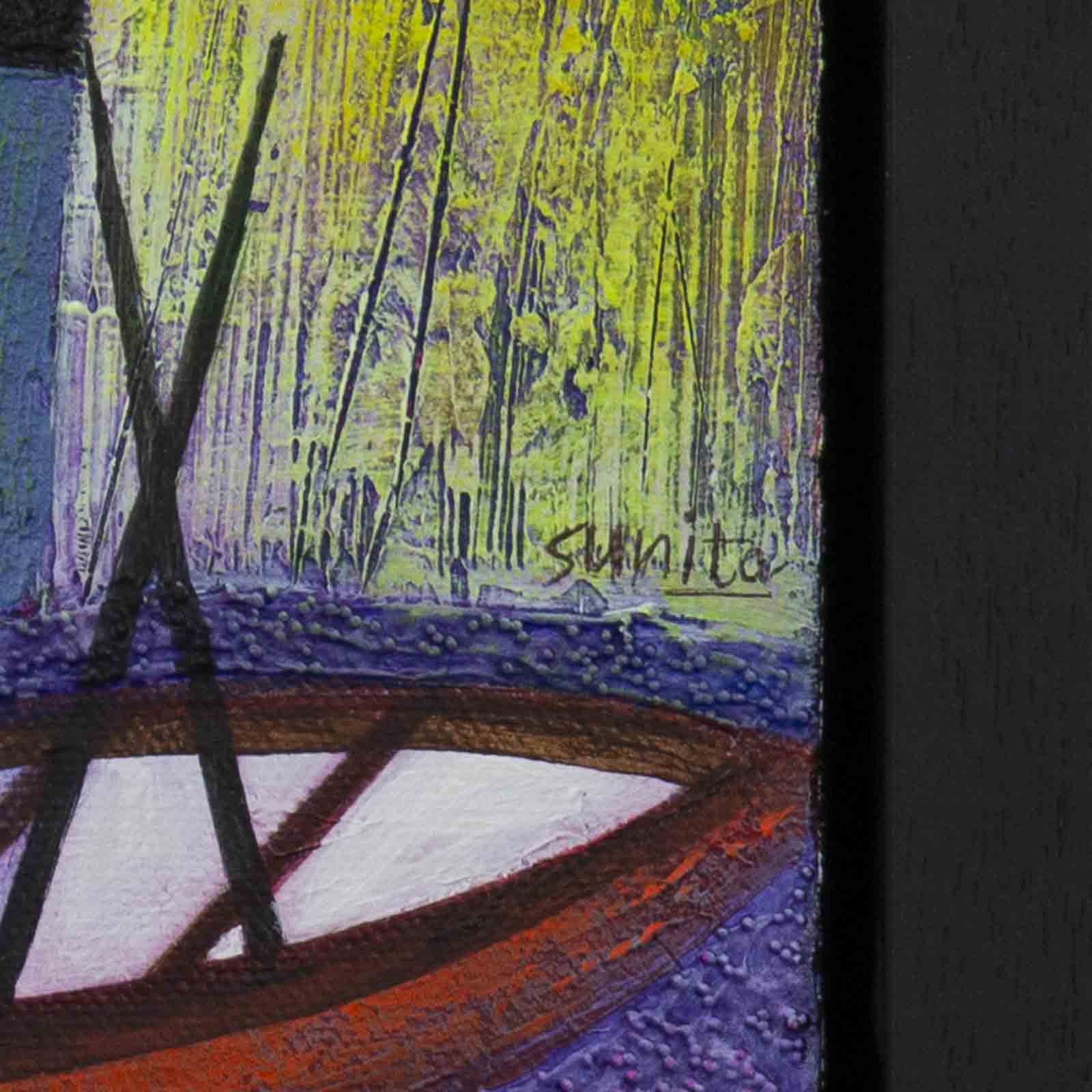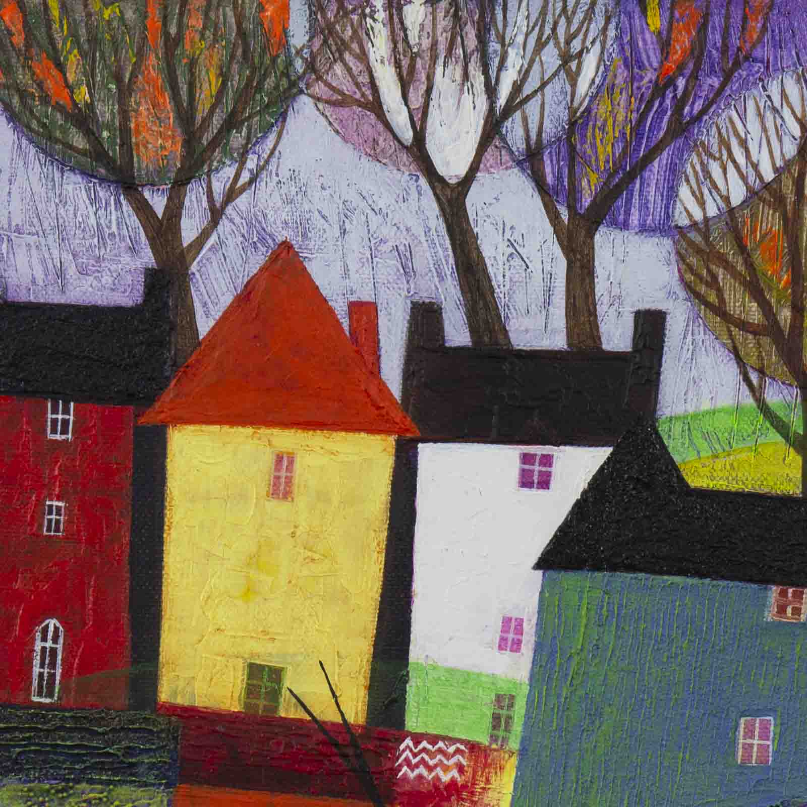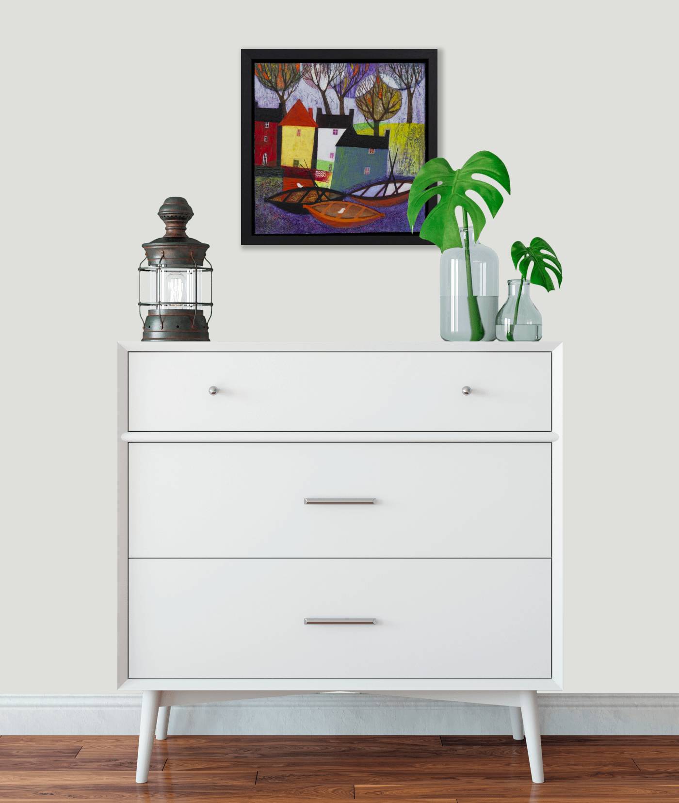 A cute and colourful original painting by Indian born artist Sunita Khedekar. Sunita invites us to enjoy her magical world in this naïve style painting from her ‘Birds Series’. Presented framed in contemporary white tray frame and ready to hang.