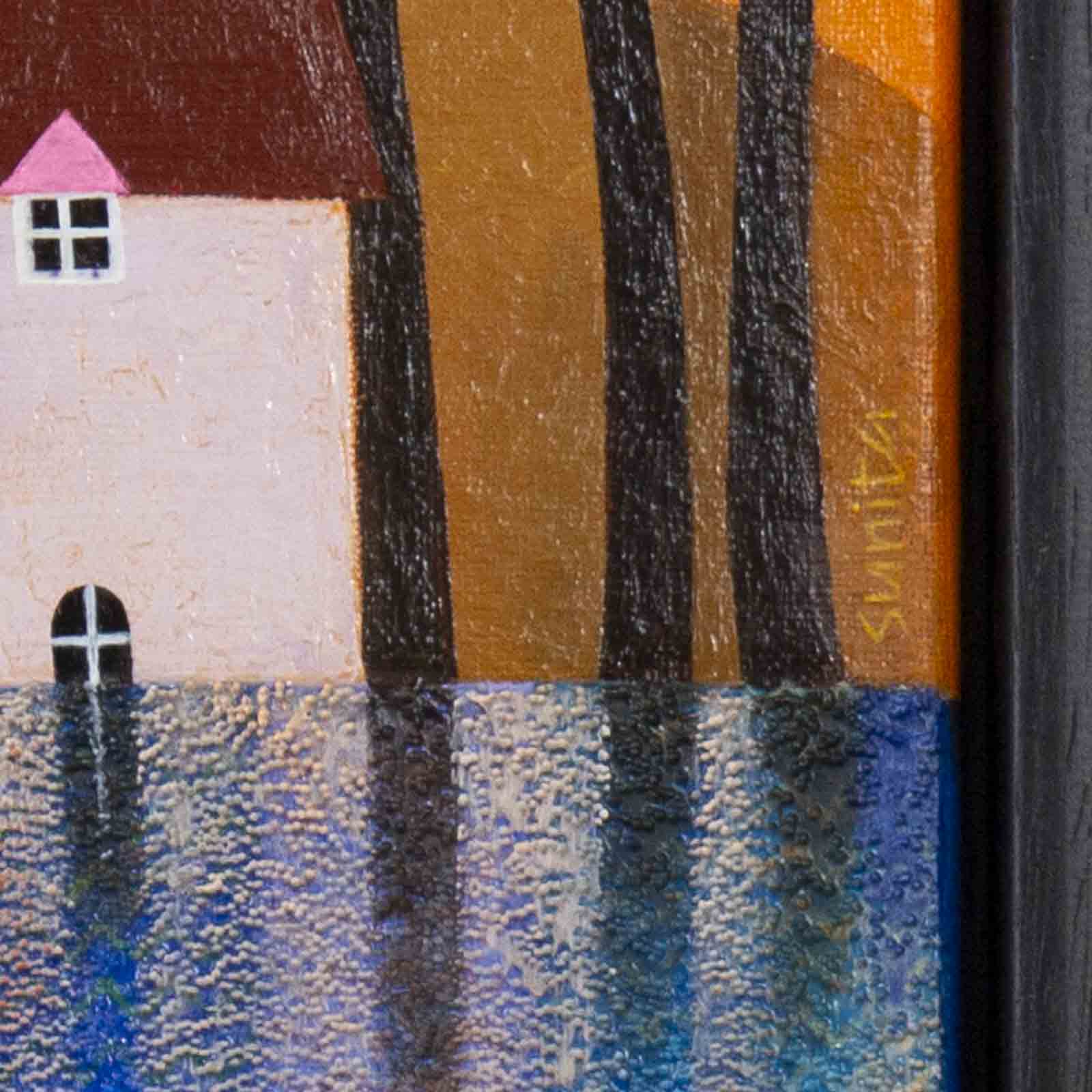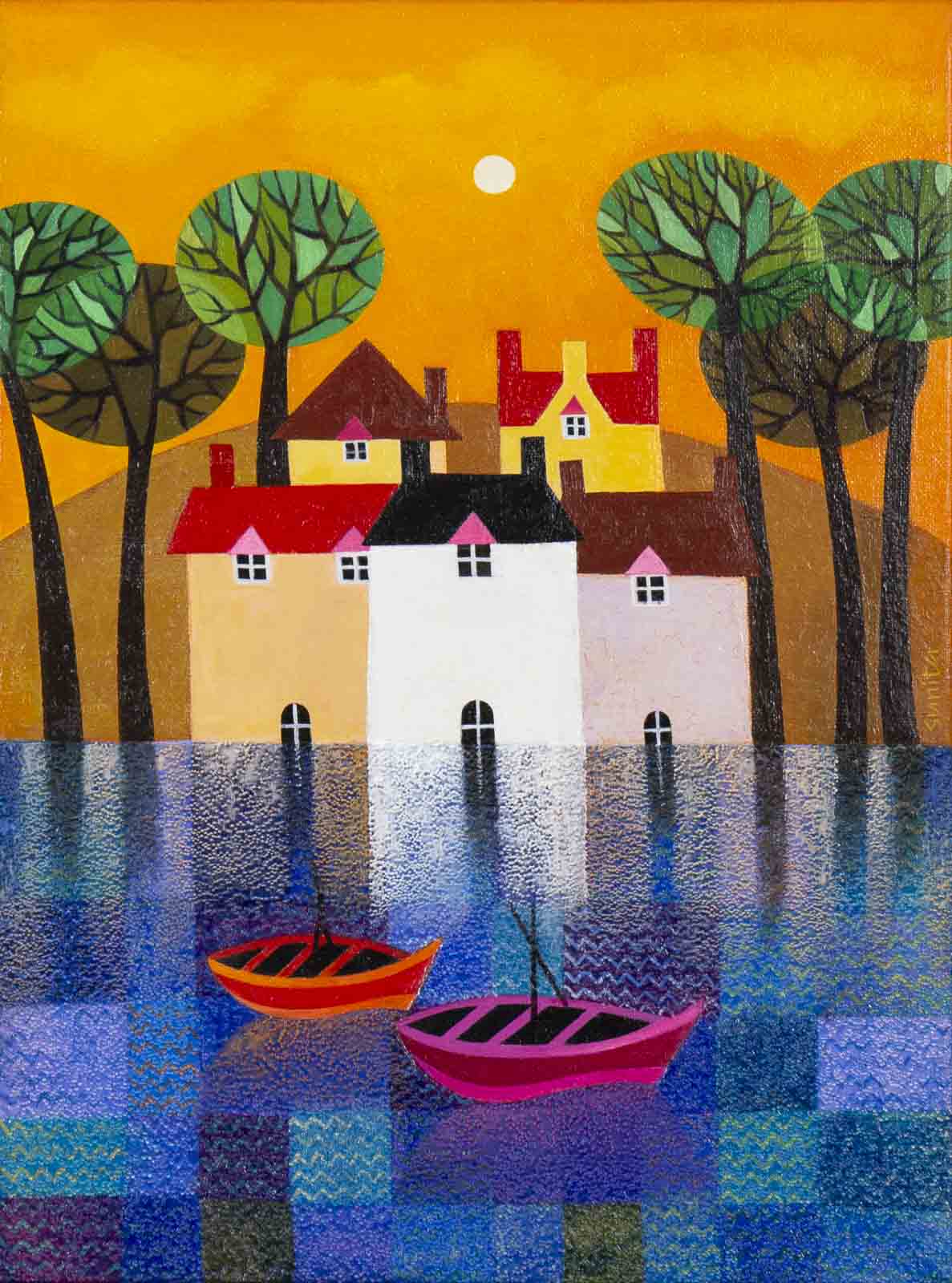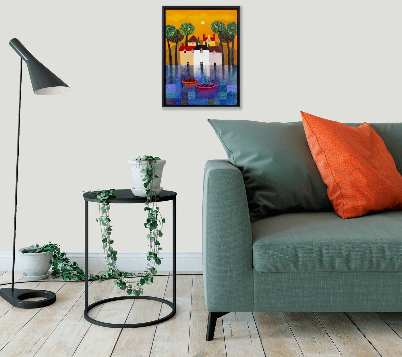 A cute and colourful original painting by Indian born artist Sunita Khedekar. Sunita invites us to enjoy her magical world in this semi abstracted naïve style painting. Presented framed in contemporary black tray frame and ready to hang.