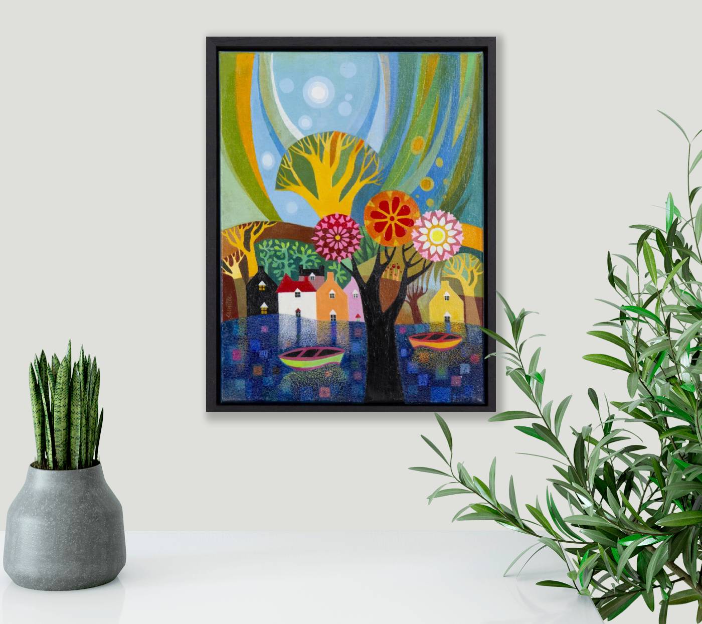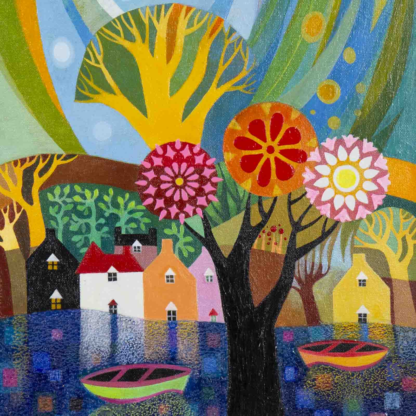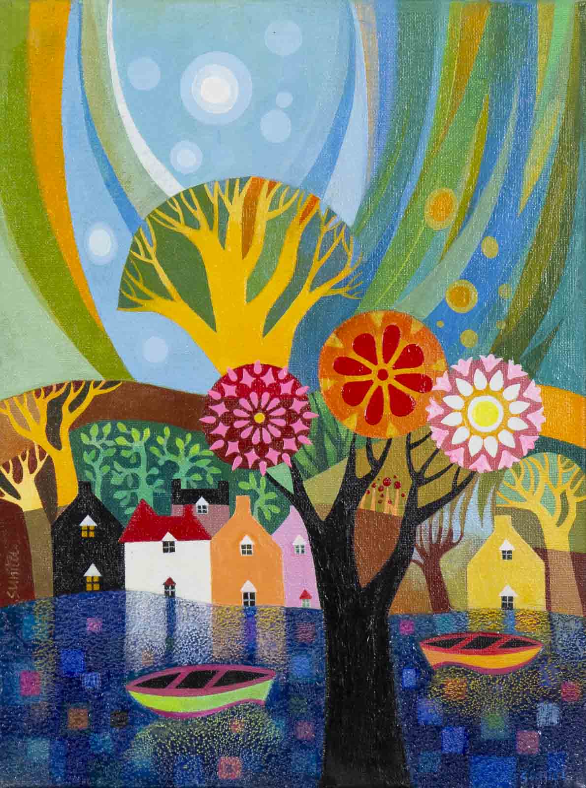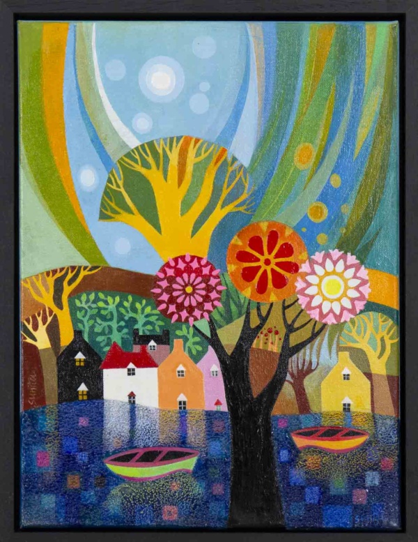 A cute and colourful original painting by Indian born artist Sunita Khedekar. Sunita invites us to enjoy her magical world in this semi abstracted naïve style painting. Presented framed in contemporary black tray frame and ready to hang.