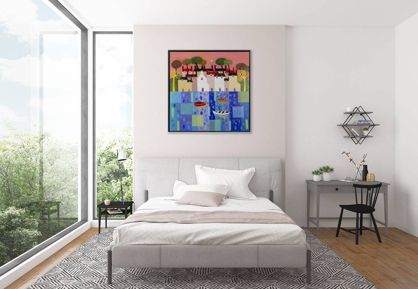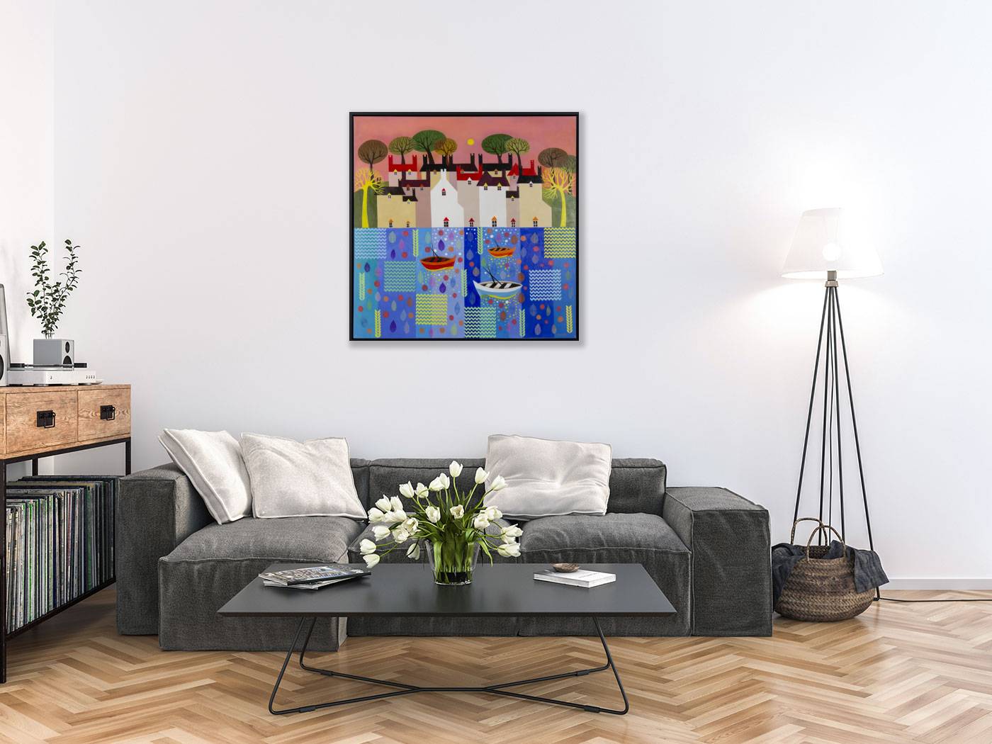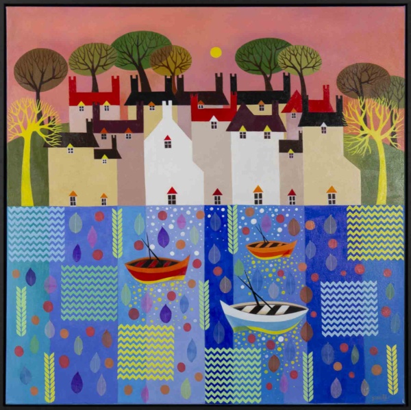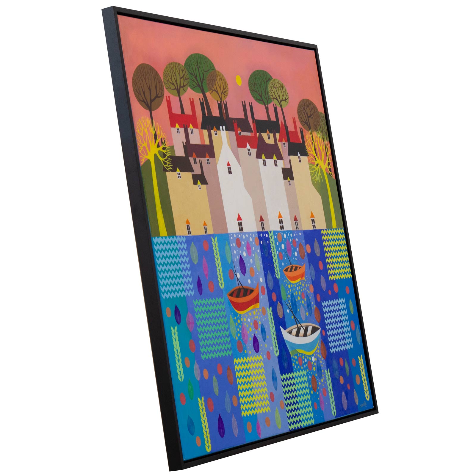 A stunning statement painting by Indian born artist Sunita Khedekar. Sunita invites us to enjoy her magical world in this semi abstracted naïve style painting. Presented framed in contemporary black tray frame and ready to hang.