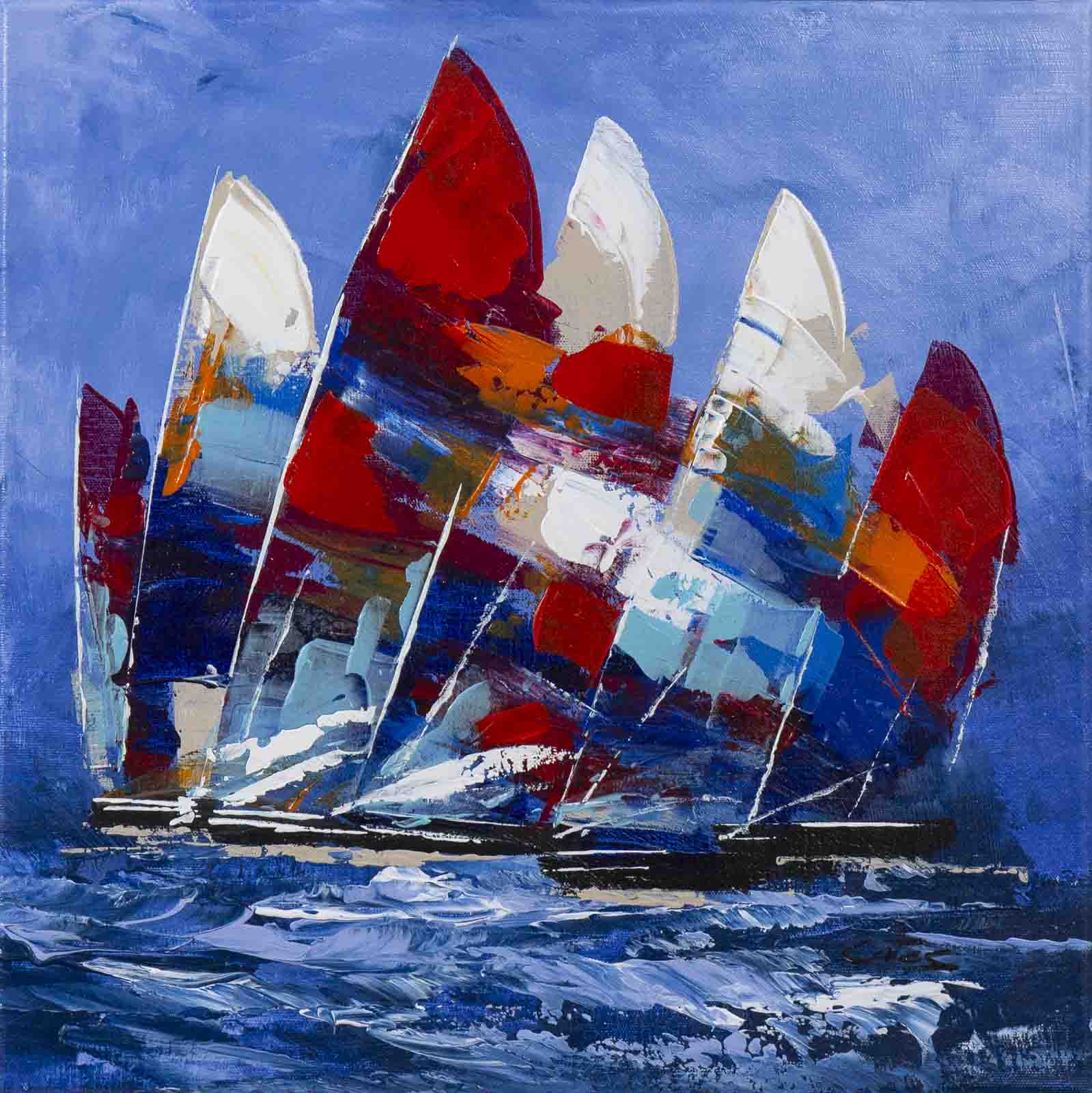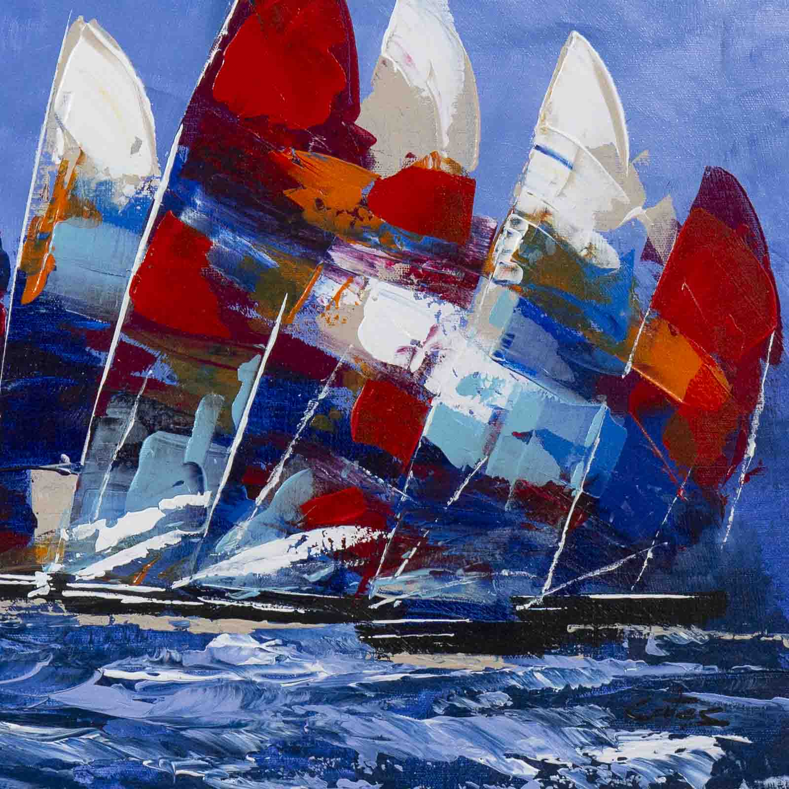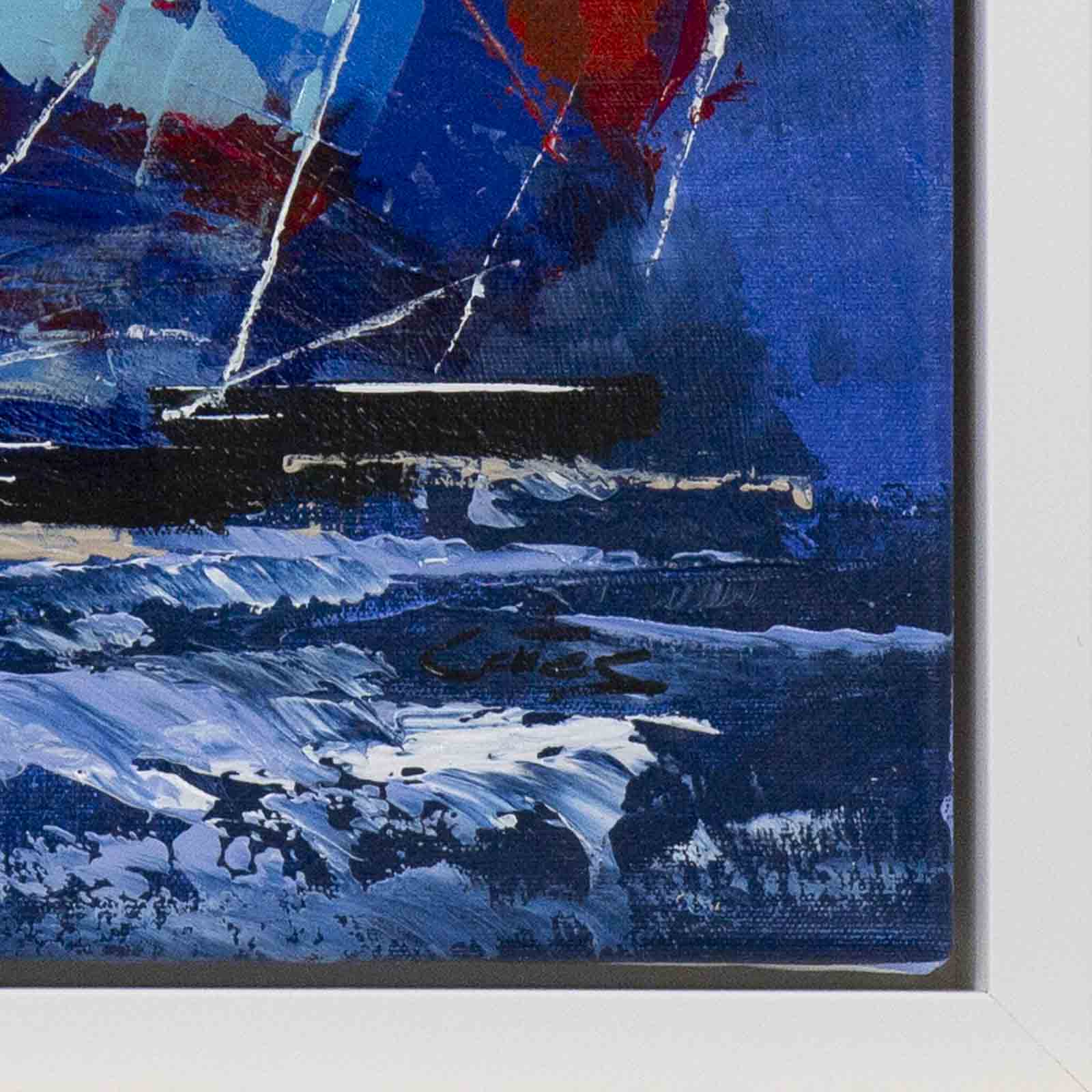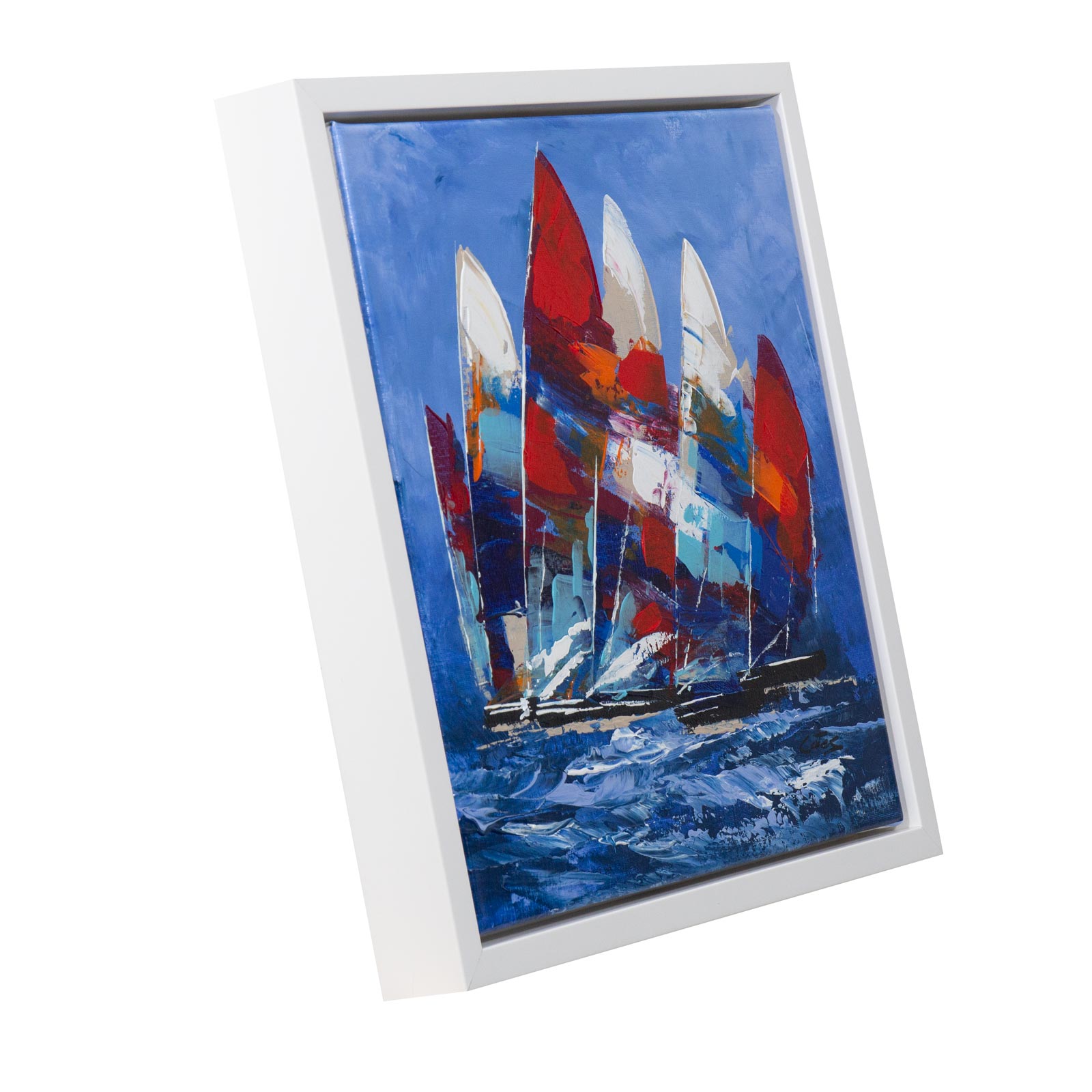 Dynamic original painting by the artist Cortes featuring striking colourful sail boats. Framed in a contemporary white floating frame as shown and ready to hang.