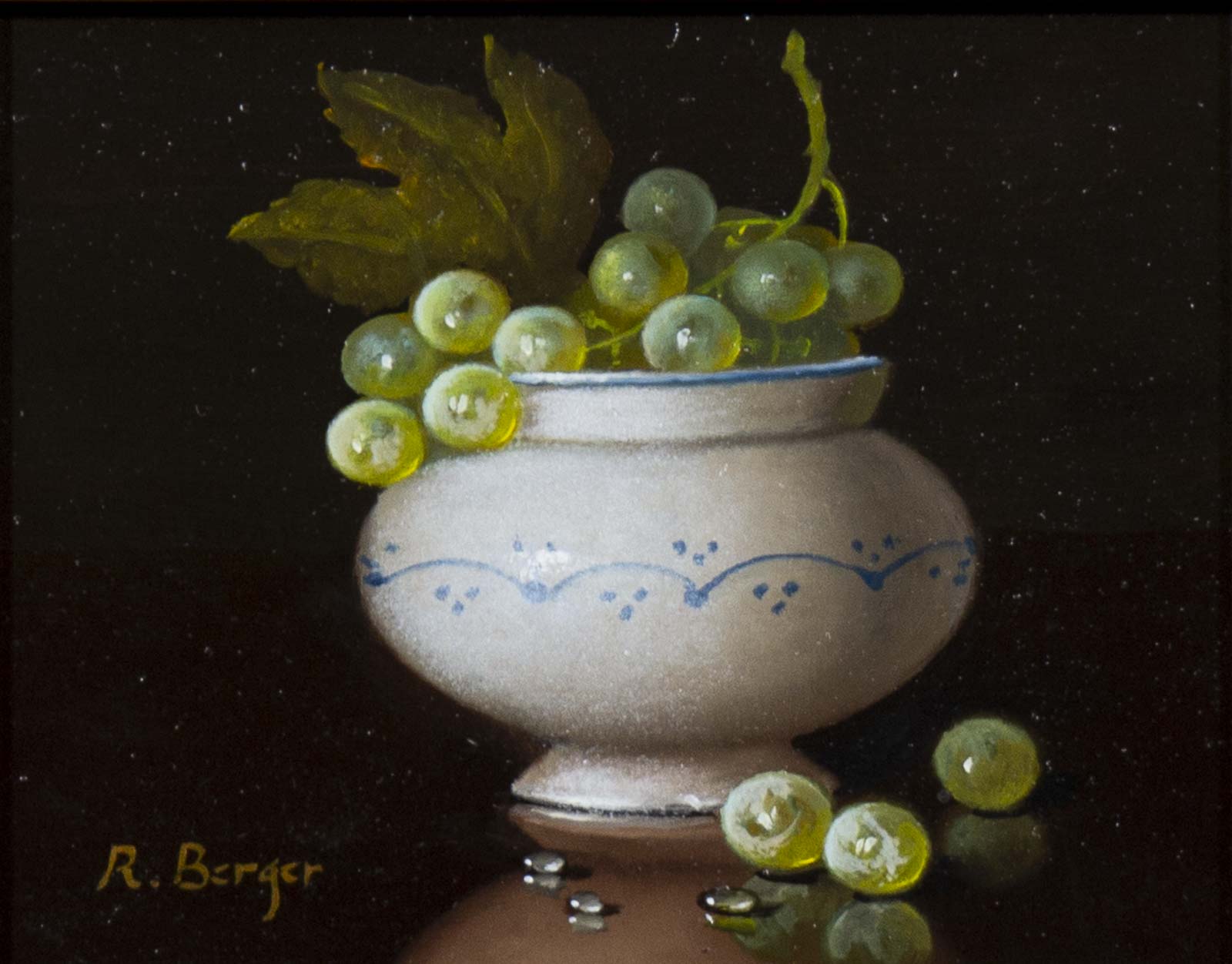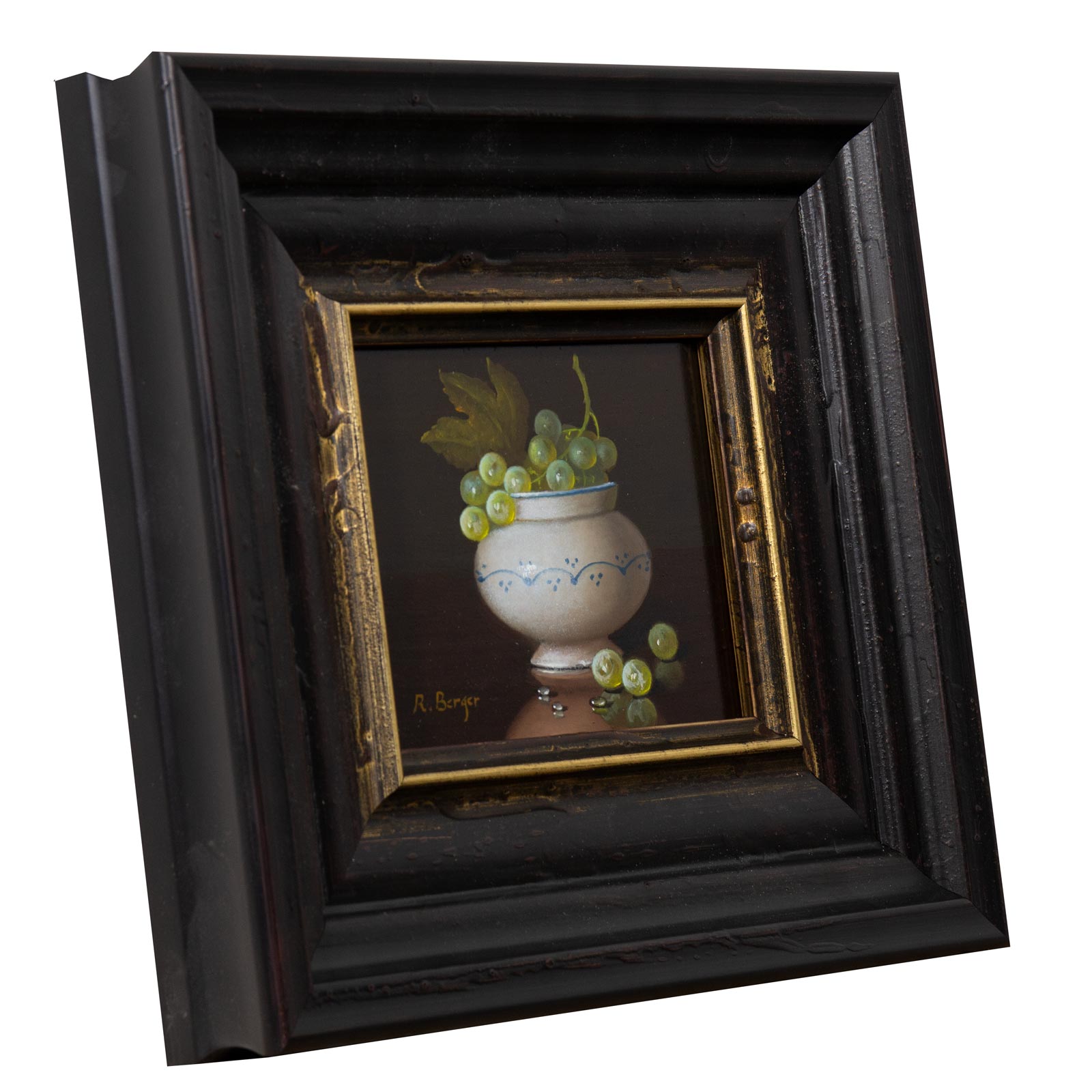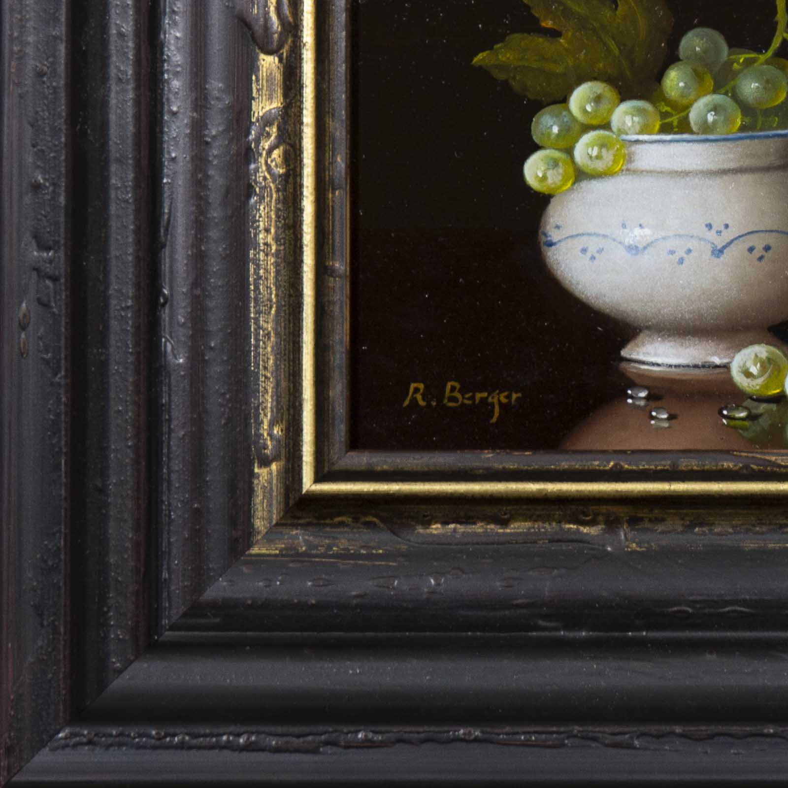 Beautiful still life oil painting of fruit contrasted against a dark background by Ronald Berger. Presented in a bespoke dark wood frame with gold detailing as pictured.