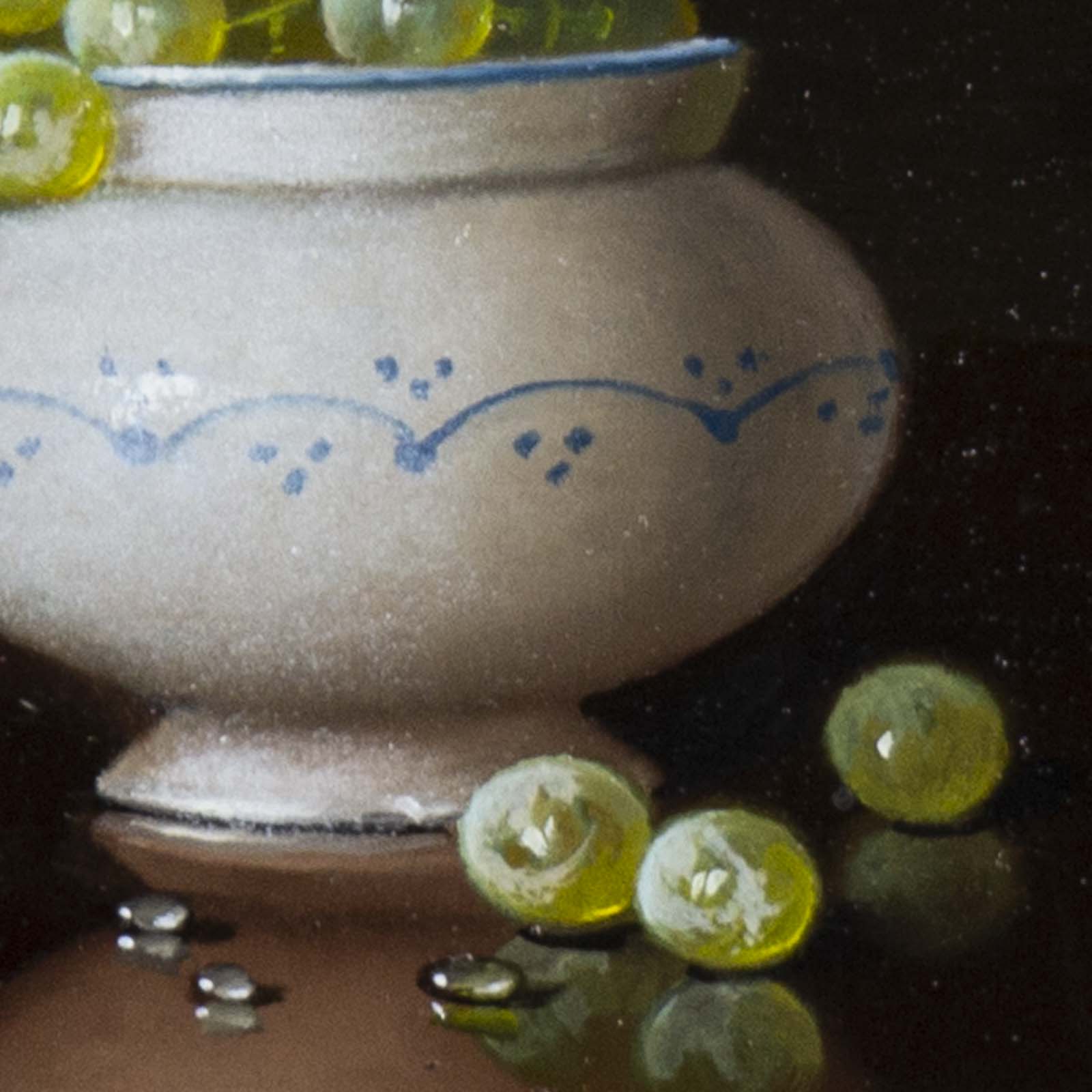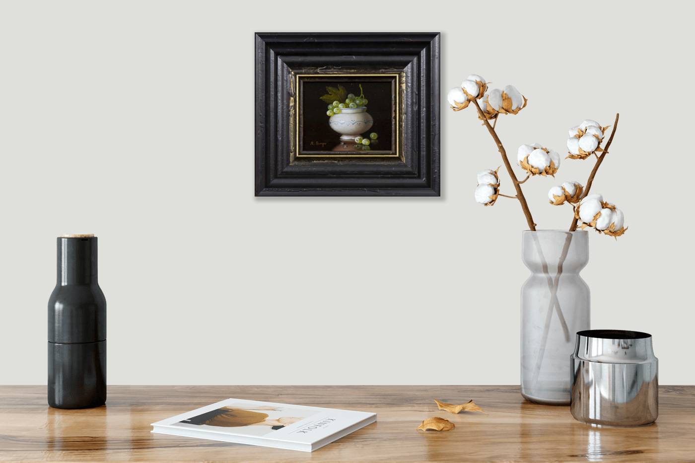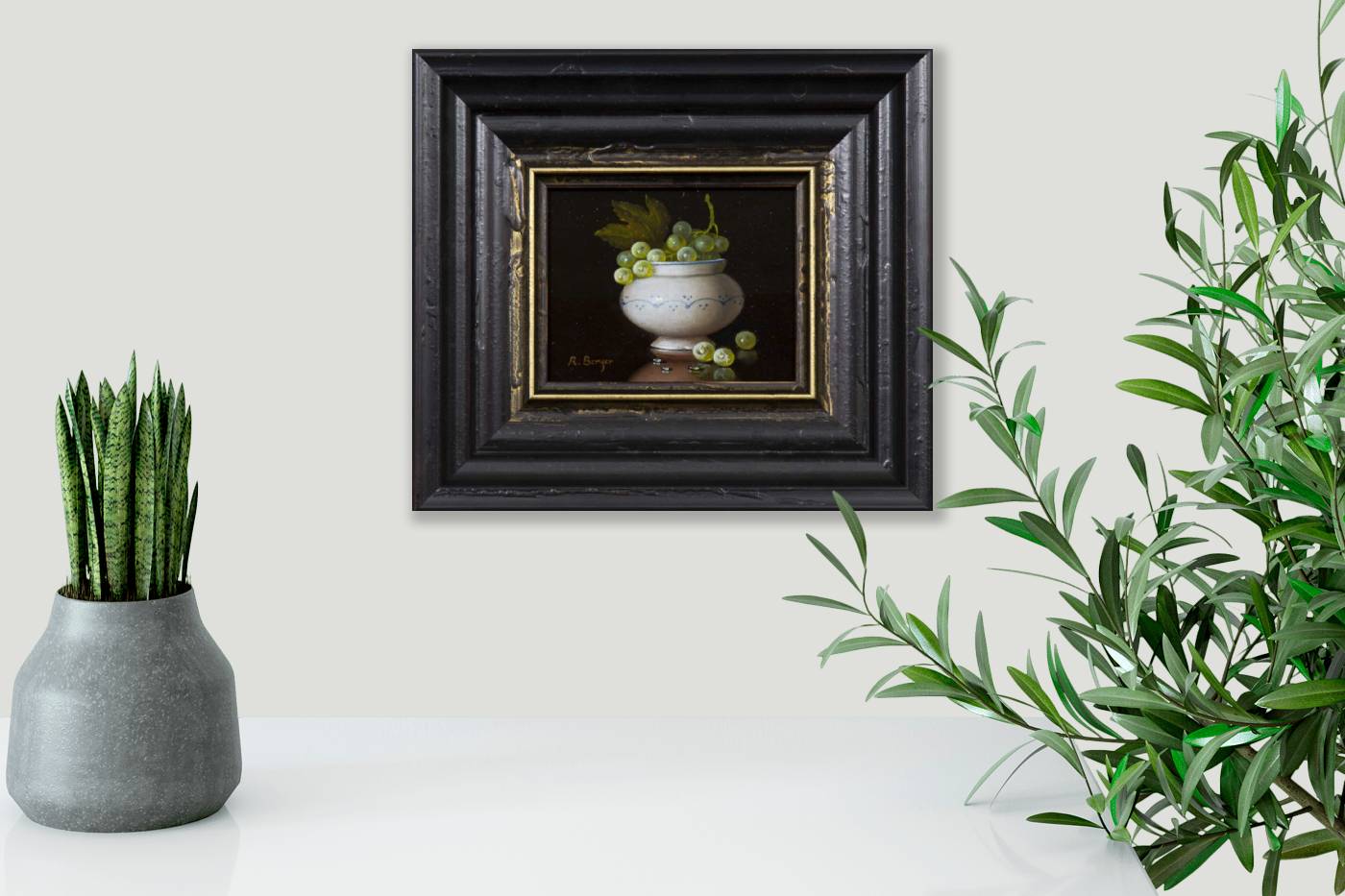 Beautiful still life oil painting of fruit contrasted against a dark background by Ronald Berger. Presented in a bespoke dark wood frame with gold detailing as pictured.
