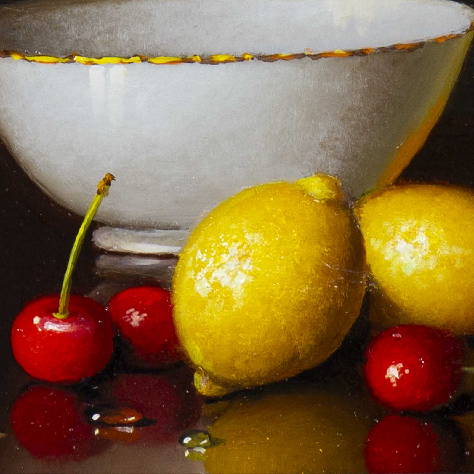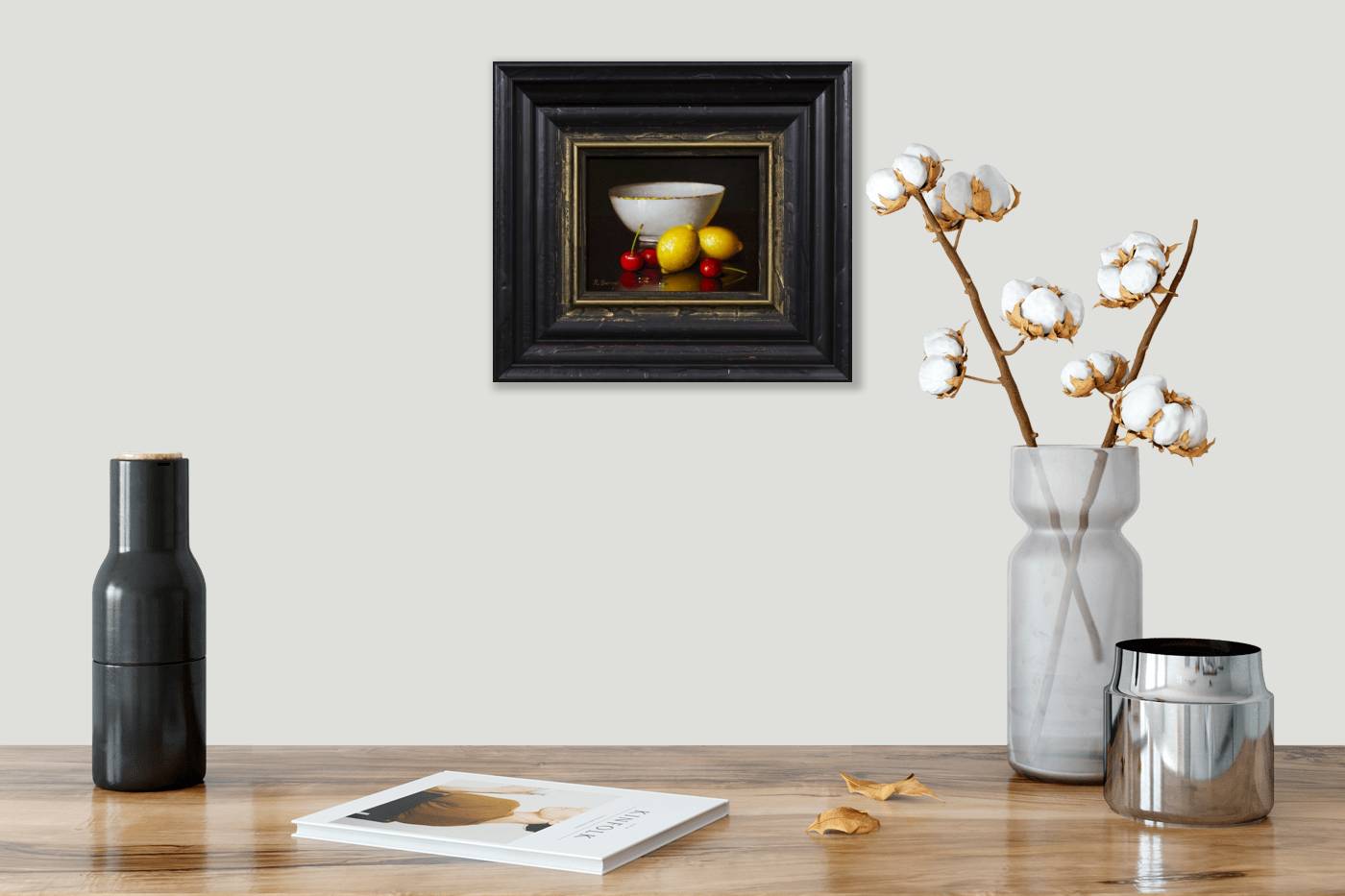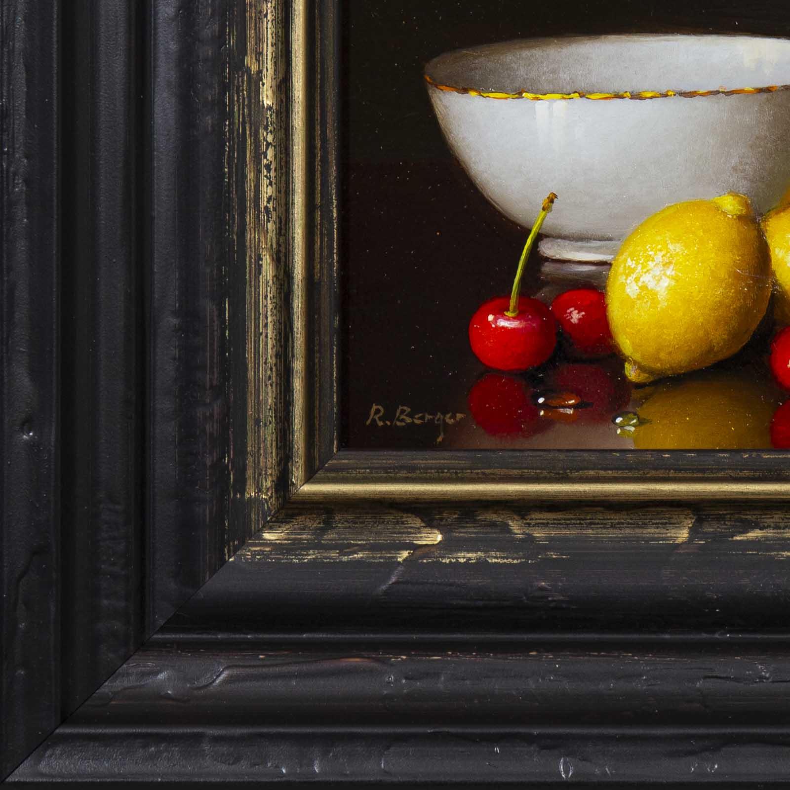 Beautiful still life oil painting of fruit contrasted against a dark background by Ronald Berger. Presented in a bespoke dark wood frame with gold detailing as pictured.