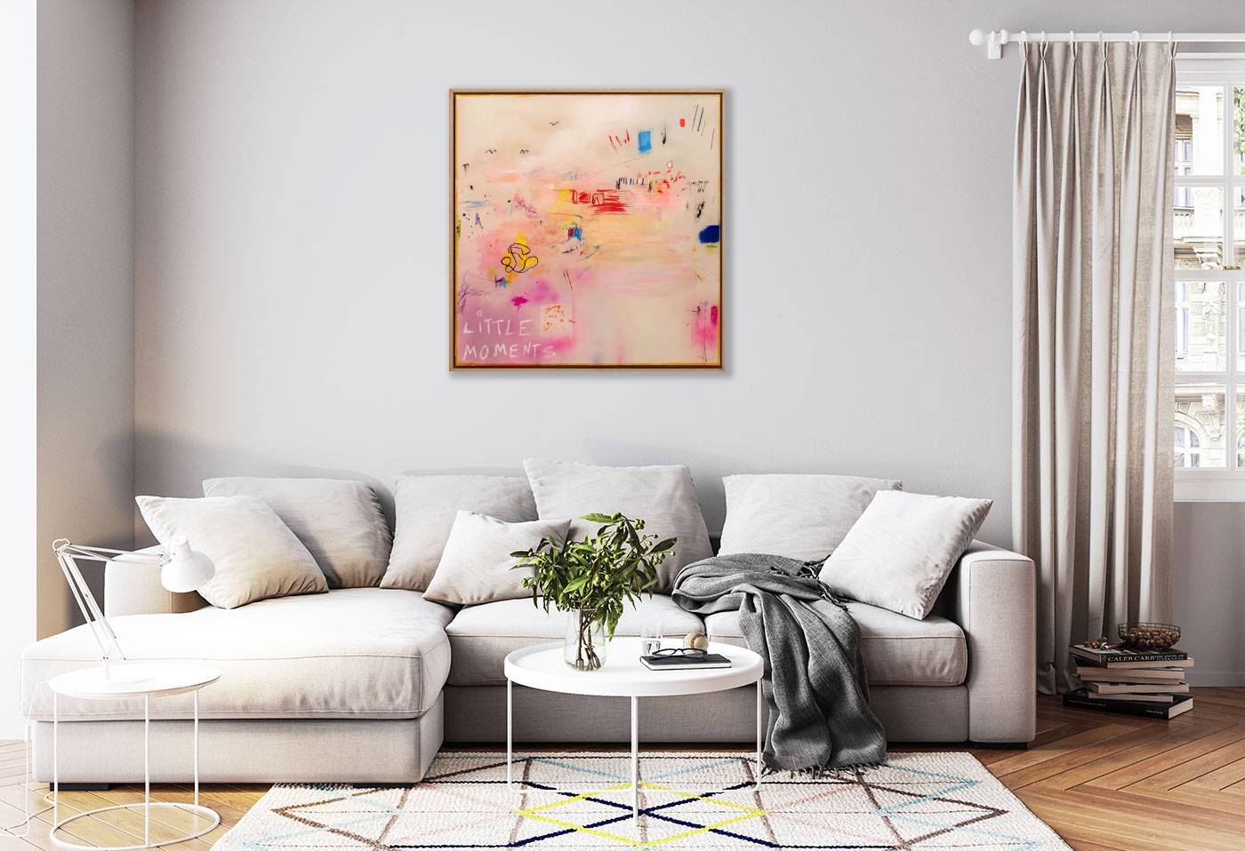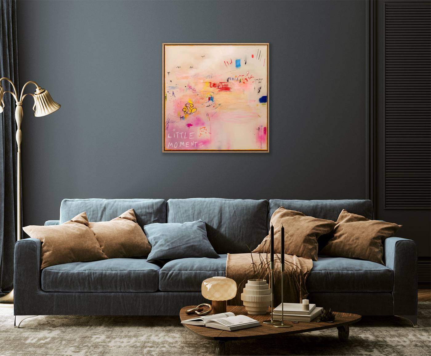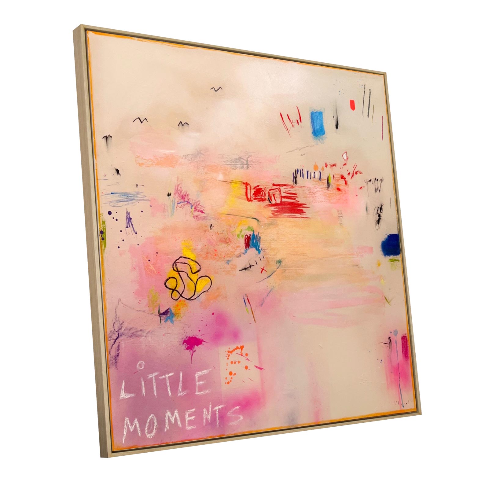 Playful abstract painting by Spanish artist Manel employing mixed techniques that combine various materials: acrylics, oils, charcoal, ink, and natural pigments, applied in subtle layers to play with textures and transparencies. Presented in a stylish contemporary oak frame as shown and ready to hang.