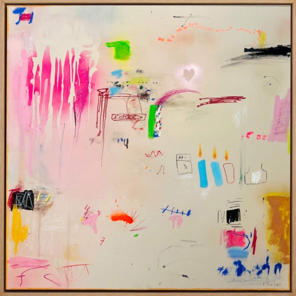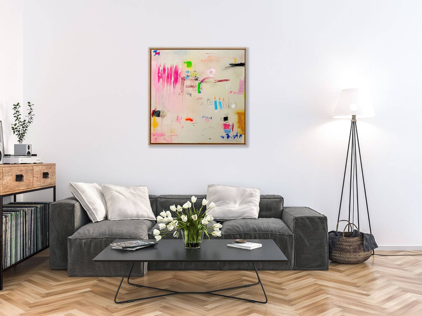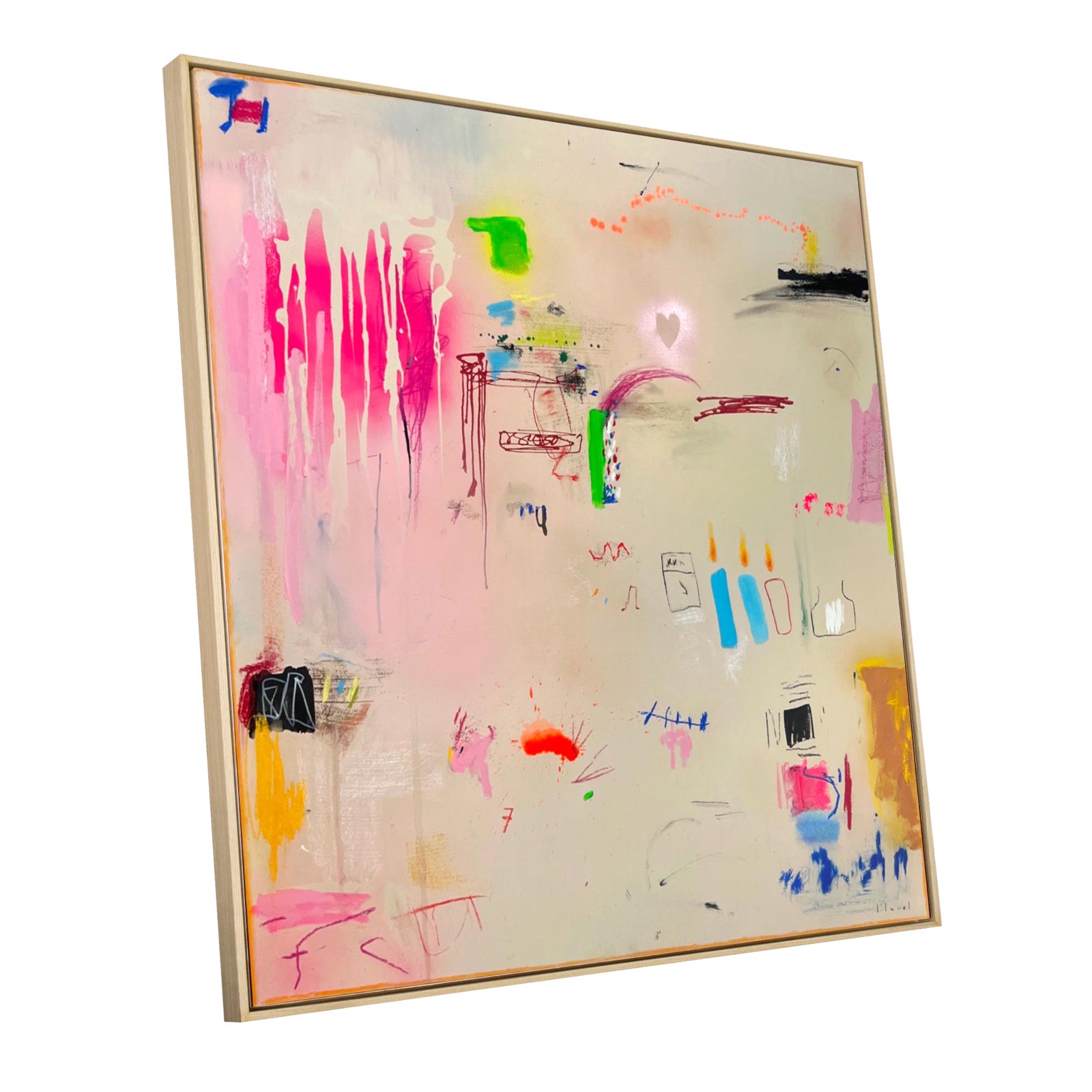 Playful abstract painting by Spanish artist Manel employing mixed techniques that combine various materials: acrylics, oils, charcoal, ink, and natural pigments, applied in subtle layers to play with textures and transparencies. Presented in a stylish contemporary oak frame as shown and ready to hang.