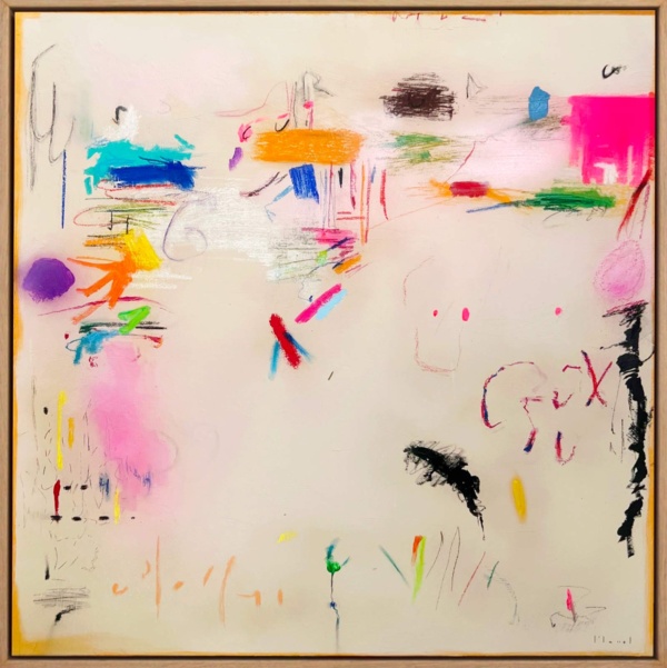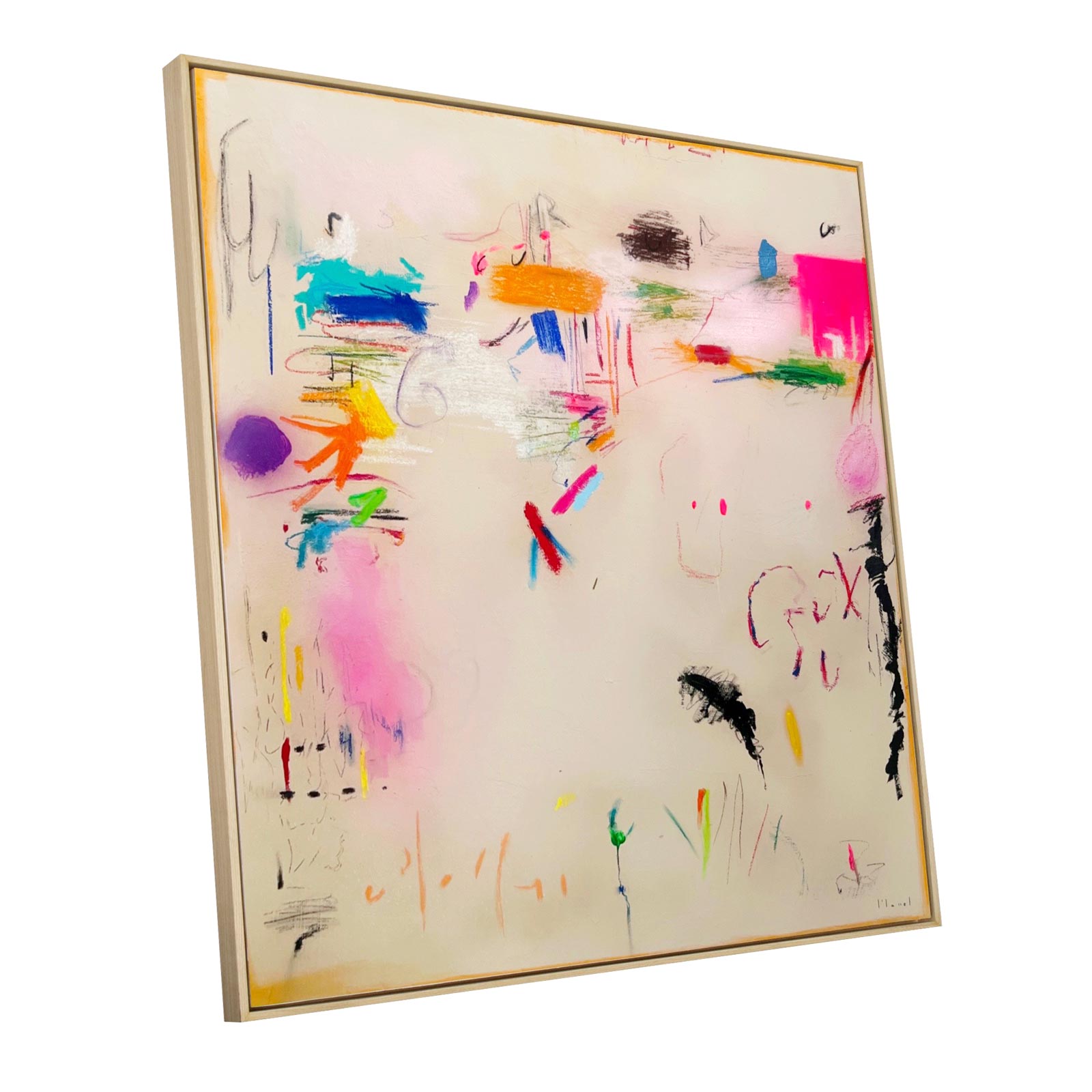 Playful abstract painting by Spanish artist Manel employing mixed techniques that combine various materials: acrylics, oils, charcoal, ink, and natural pigments, applied in subtle layers to play with textures and transparencies. Presented in a stylish contemporary oak frame as shown and ready to hang.