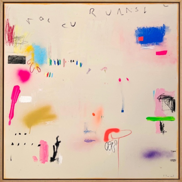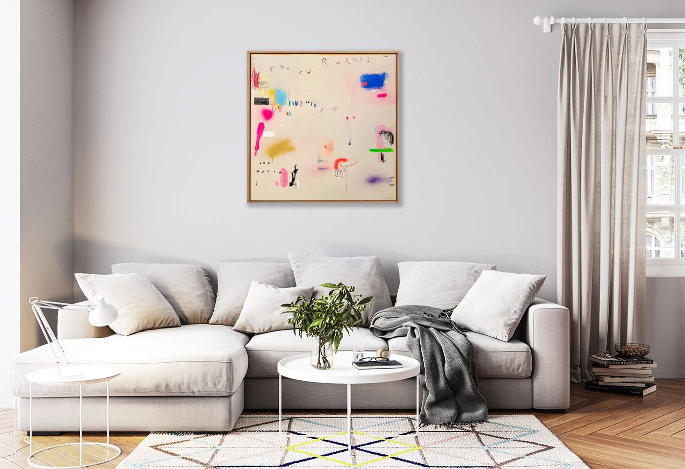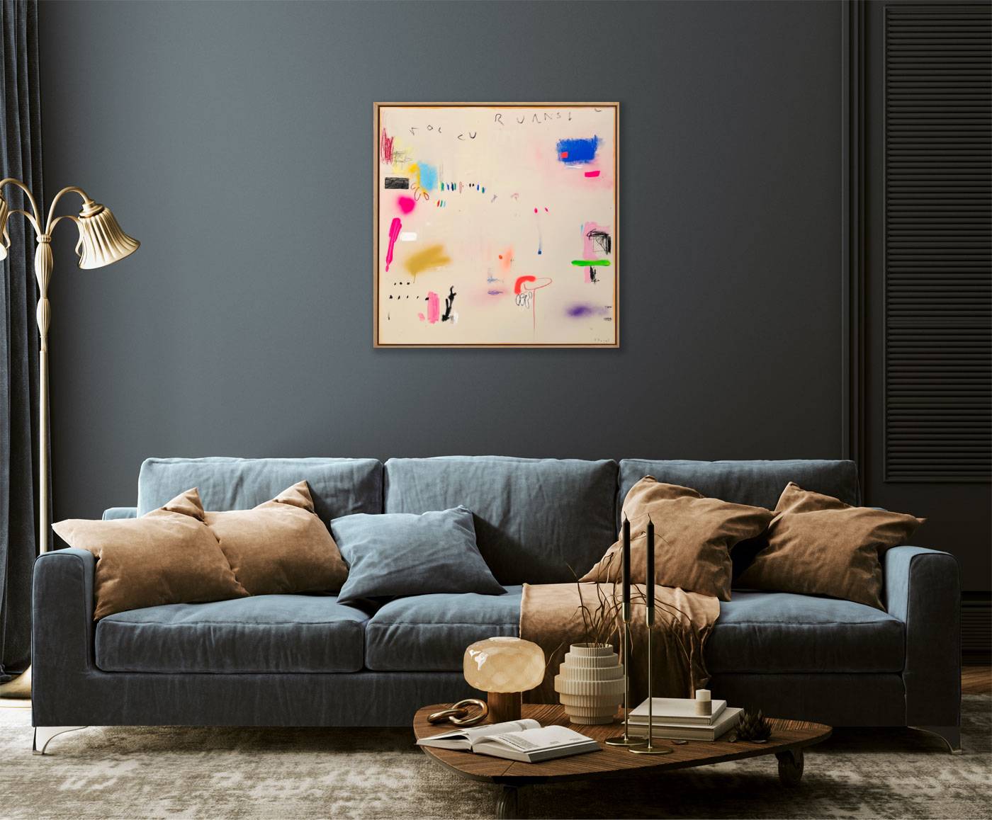 Playful abstract painting by Spanish artist Manel employing mixed techniques that combine various materials: acrylics, oils, charcoal, ink, and natural pigments, applied in subtle layers to play with textures and transparencies. Presented in a stylish contemporary oak frame as shown and ready to hang.
