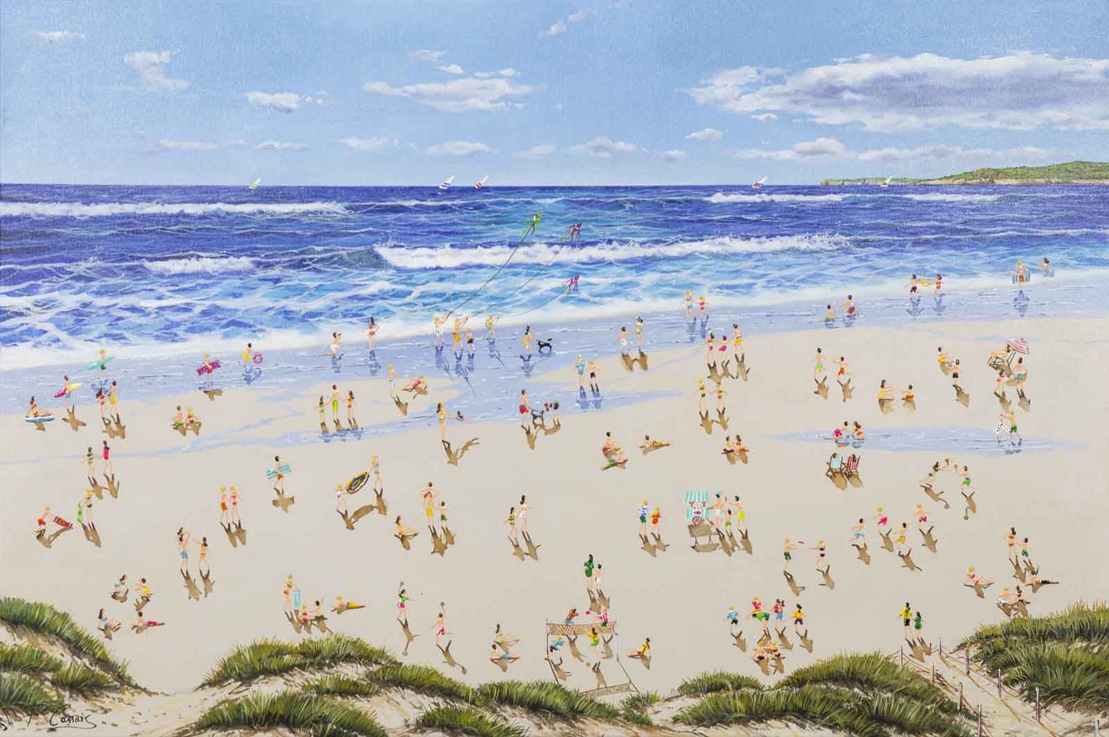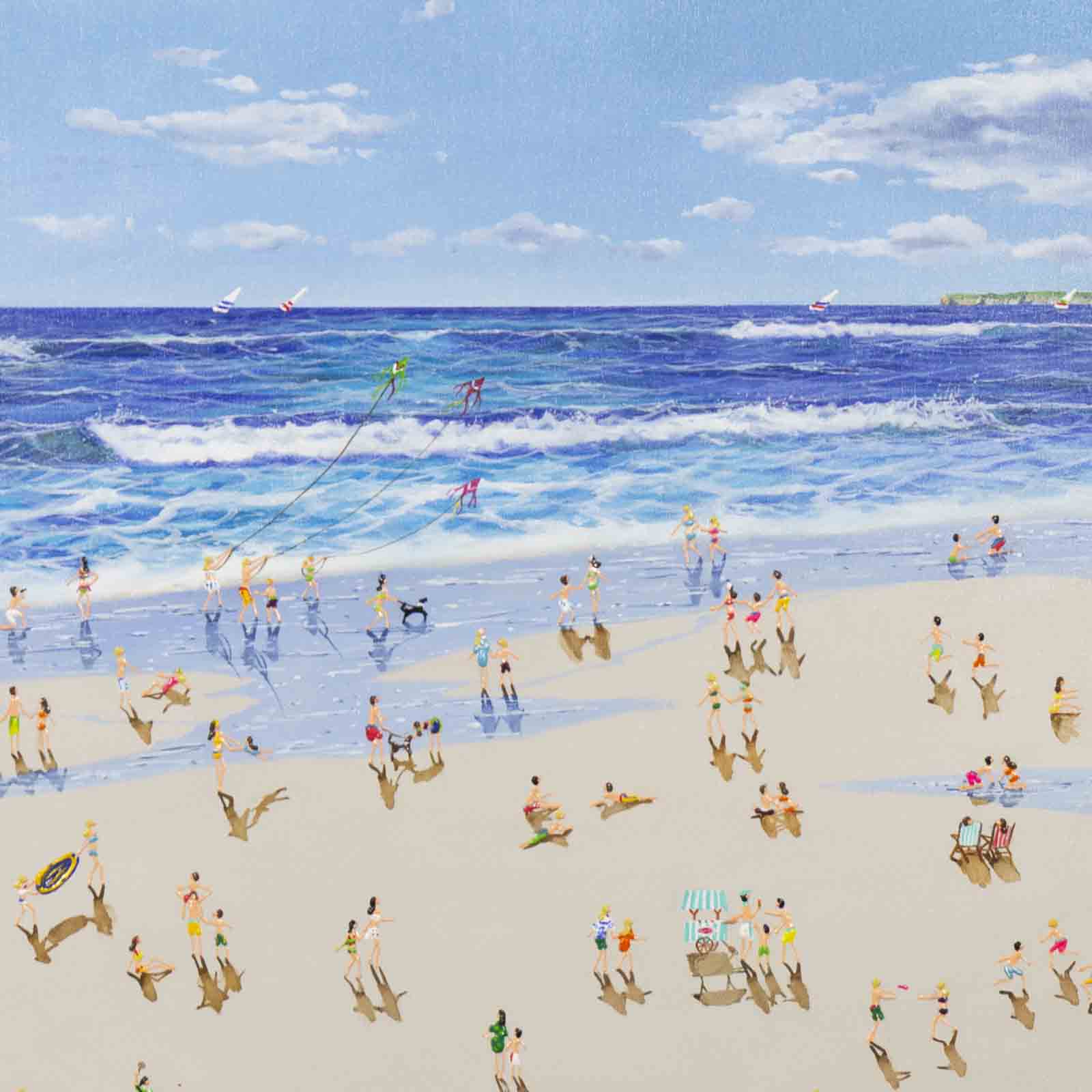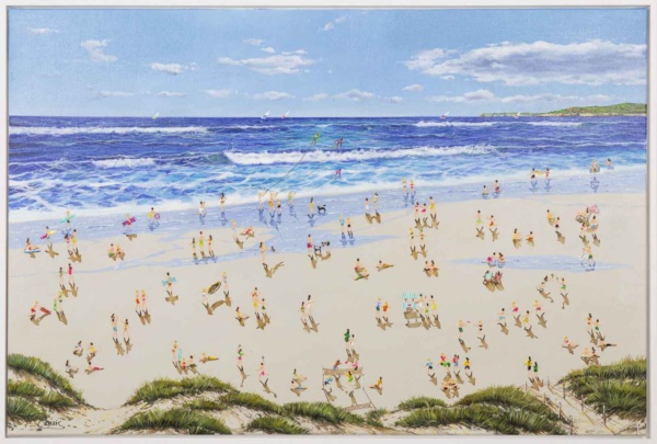 A stunning large original painting by Paola Cassais featuring the artist’s joyful little people along the beach. The piece is three-dimensional with thick paint and is presented in contemporary white frame as shown and ready to hang.