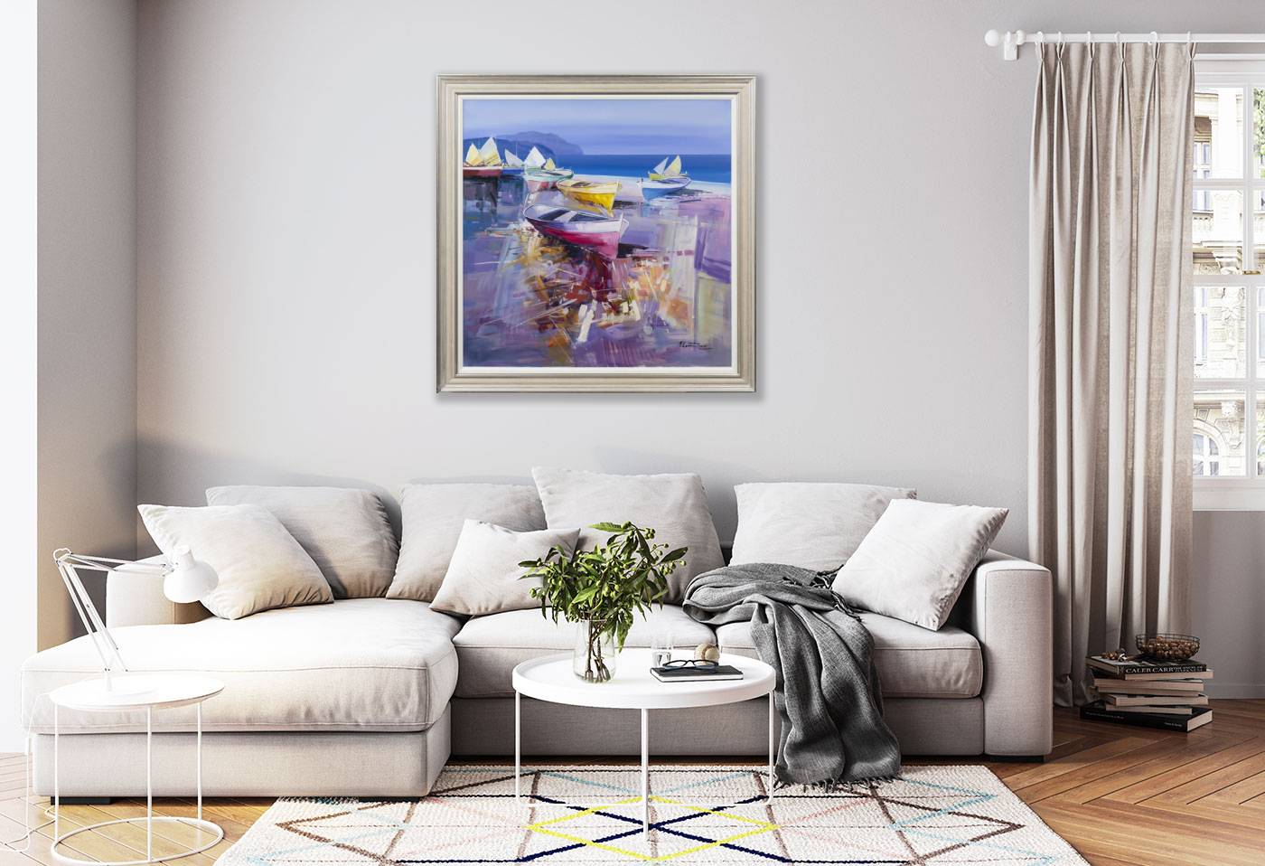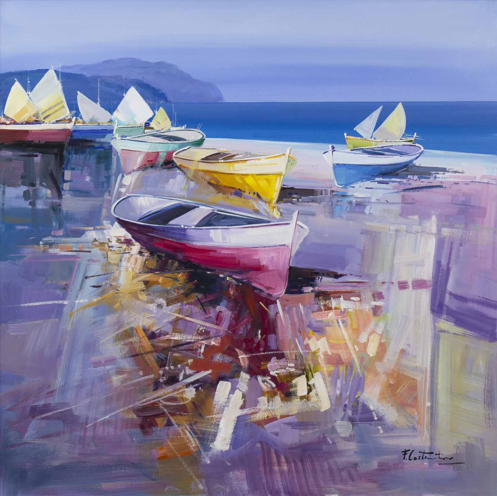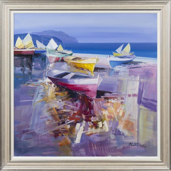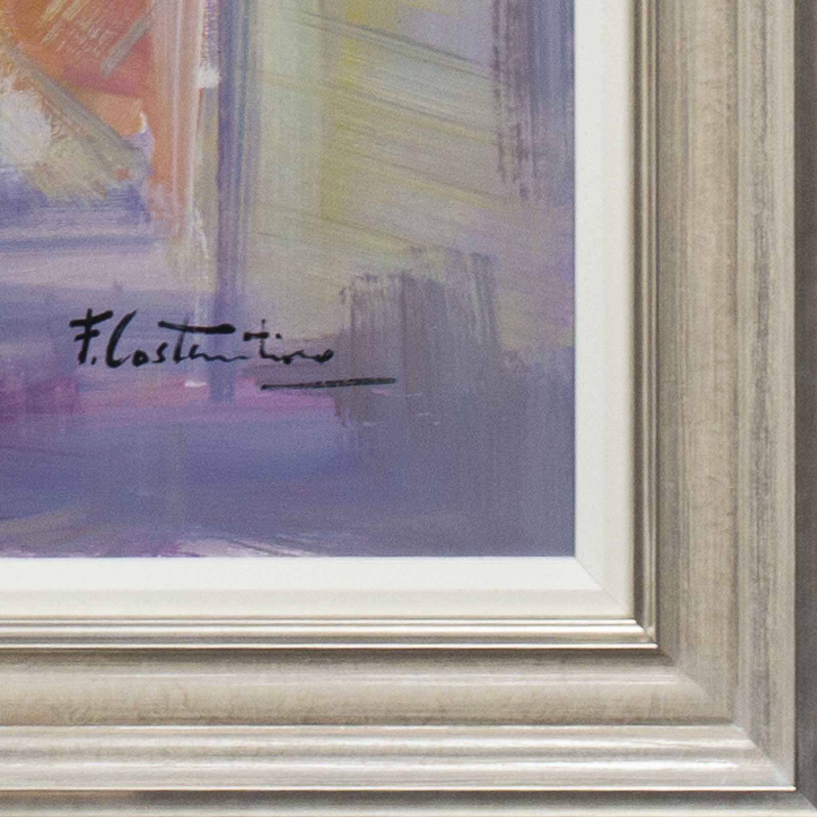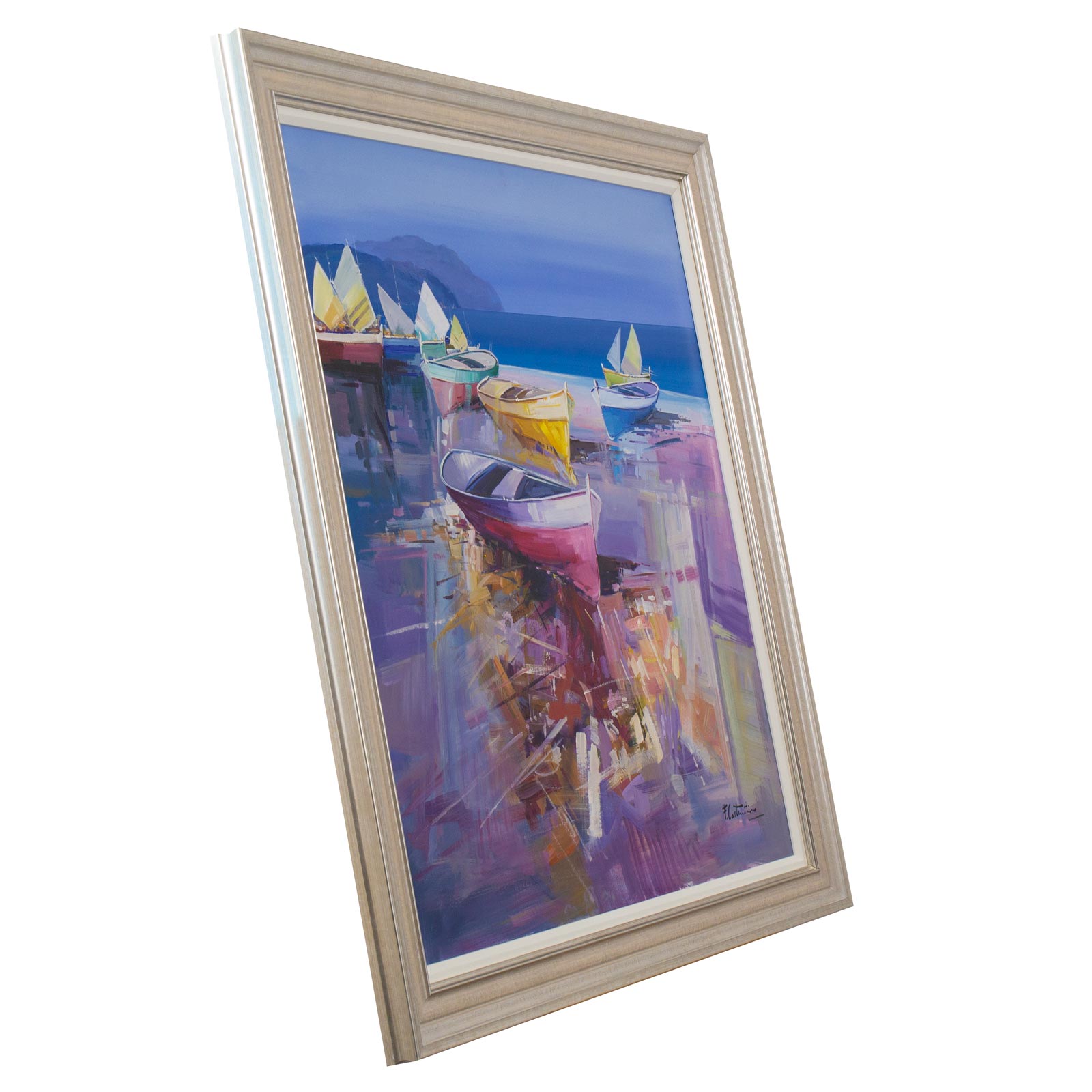 Fabio Constantino is an Italian painter celebrated for his luminous seascapes and atmospheric coastal scenes. This large original painting utilises a beautiful soft palette which the artist is known for. Presented in silver/cream moulding with white slip as shown and ready to hang.