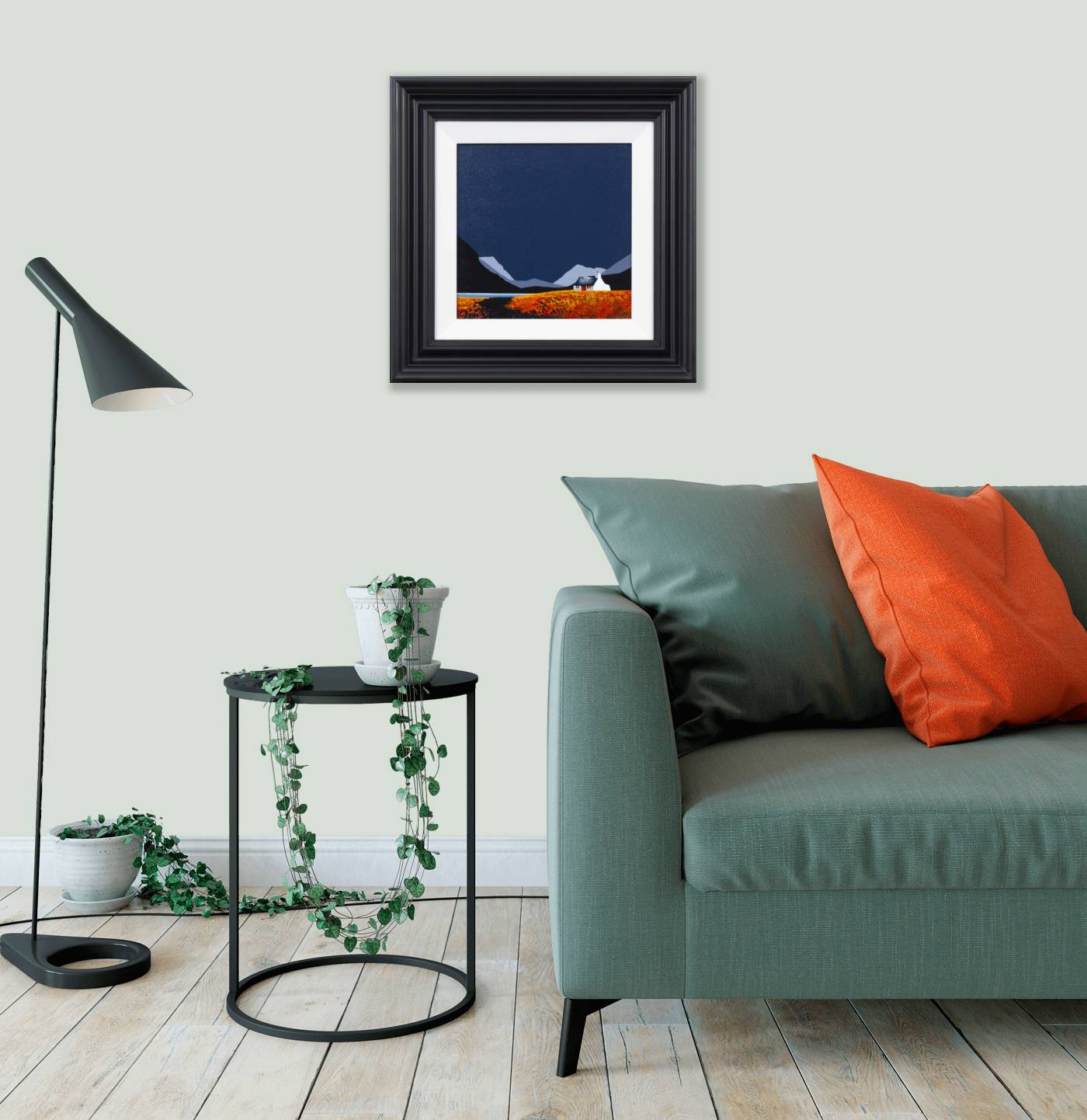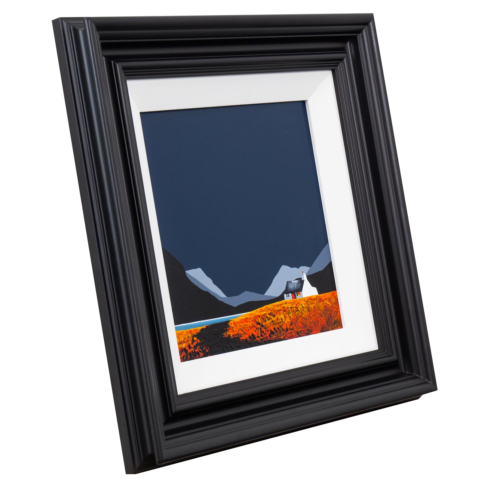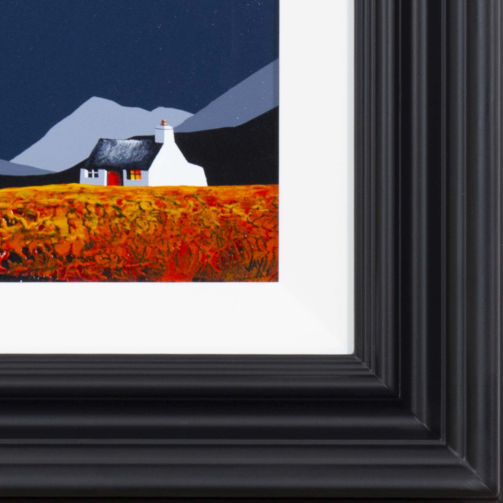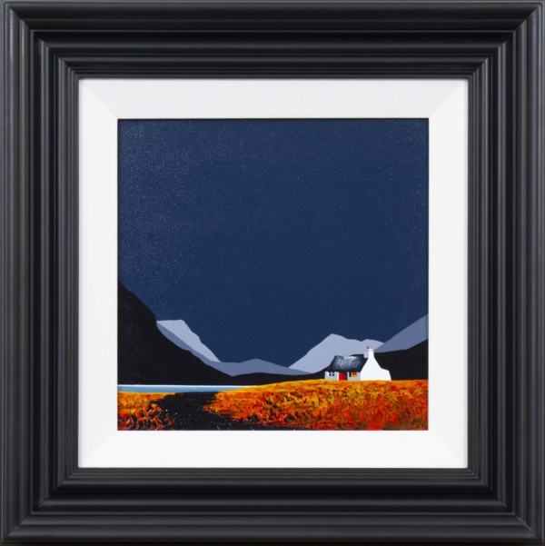 A lovely little original painting by Jay Nottingham with a textured foreground against a striking dark sky, completed by his signature cottage. Framed with a white slip and matt black frame as shown and ready to hang.