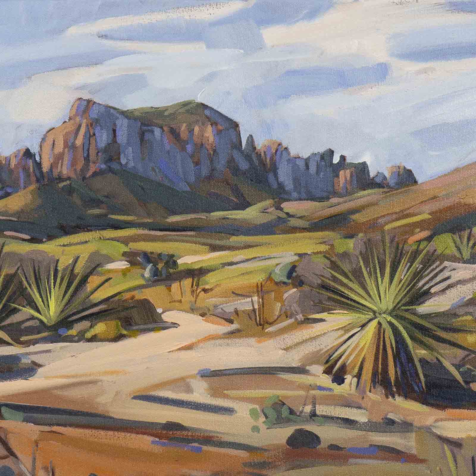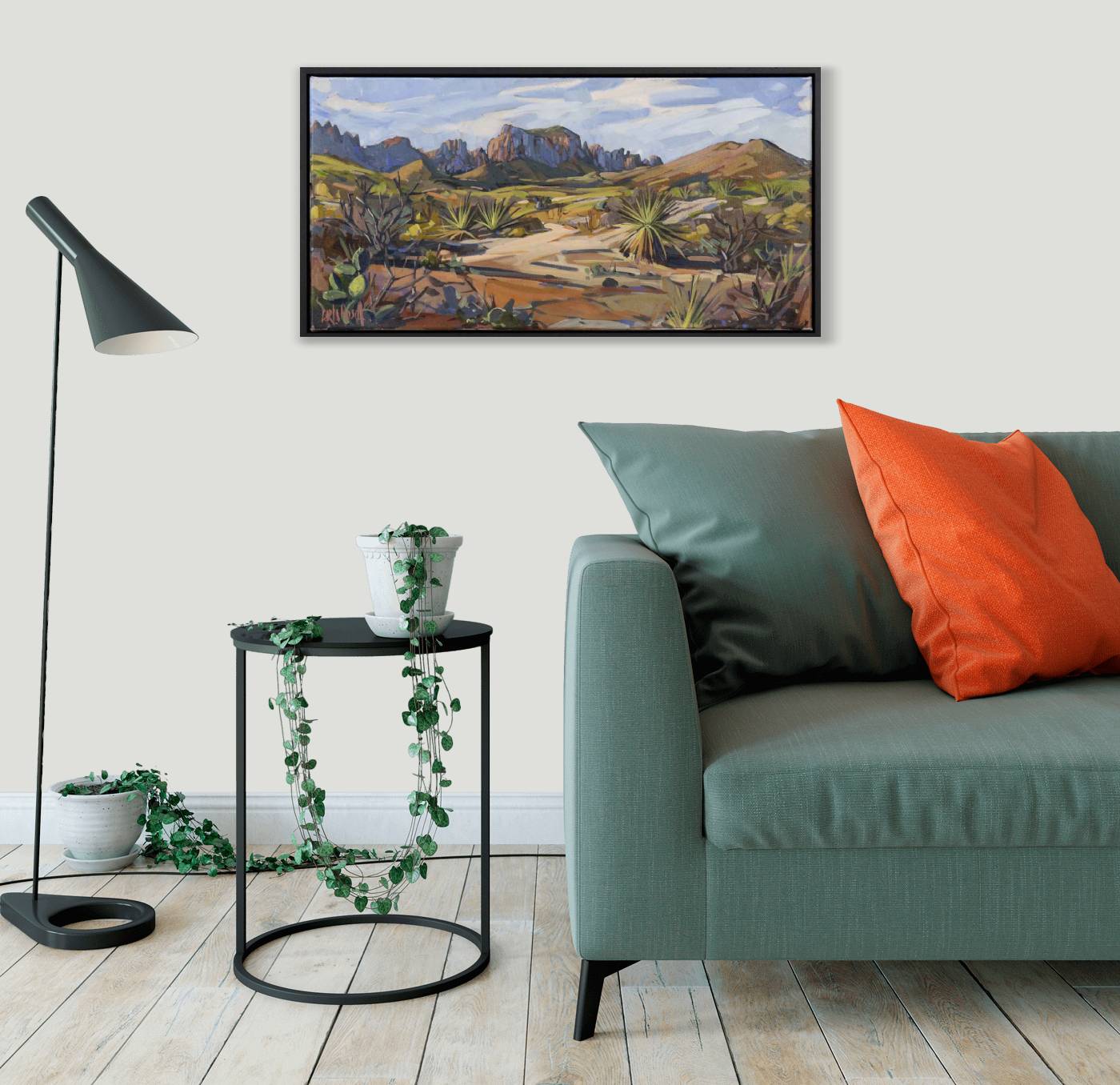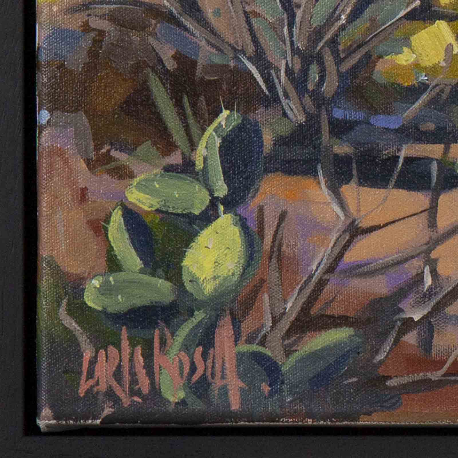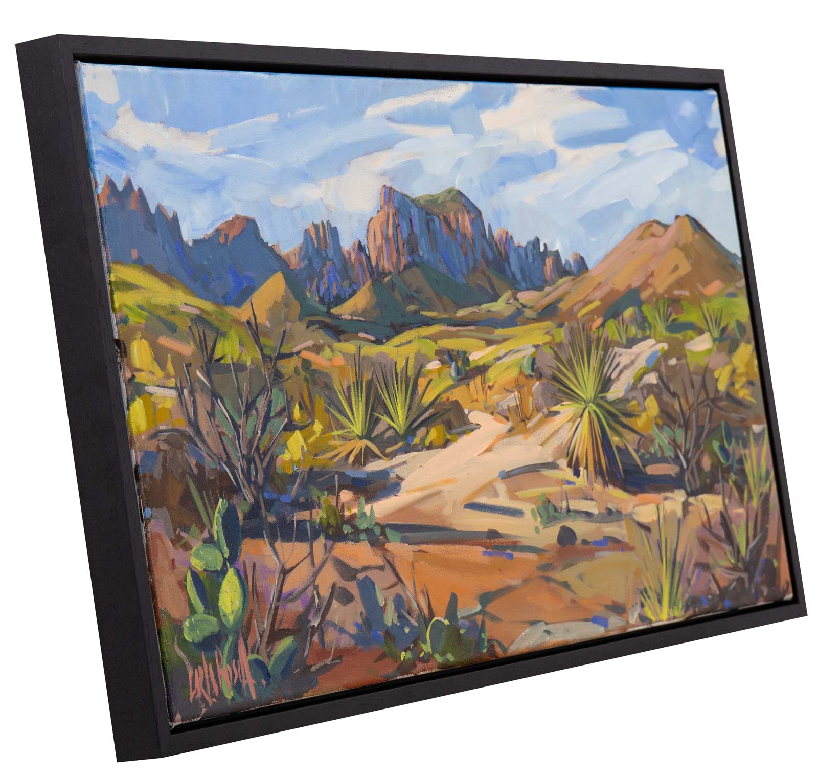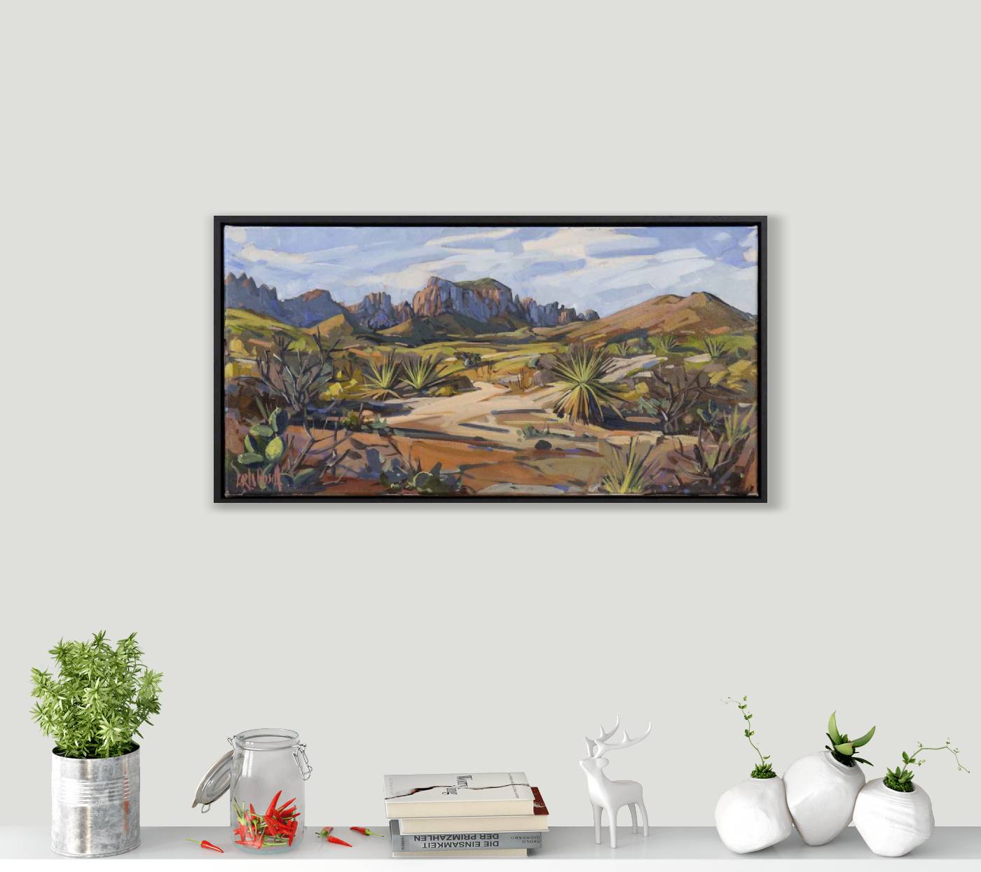 A stunning original painting captured in the artist’s signature painterly style. This painting is framed in a slim black open grain floating frame as shown and ready to hang.