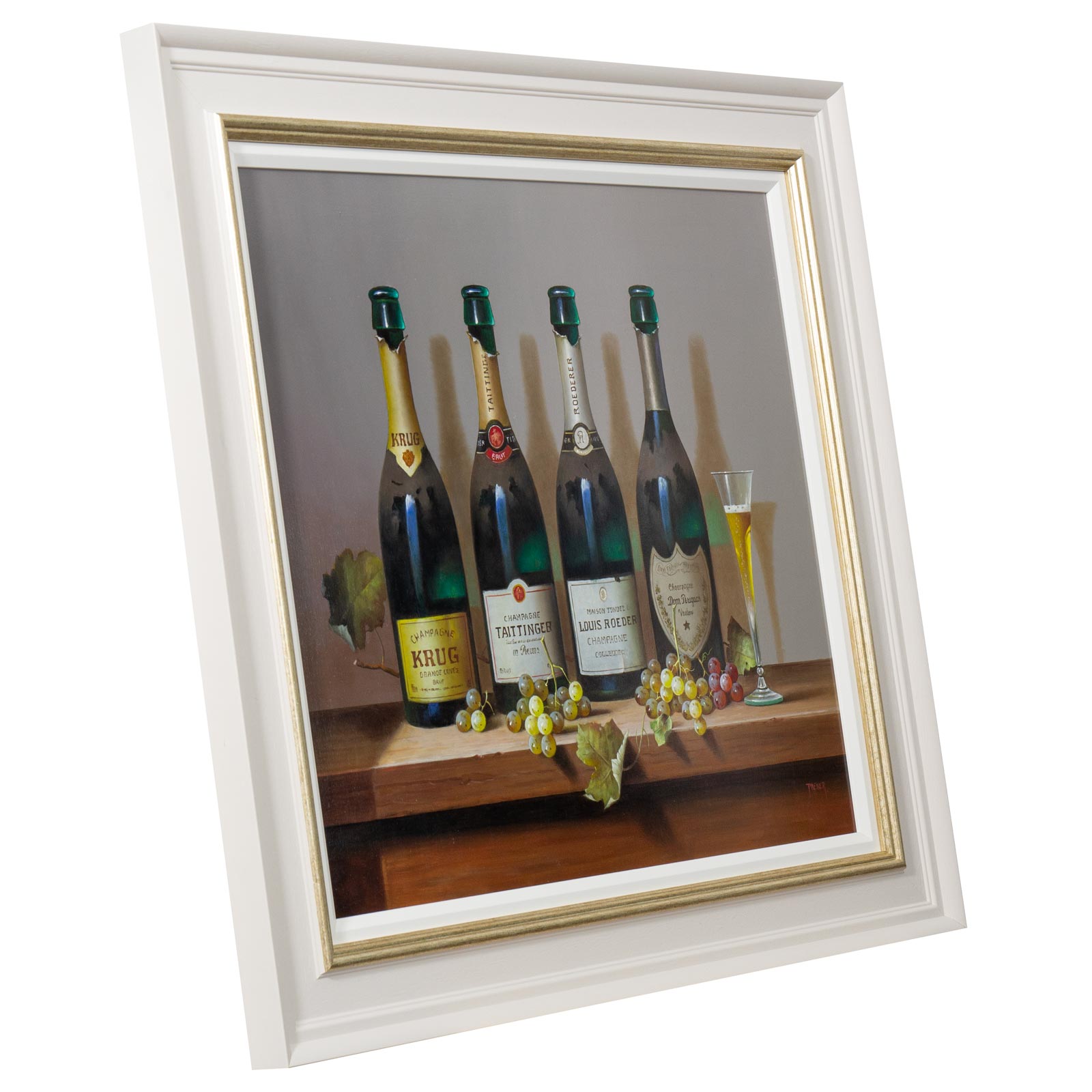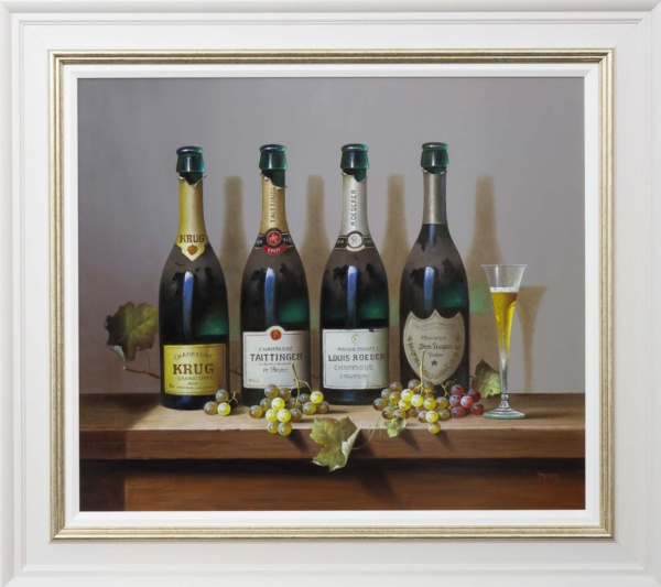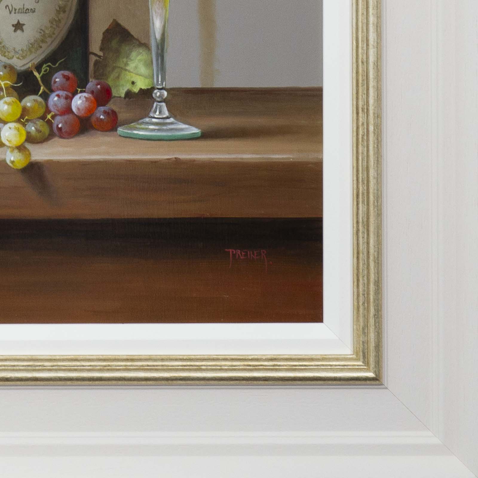 A large detailed still life painting by talented artist Zoltan Preiner. Framed with a painted frame with golden trim and white slip as shown and ready to hang.