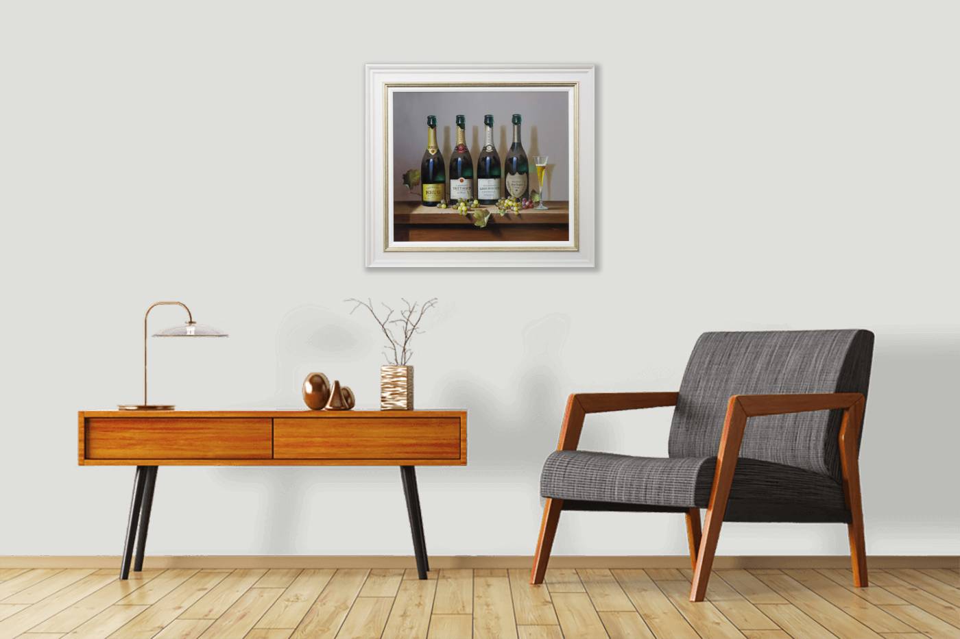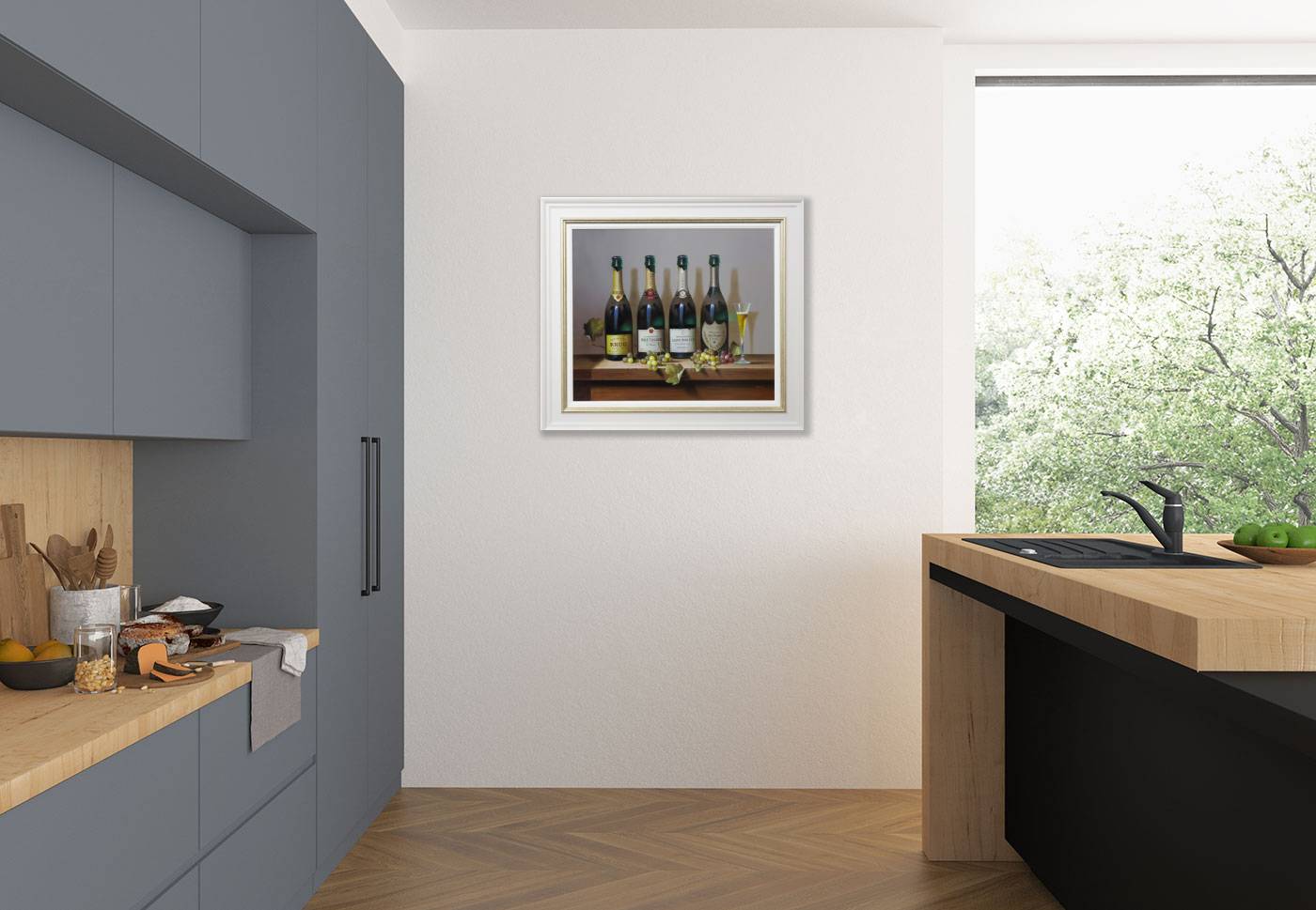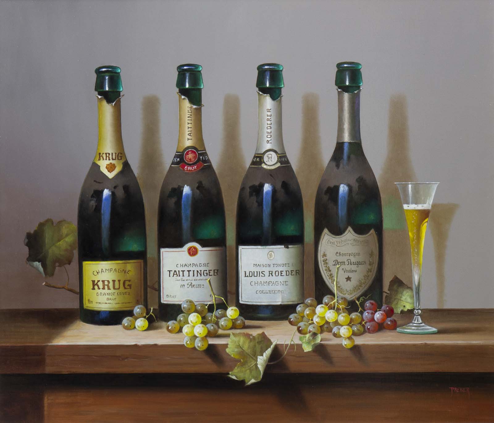 A large detailed still life painting by talented artist Zoltan Preiner. Framed with a painted frame with golden trim and white slip as shown and ready to hang.