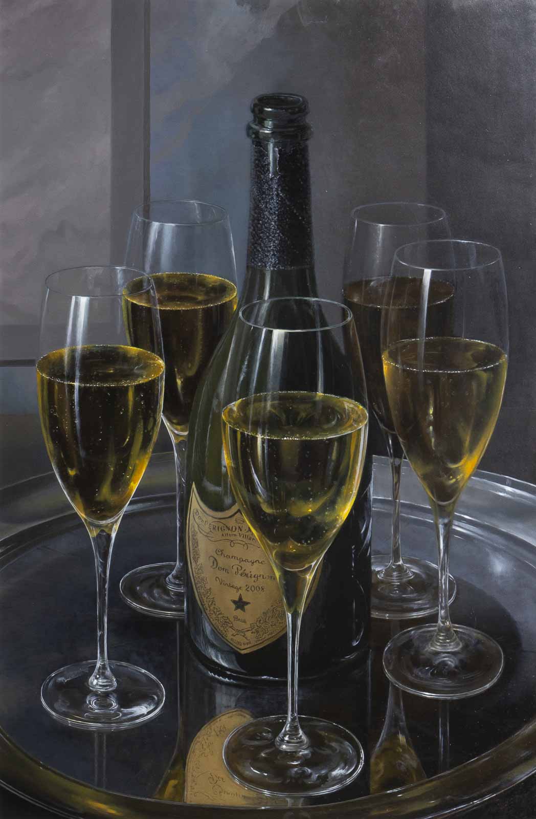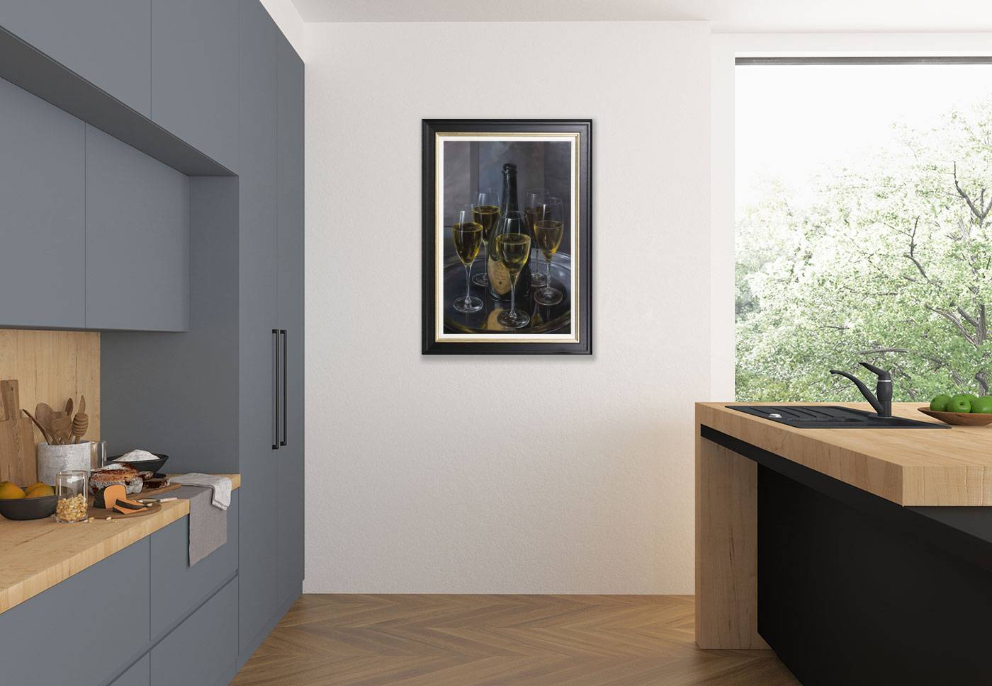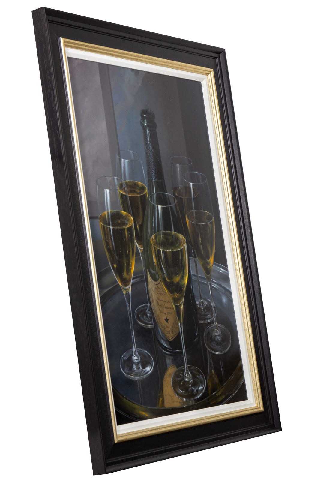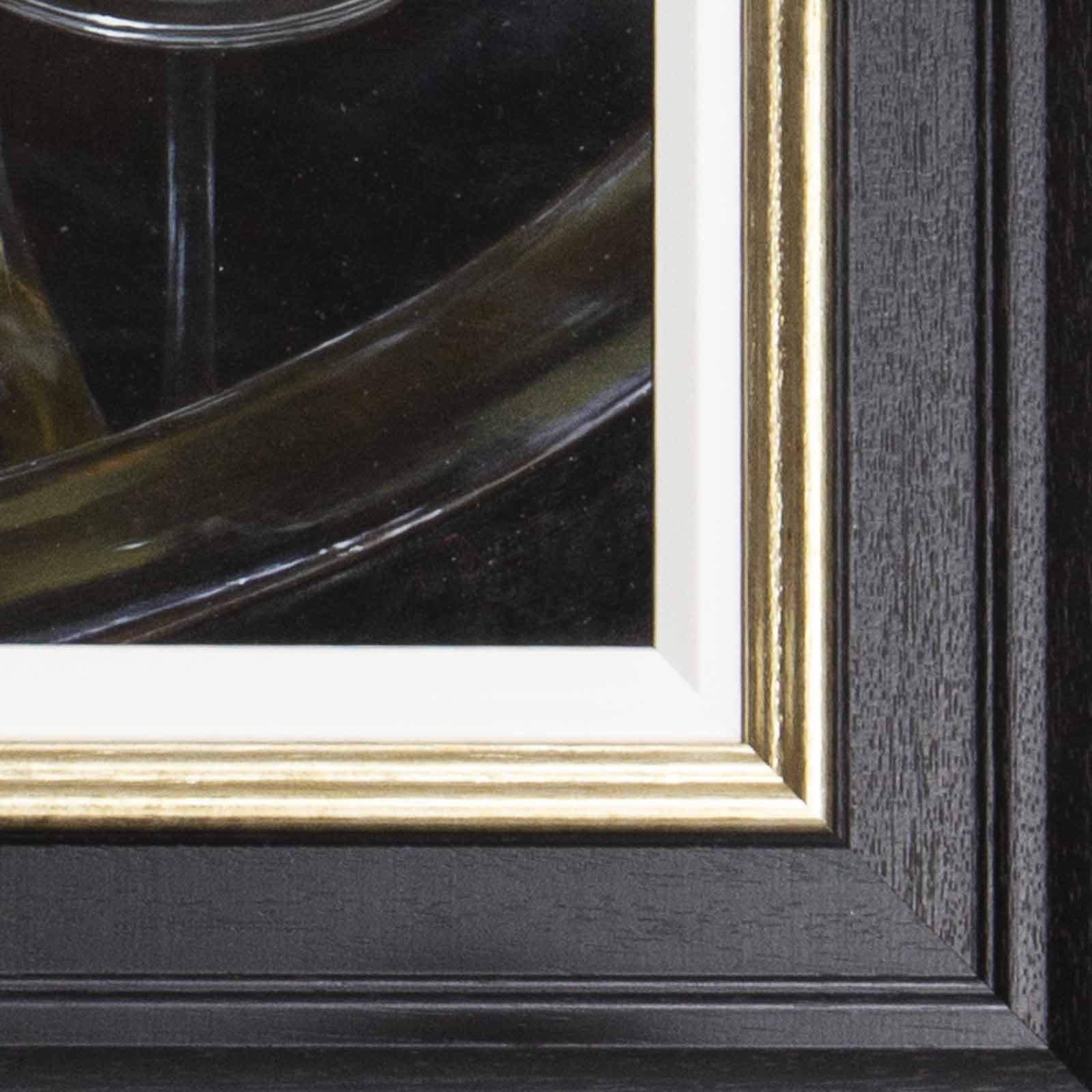 Stunning detailed still life painting by the talented artist Gyula Boros. This is an original painting painted in oil on panel. Framed as shown in black woodgrain moulding with gold detail, off-white slip and ready to hang.