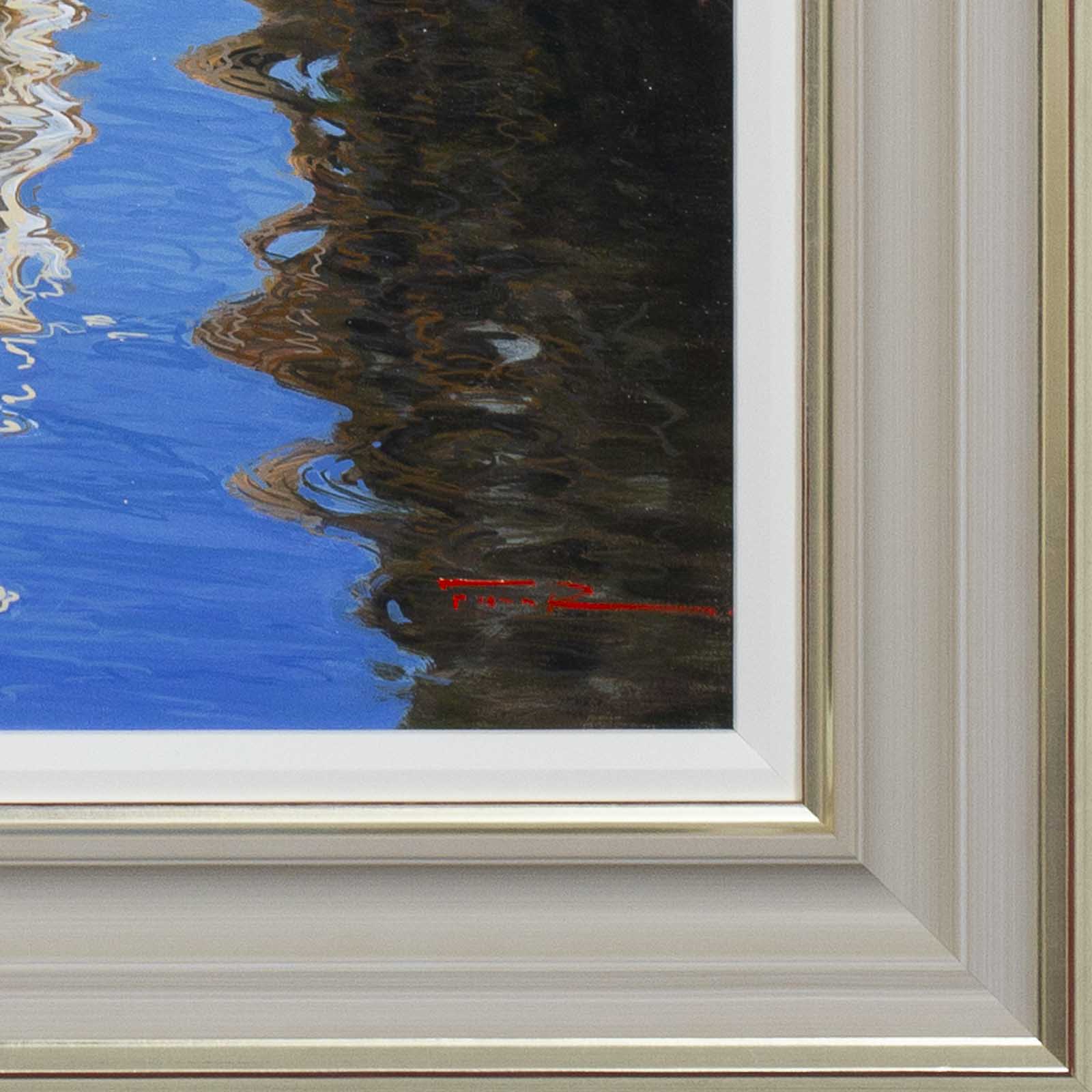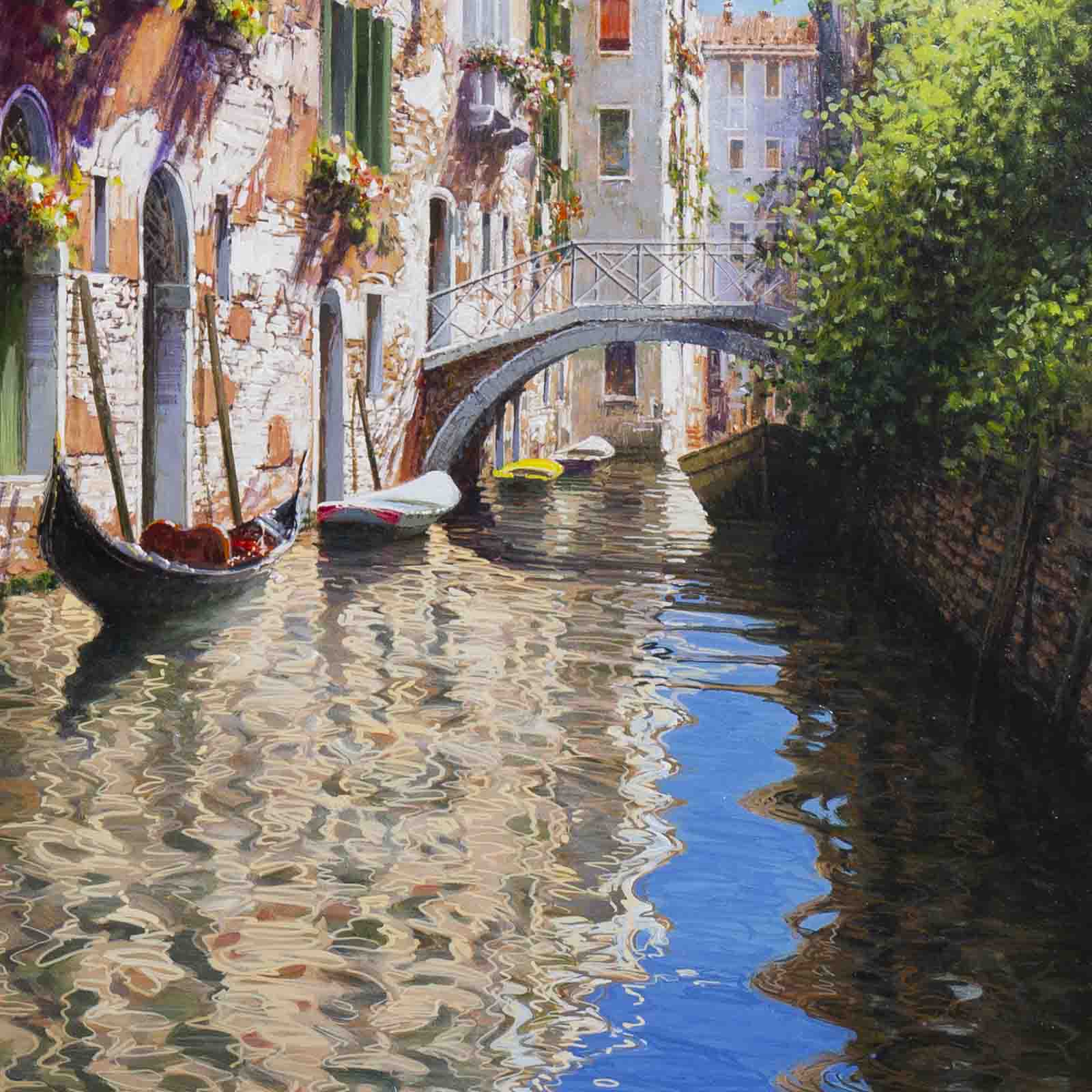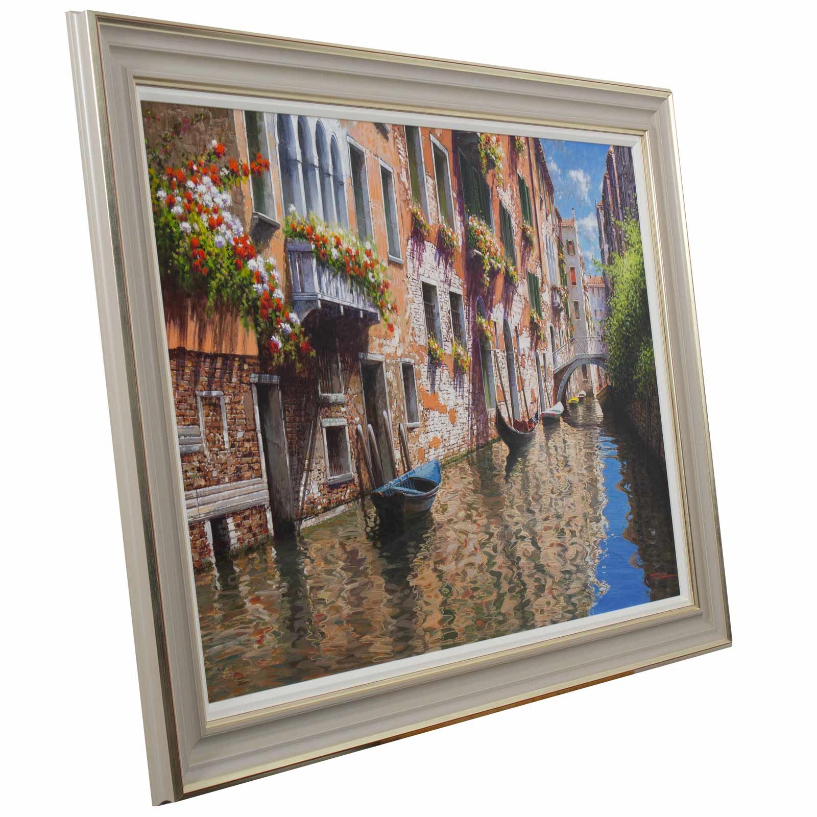 Stunning original painting of Venice replete with detail by Italian artist Raffaele Fiore. Framed in a beautiful wide moulding with warm tones, gold edging and a white slip as shown.