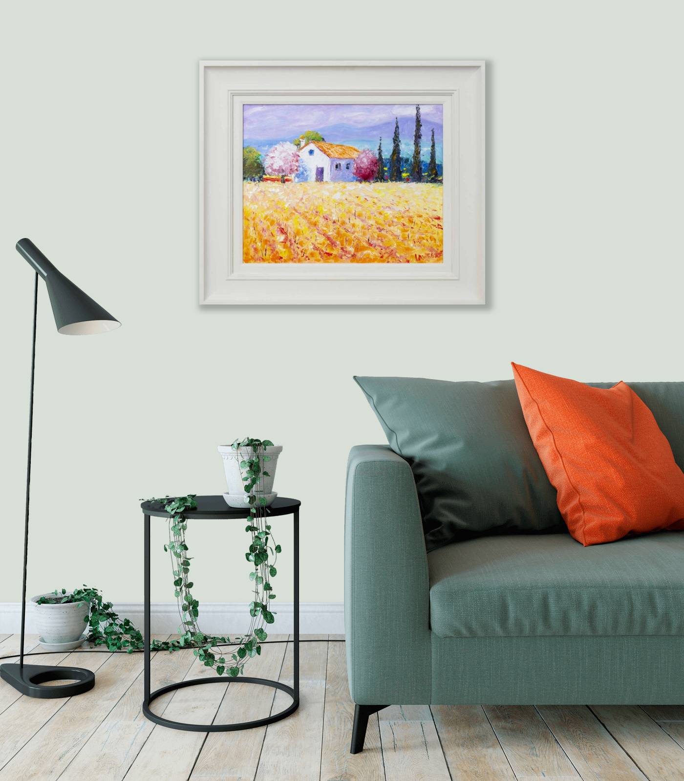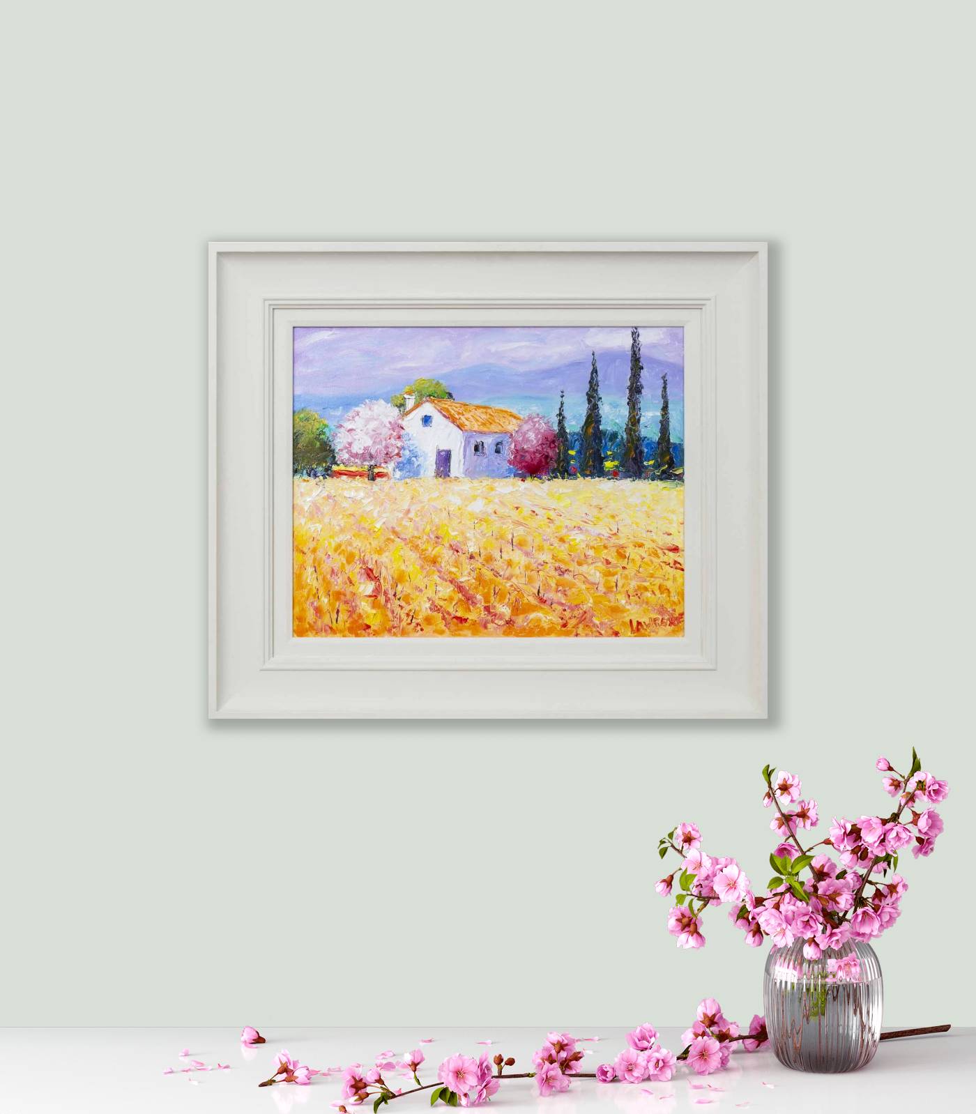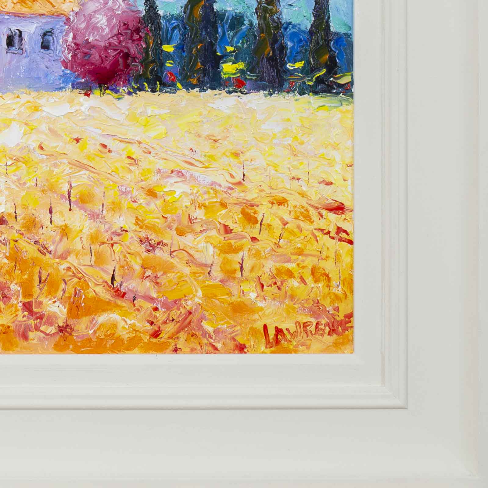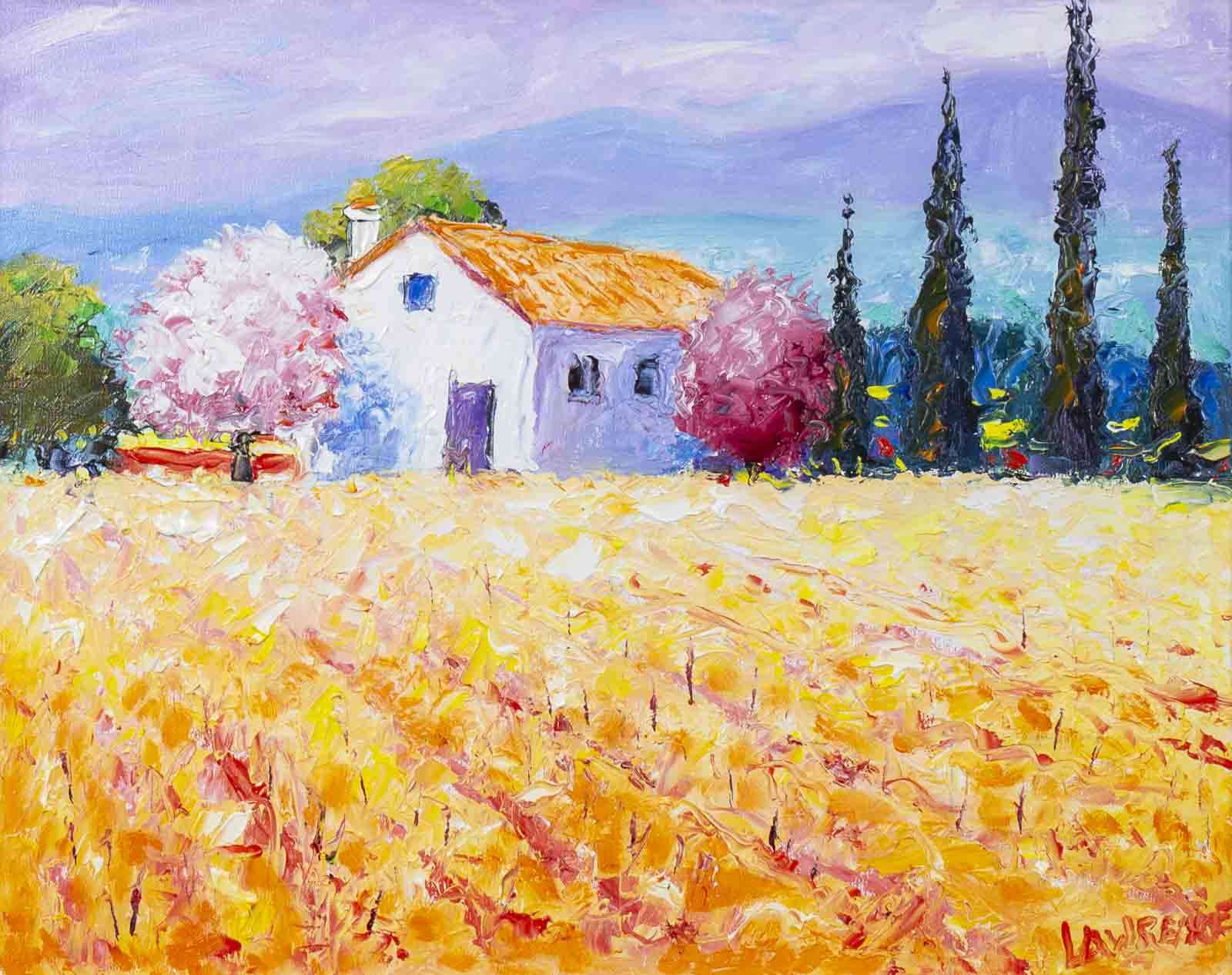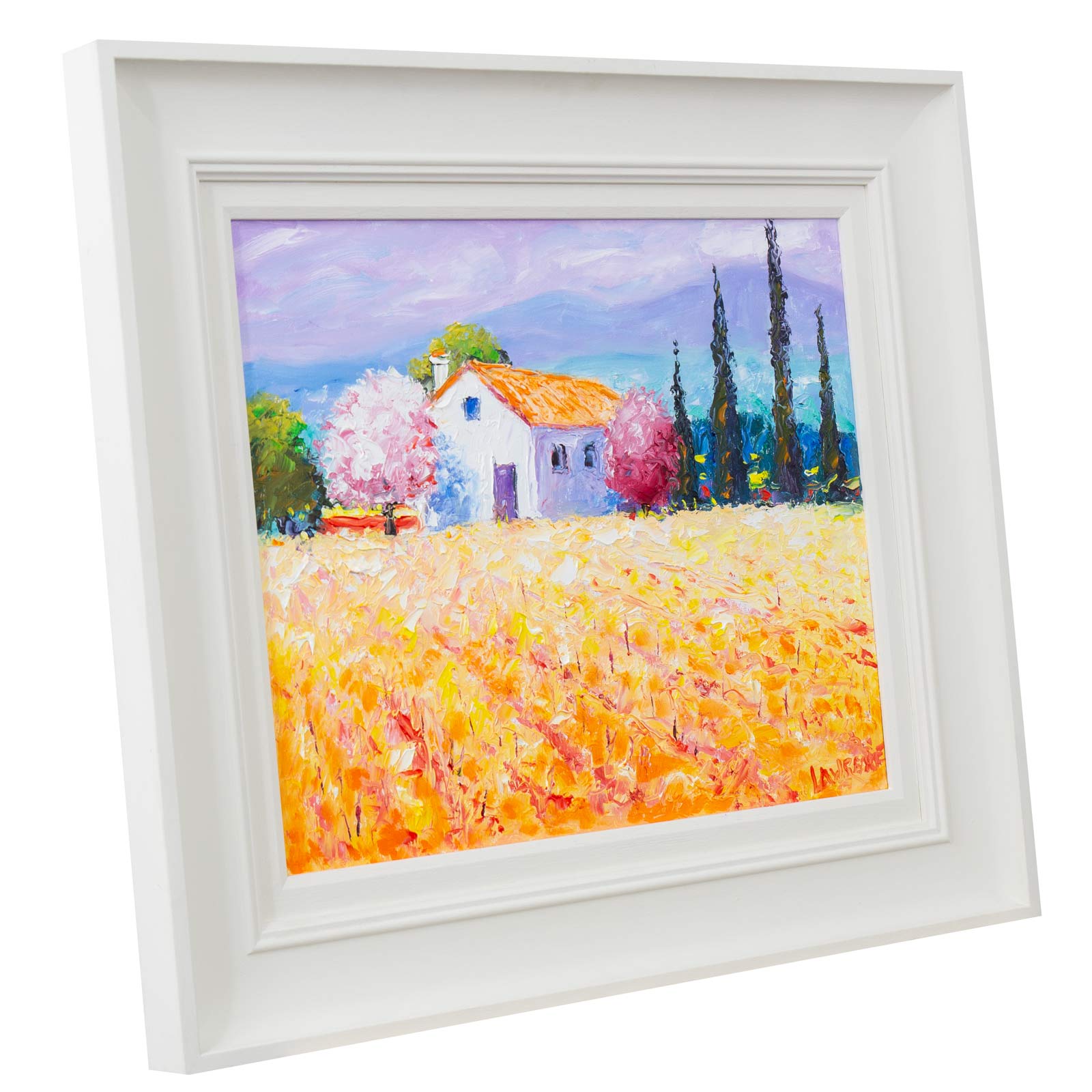 A vibrant rural scene of Provence, France captured by the talented artist John Lawrence. Framed in a white slip with painted wooden frame as shown.