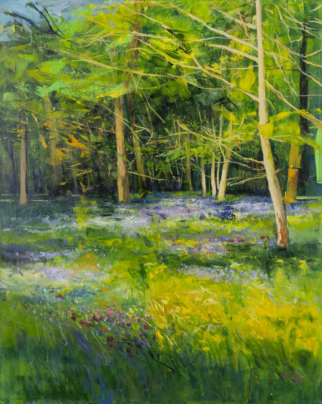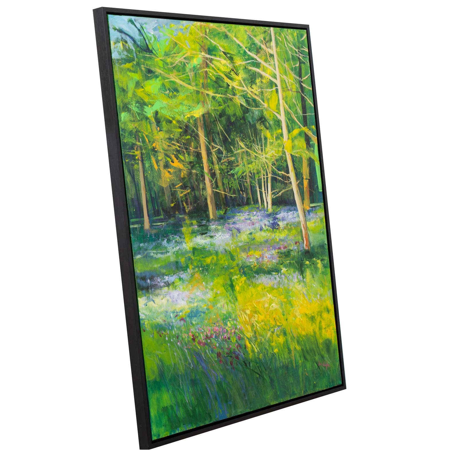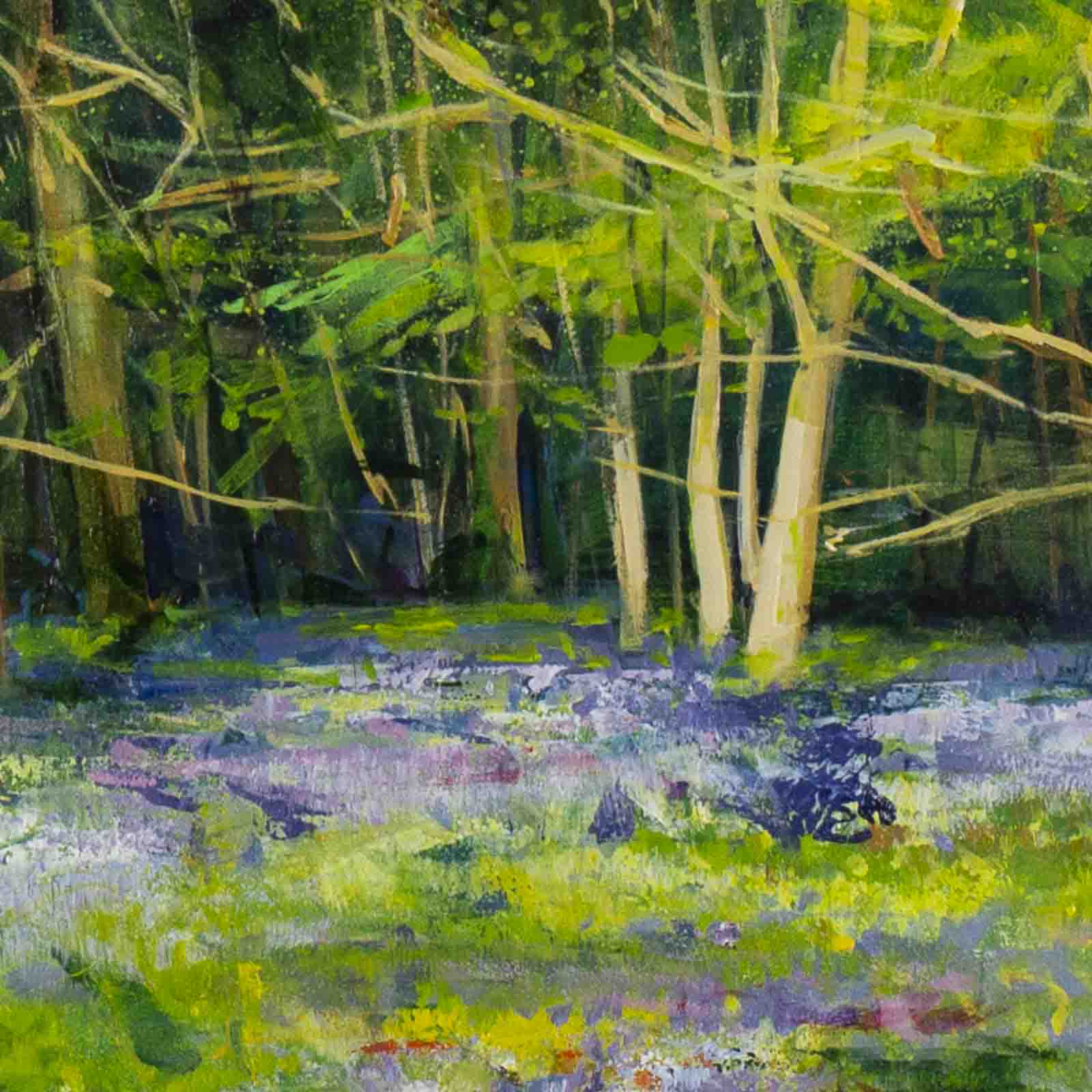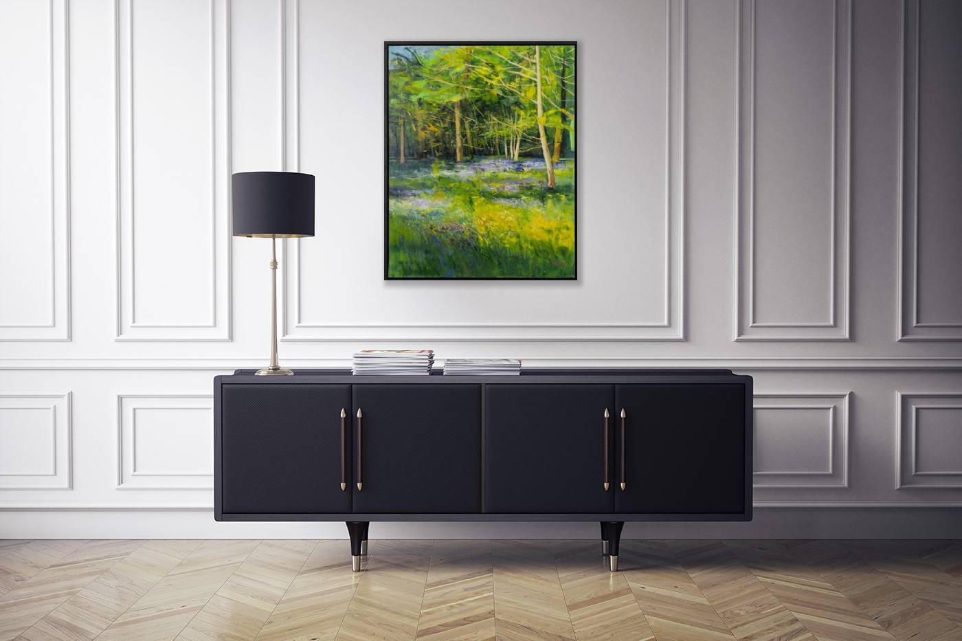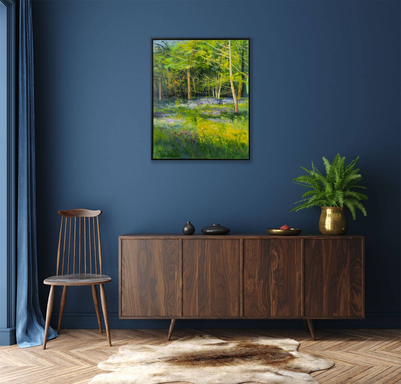 Beautiful woodland scene featuring silver birch trees on a bluebell flower carpet. A wondrous blend of colours by Italian artist Sara Malfer. This original oil painting on canvas is presented in a contemporary style black floating frame and ready to hang. The perfect statement piece to introduce some colour to a room.