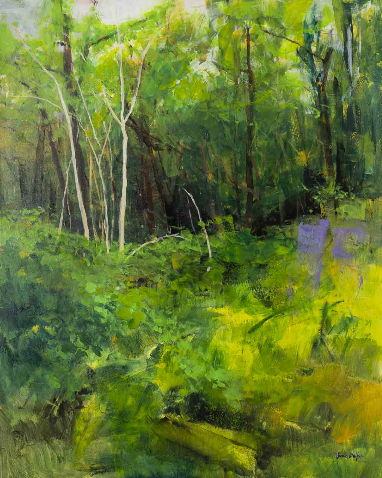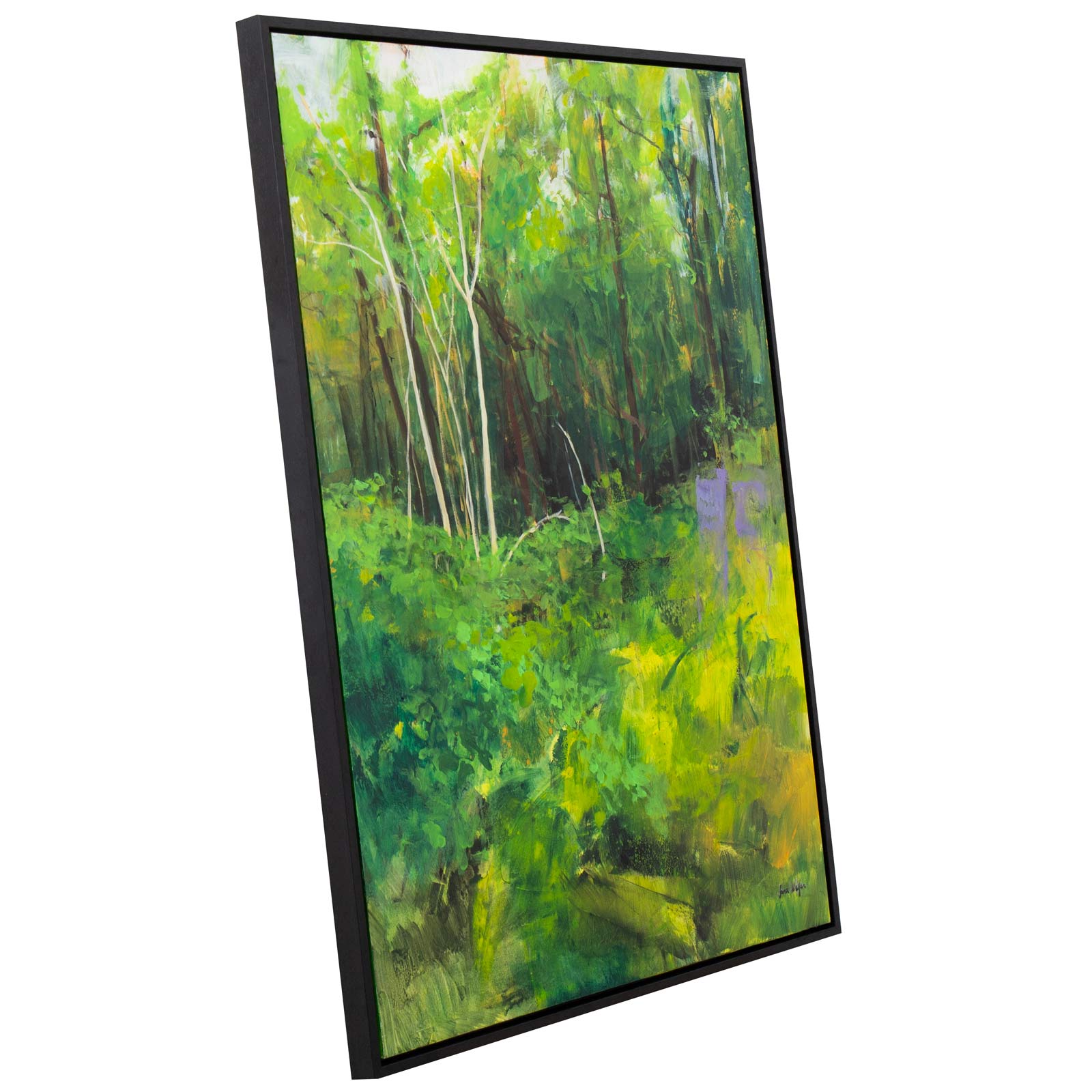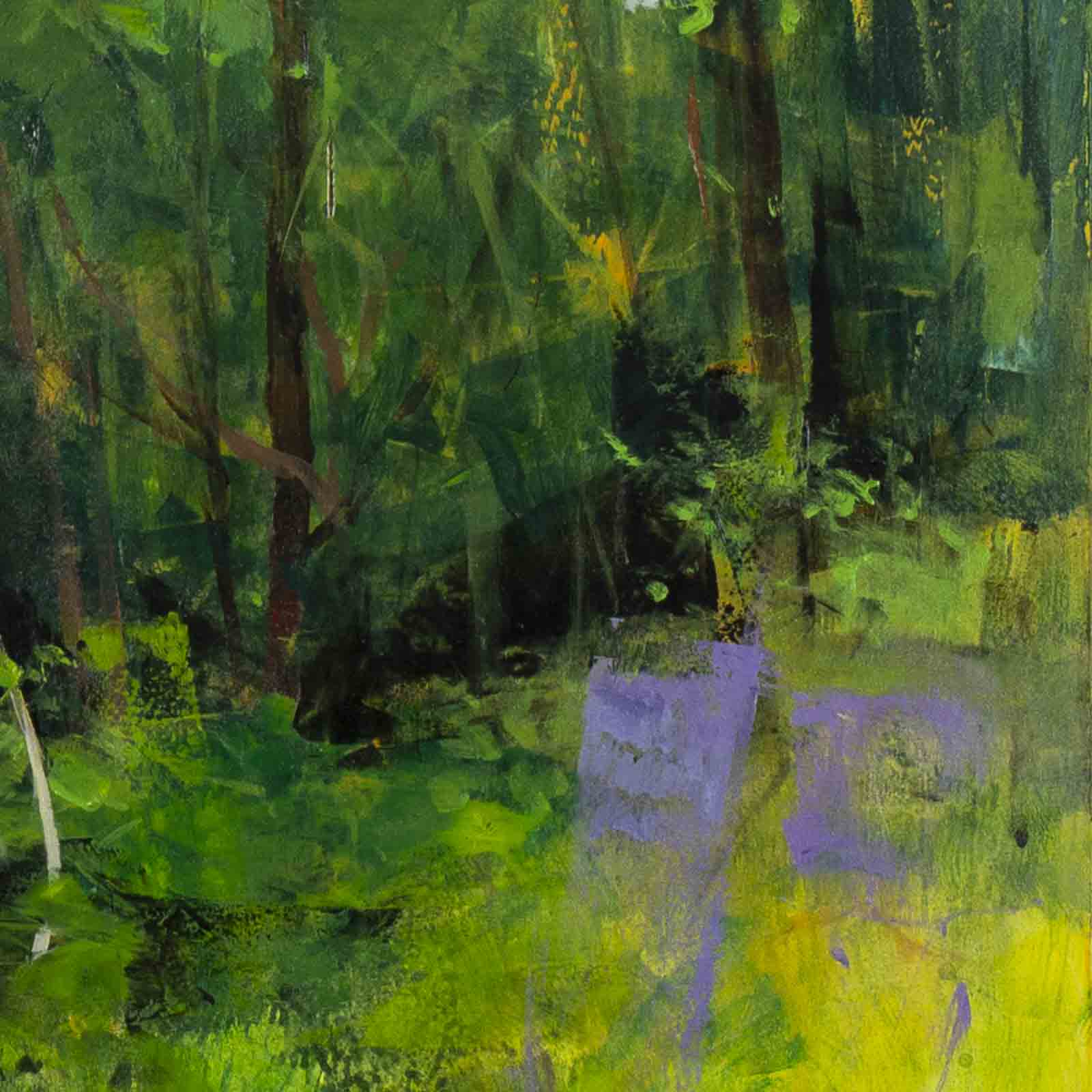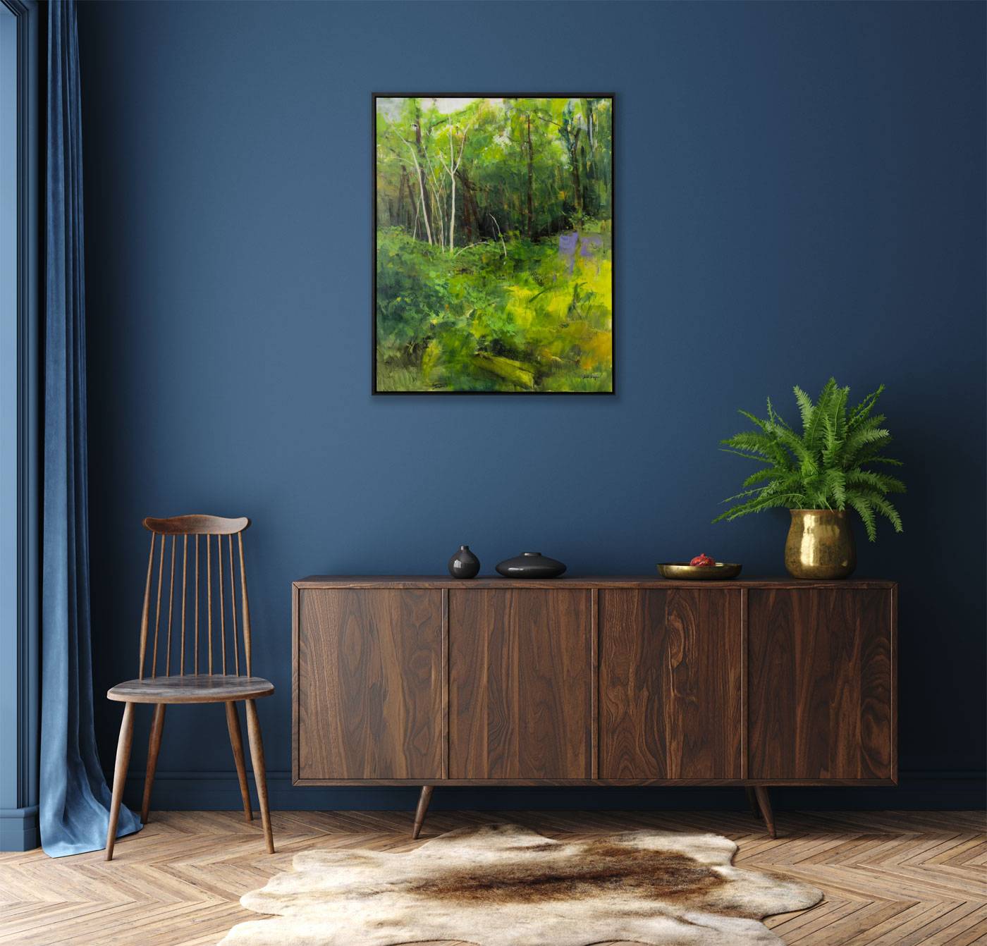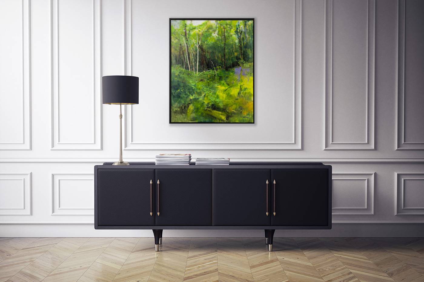 Beautiful woodland scene featuring a forest scene and a wondrous blend of colours by Italian artist Sara Malfer. This original oil painting on canvas is presented in a contemporary style black floating frame and ready to hang. The perfect statement piece to introduce some colour to a room.