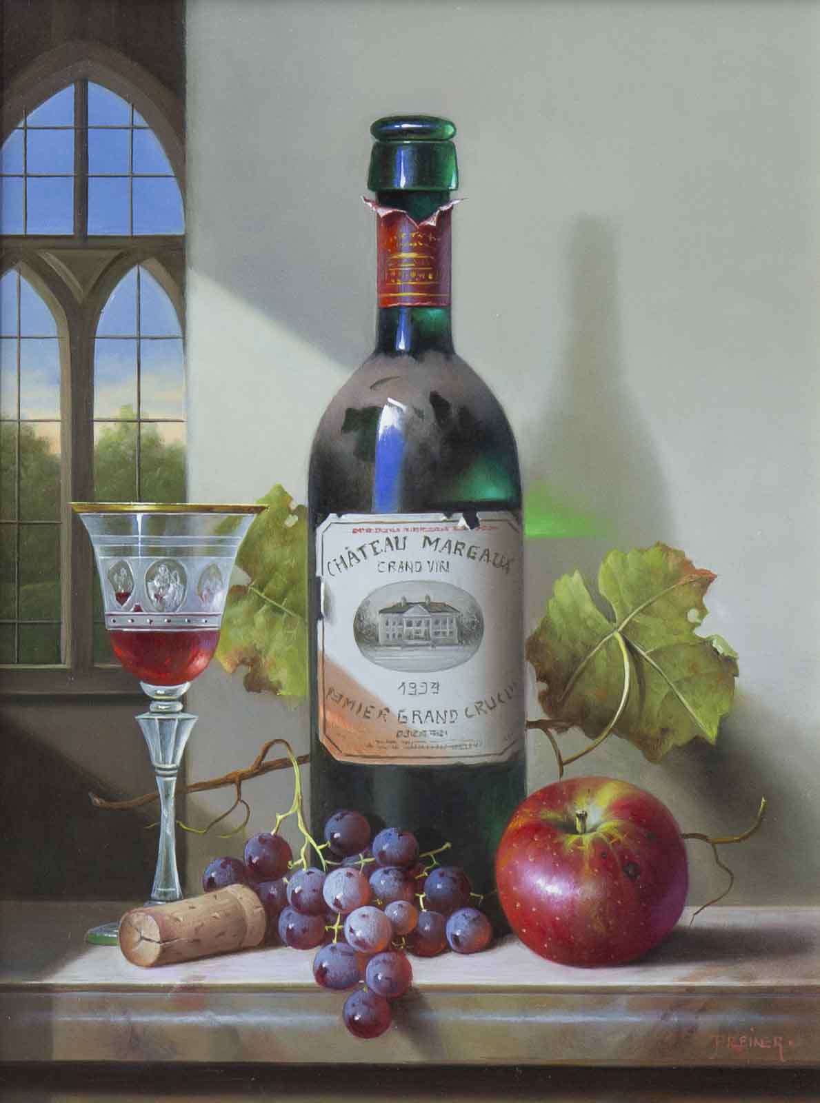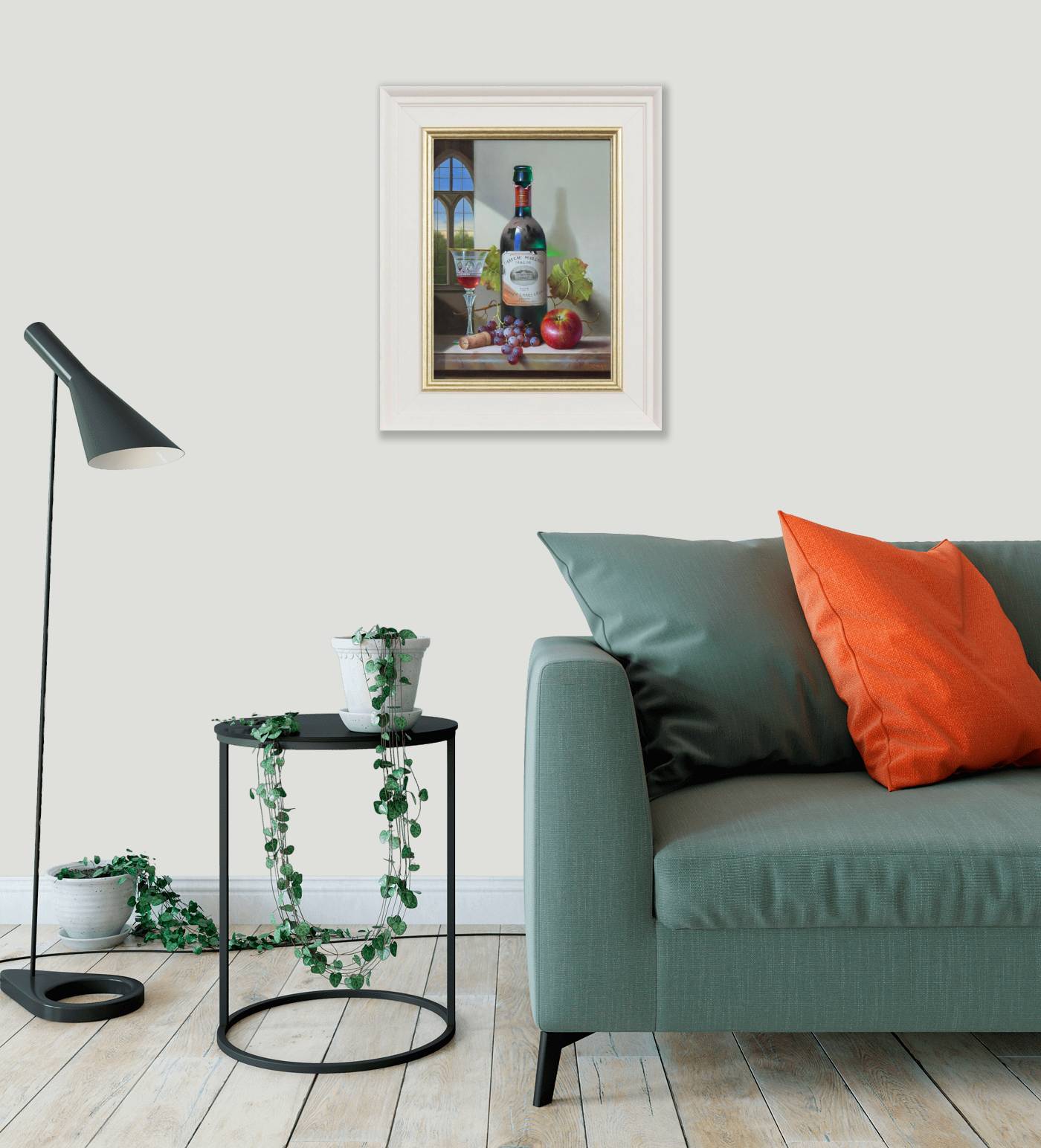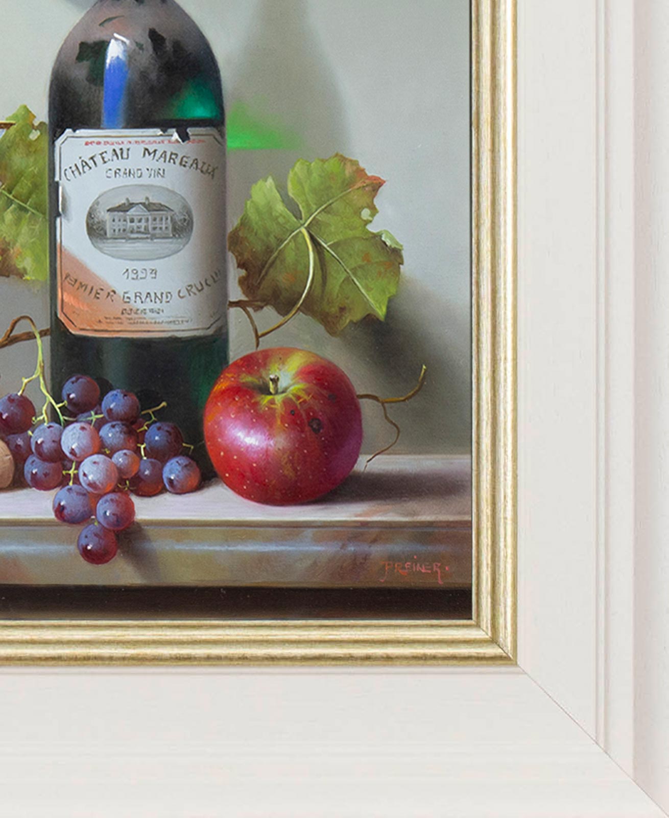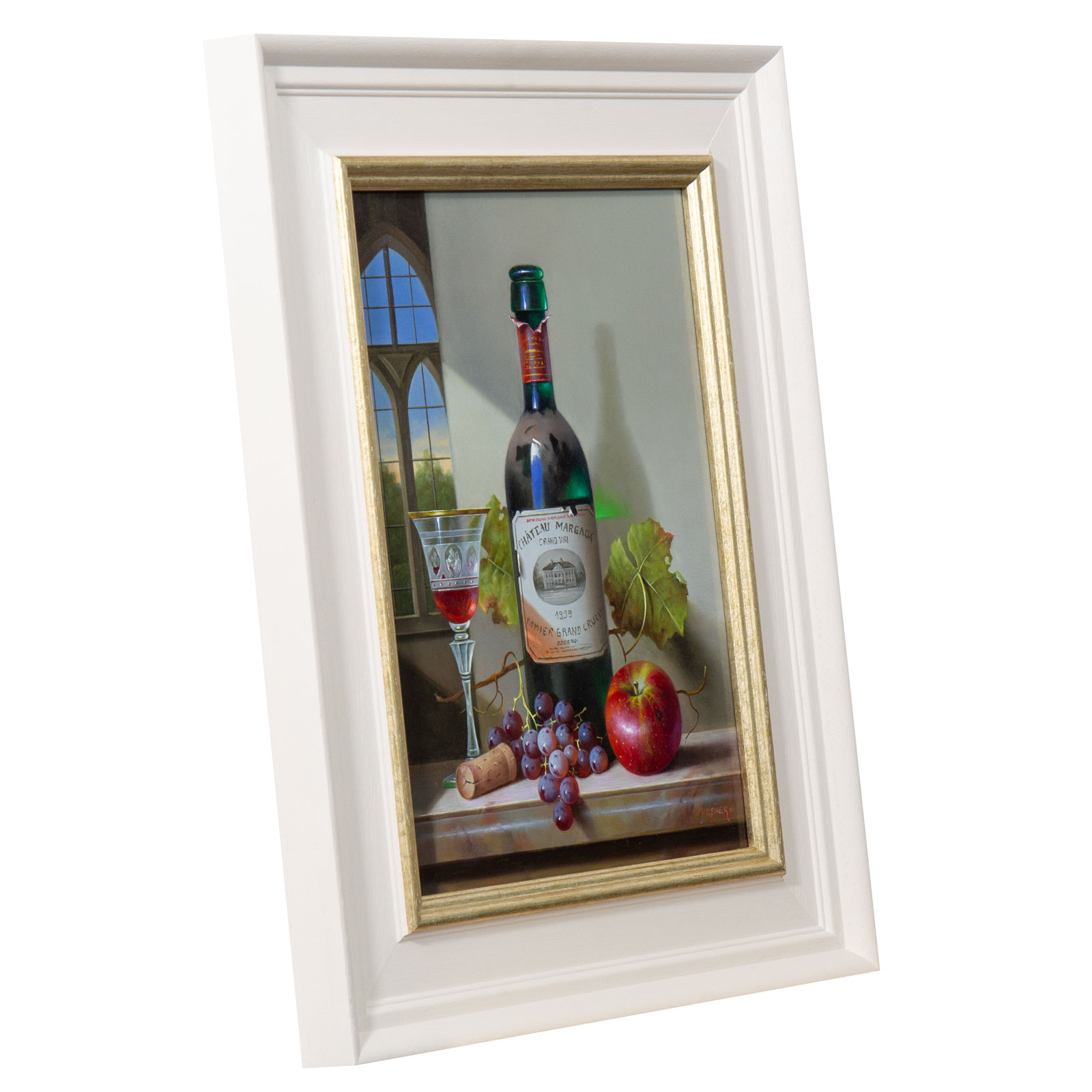 A wonderfully detailed still life painting of a bottle of Château Margaux. Framed with a painted frame and golden trim as shown and ready to hang.