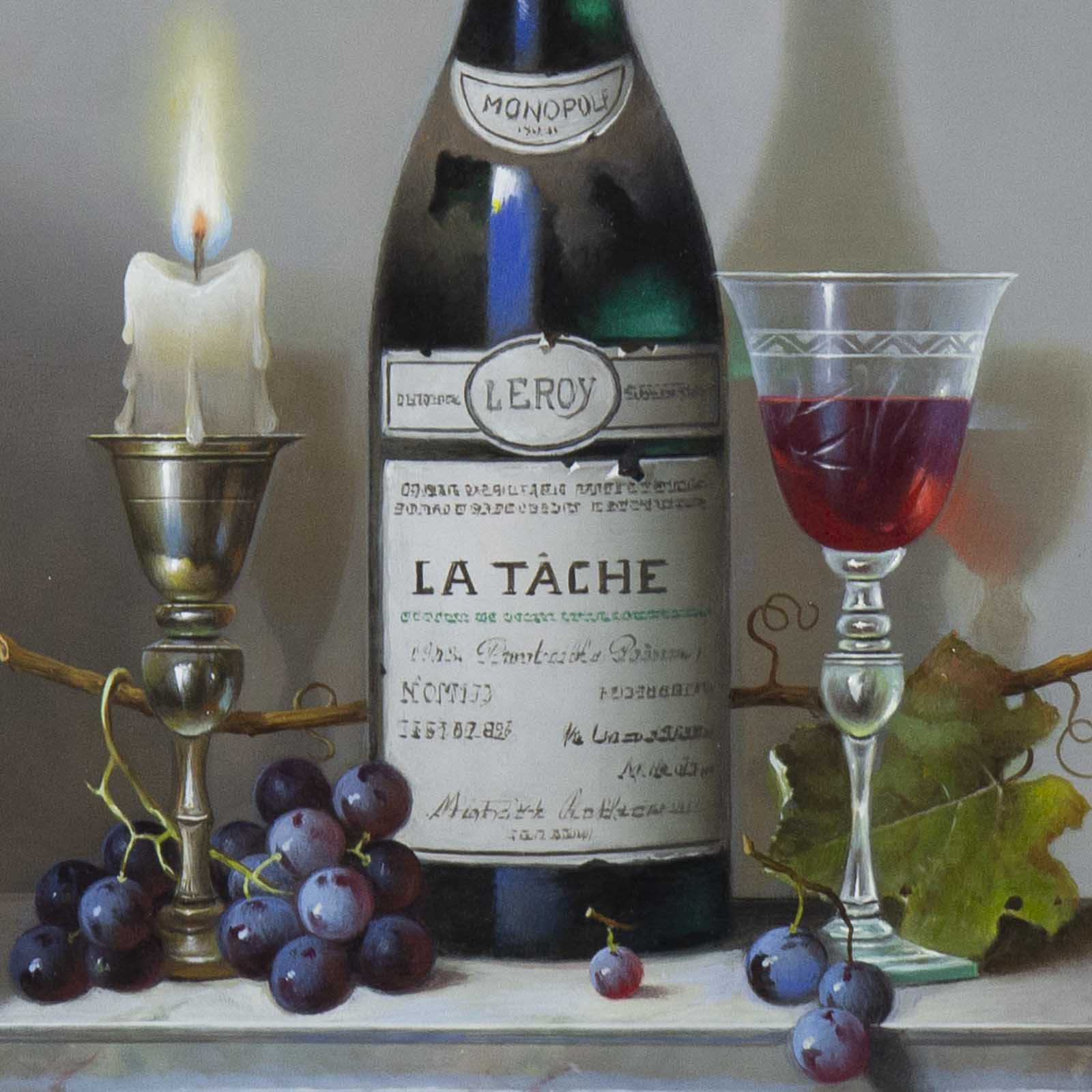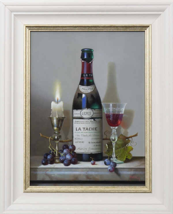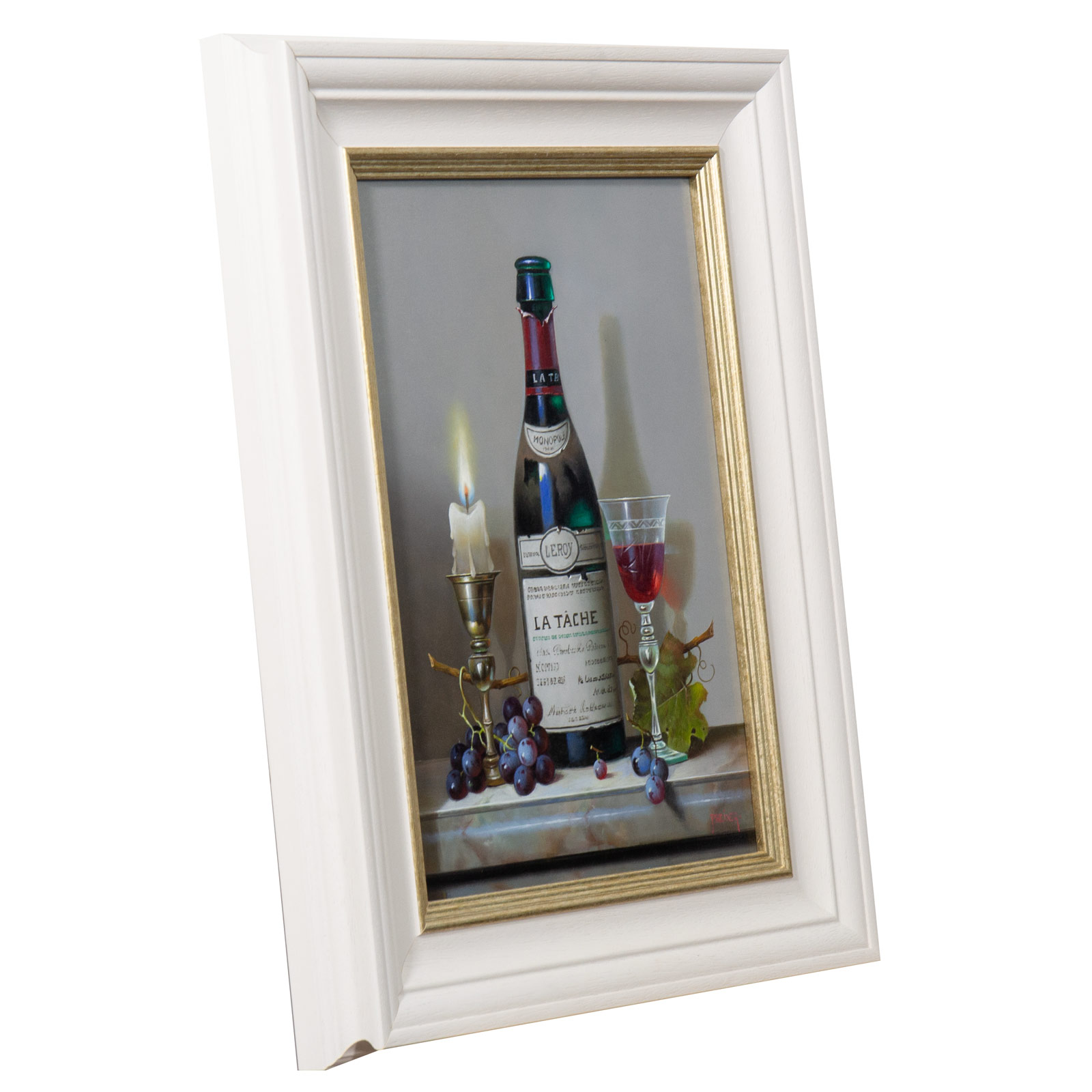 A wonderfully detailed still life painting of a bottle of La Tâche. Framed with a painted frame and golden trim as shown and ready to hang.