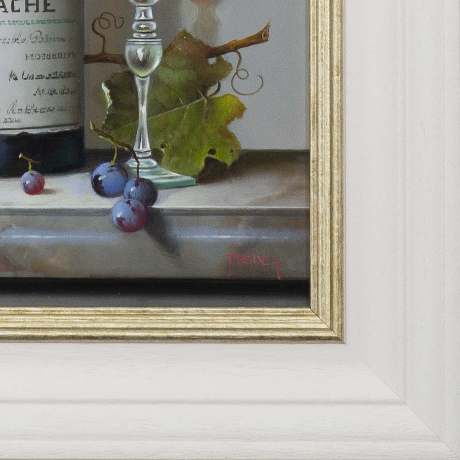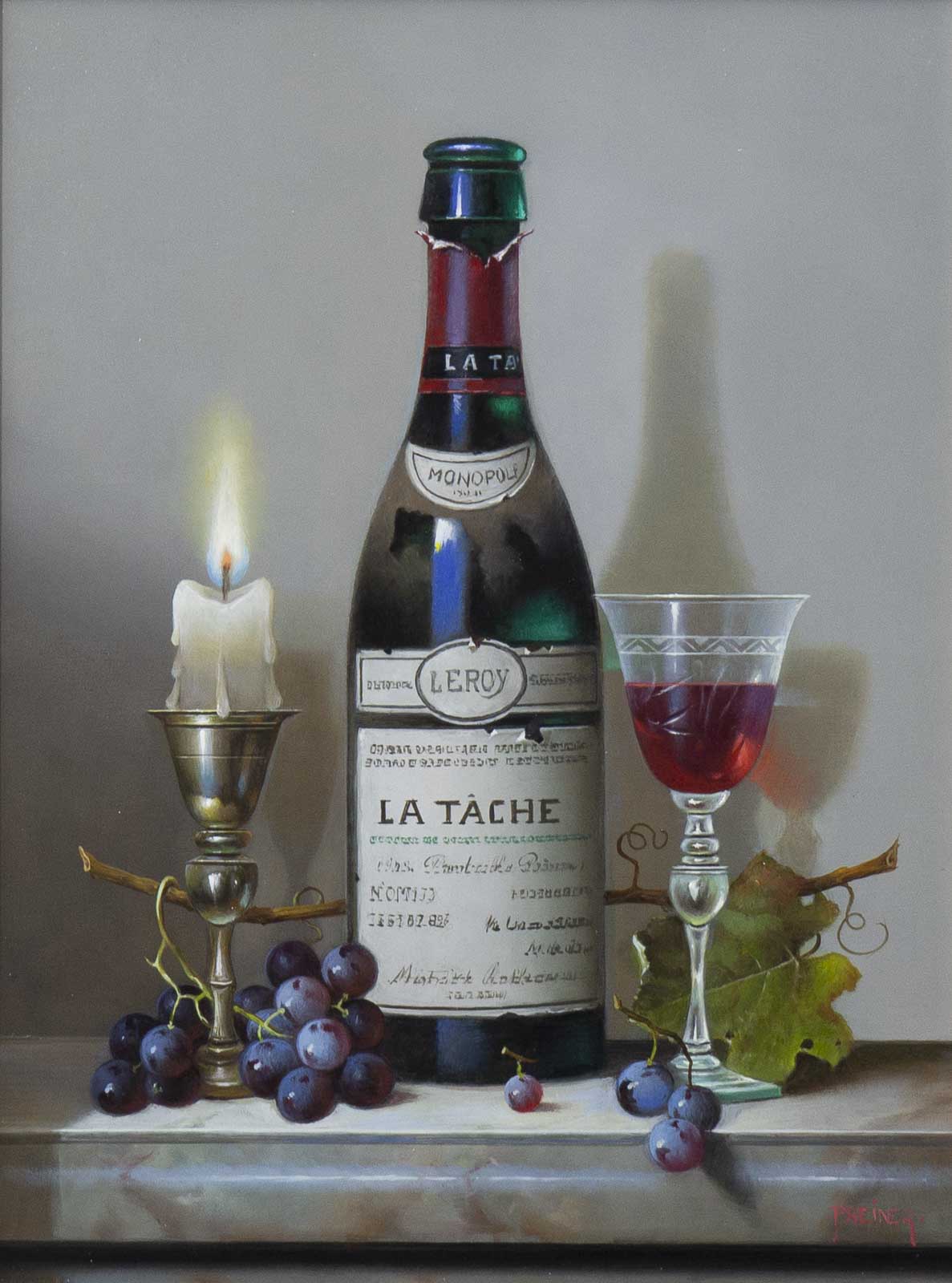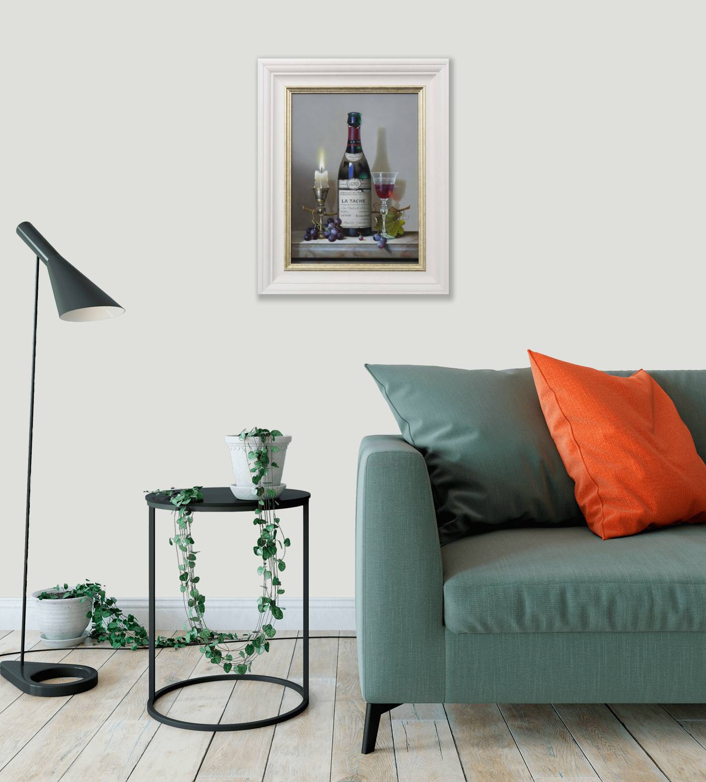 A wonderfully detailed still life painting of a bottle of La Tâche. Framed with a painted frame and golden trim as shown and ready to hang.