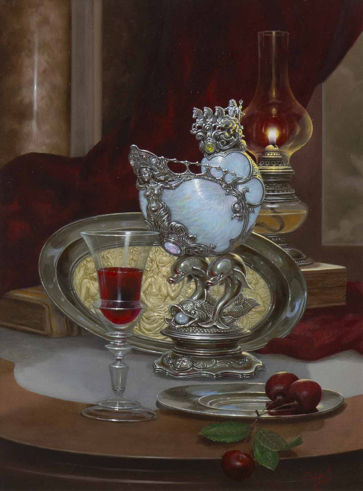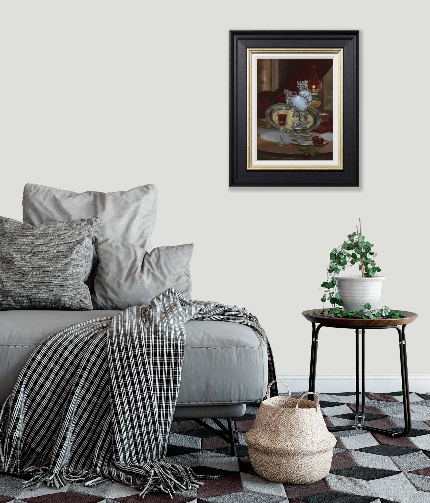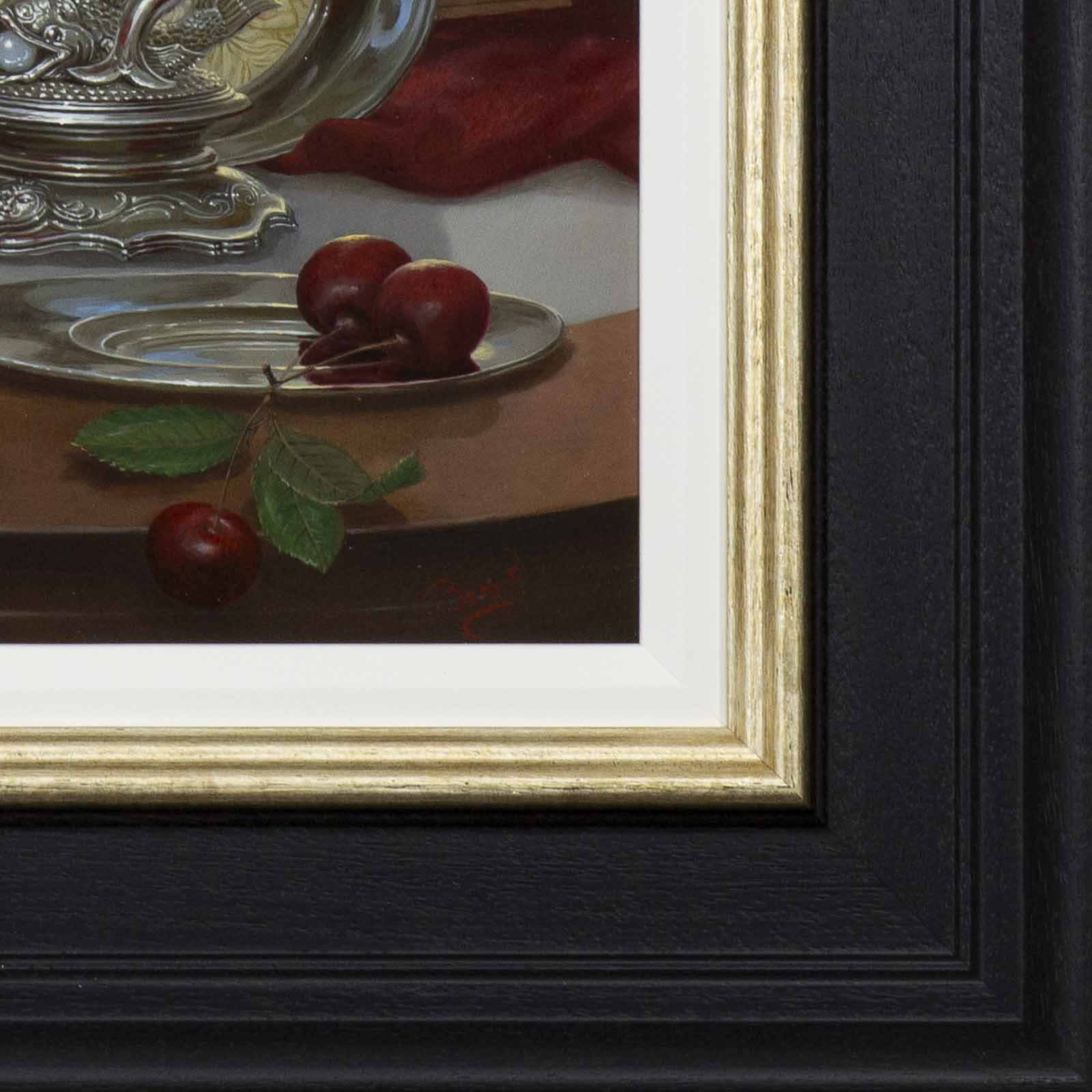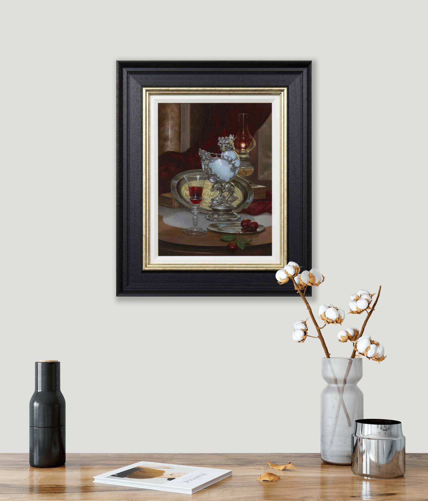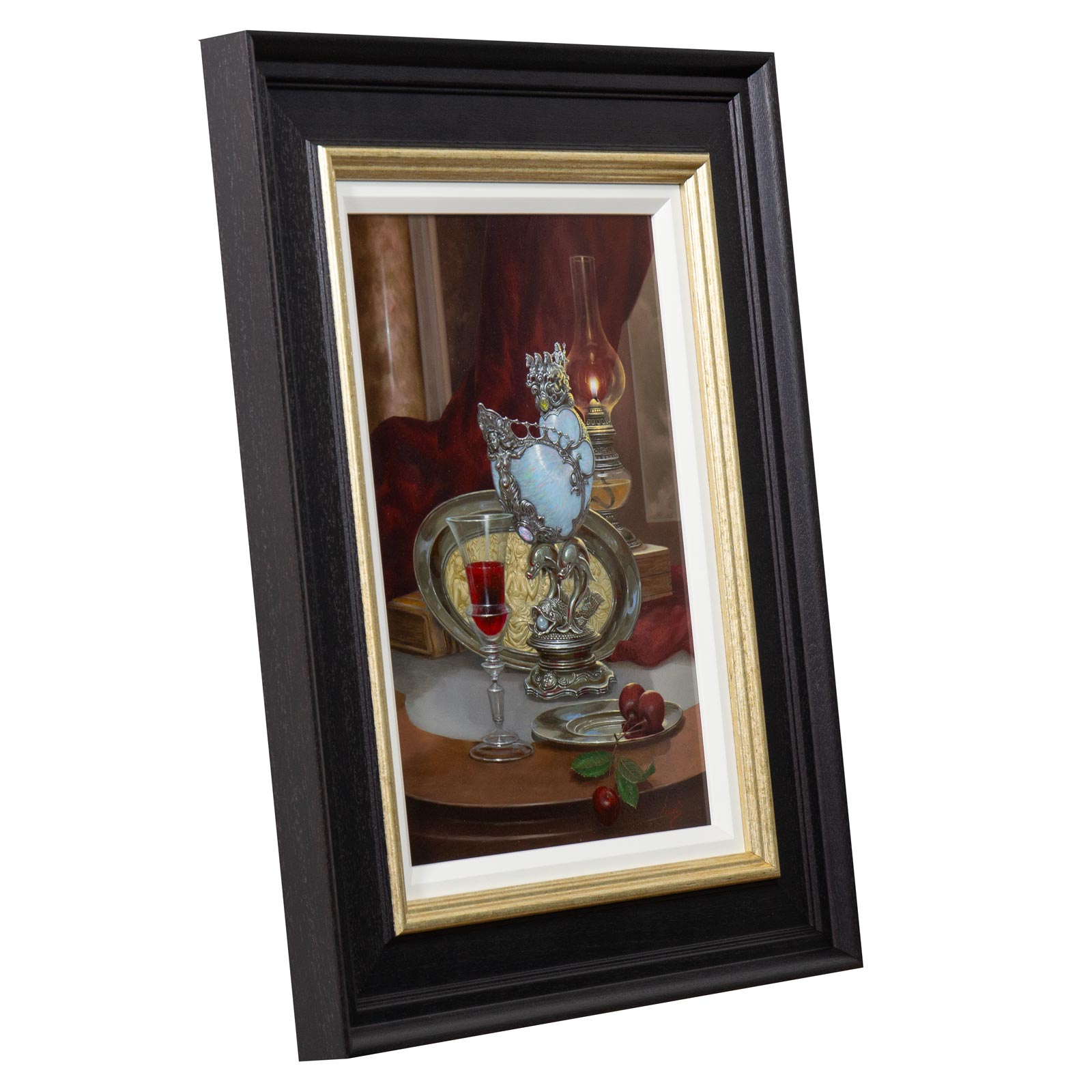 Stunning detailed still life painting by the talented artist Gyula Boros. This is an original painting painted in oil on panel. Framed as shown in black woodgrain moulding with gold detail, off-white slip and ready to hang.