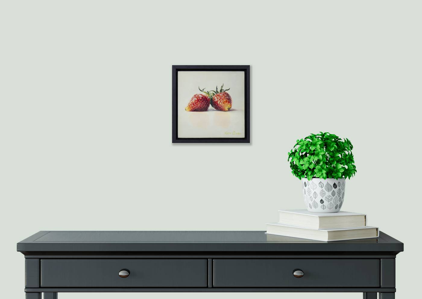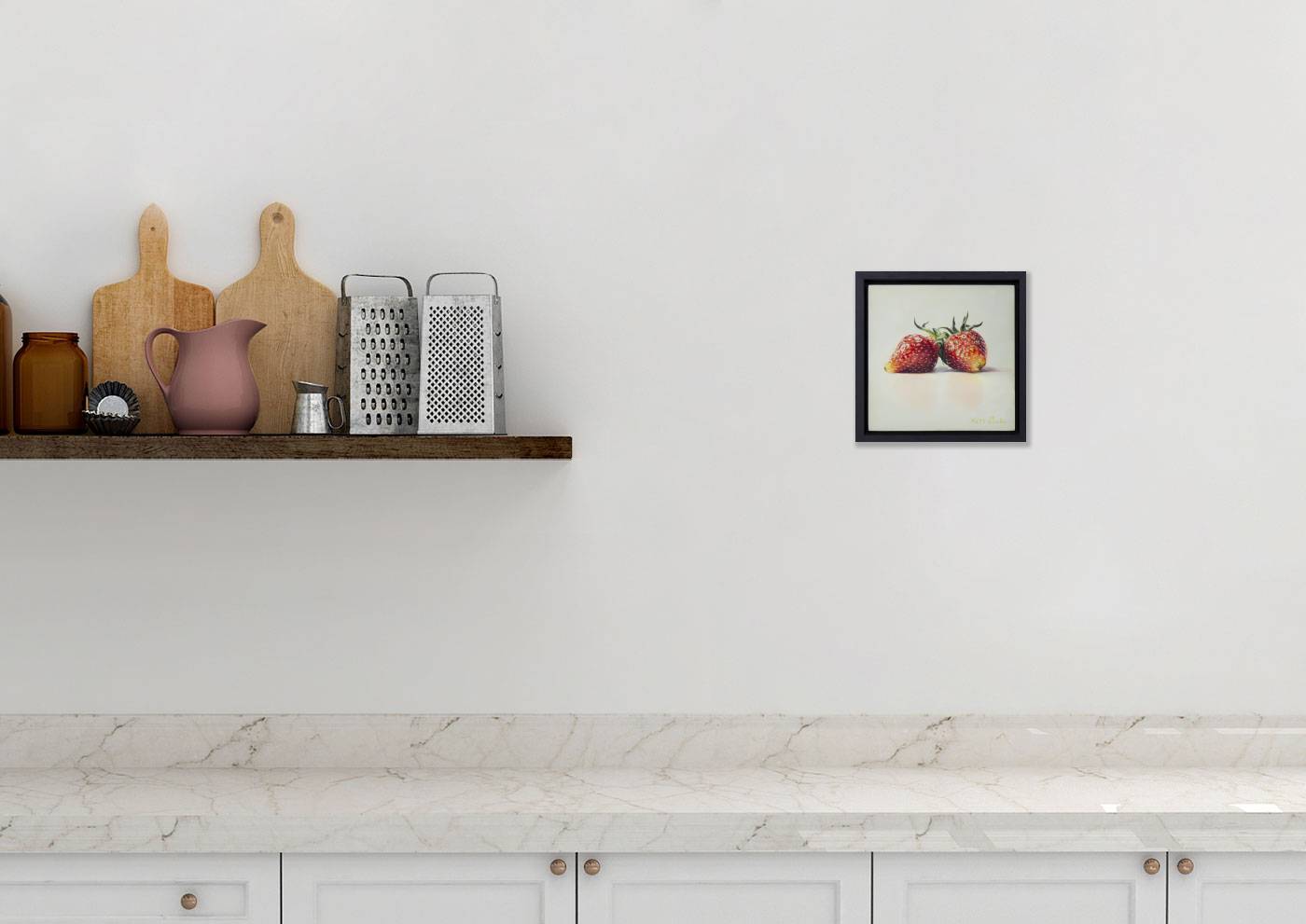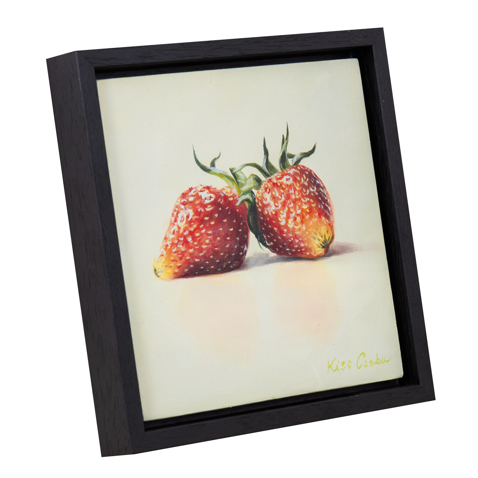 Contemporary still life oil painting set against a soft grey backdrop by artist Kiss Csaba. Presented in a floating matt black frame as shown and ready to hang.