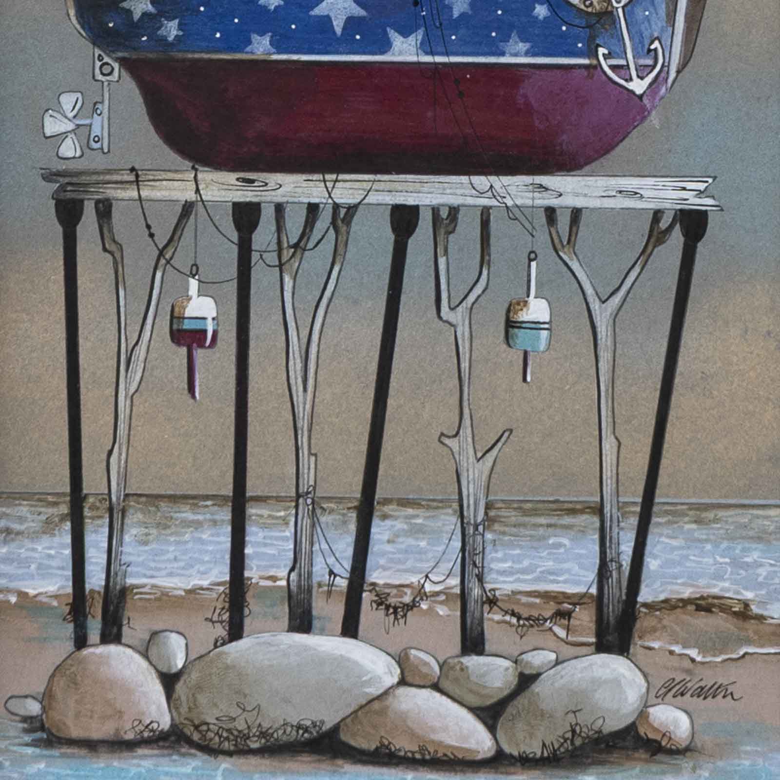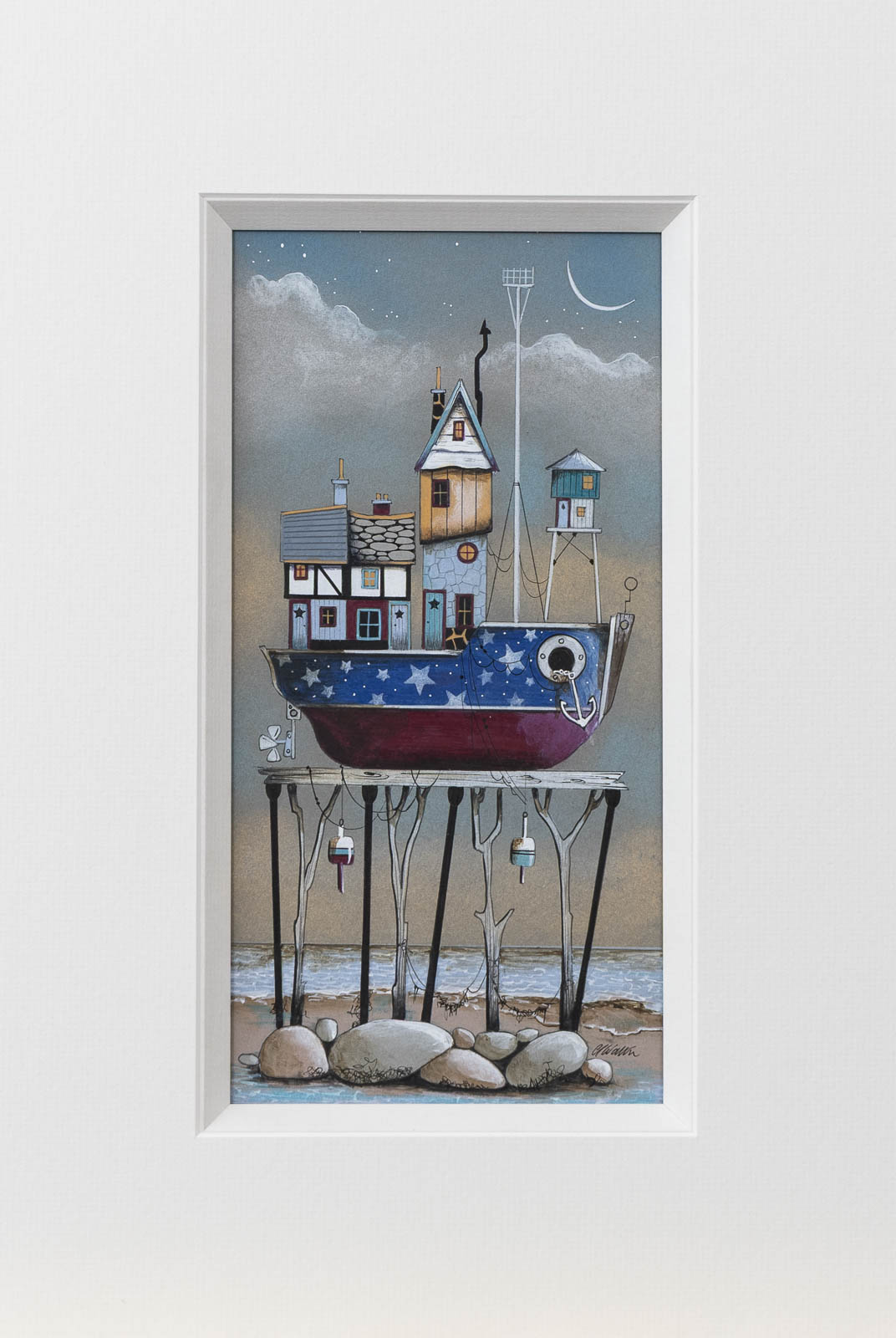 Despite having resided inland over recent years, Gary still has a strong affection for the coast. This is no more evident than in his artwork, with boats, beach huts and lighthouses providing a staple recurring motif. Whimsical buildings inhabit the rolling hills of his landscapes, providing both the audience and artist with a means to escape to his fantastical locations.
