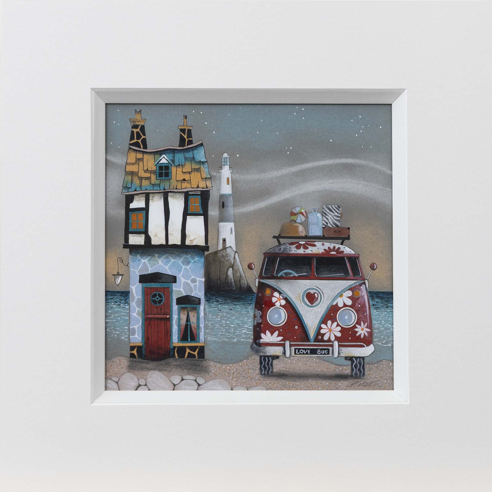 Despite having resided inland over recent years, Gary still has a strong affection for the coast. This is no more evident than in his artwork, with boats, beach huts and lighthouses providing a staple recurring motif. Whimsical buildings inhabit the rolling hills of his landscapes, providing both the audience and artist with a means to escape to his fantastical locations.