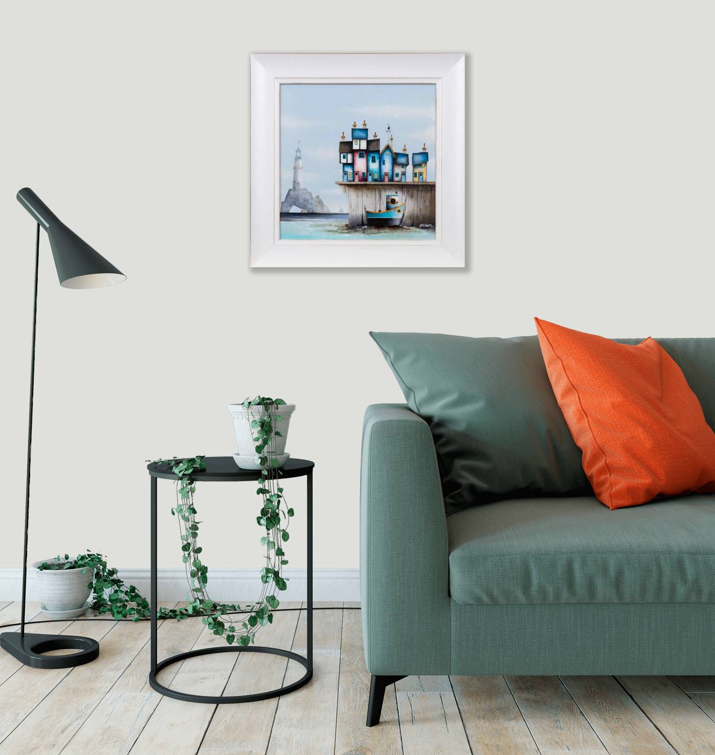• 2. When prompted, press 'Visualise On Wall' and aim your phone at your floor while it calibrates*. A graphic will appear to help scale and position the artwork. You need to ensure this is correctly aligned to where the base of the wall meets the floor