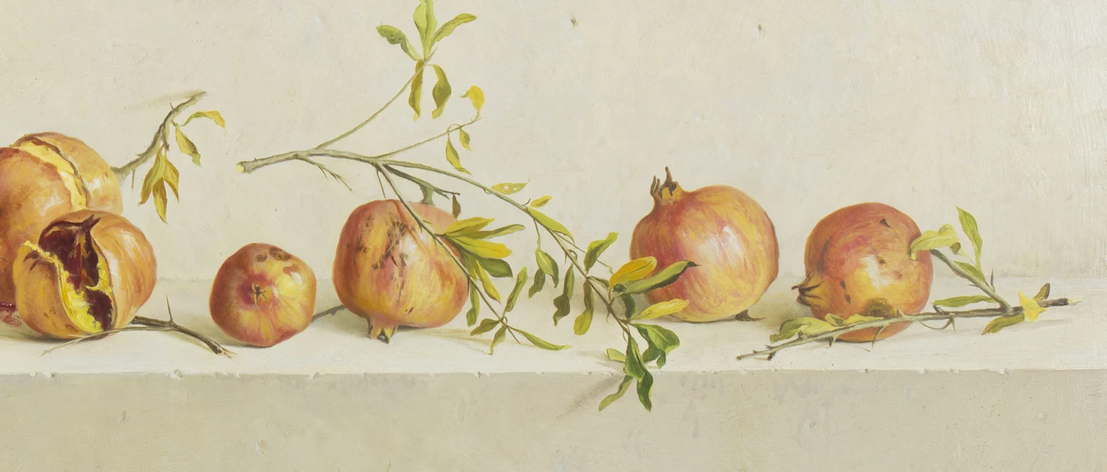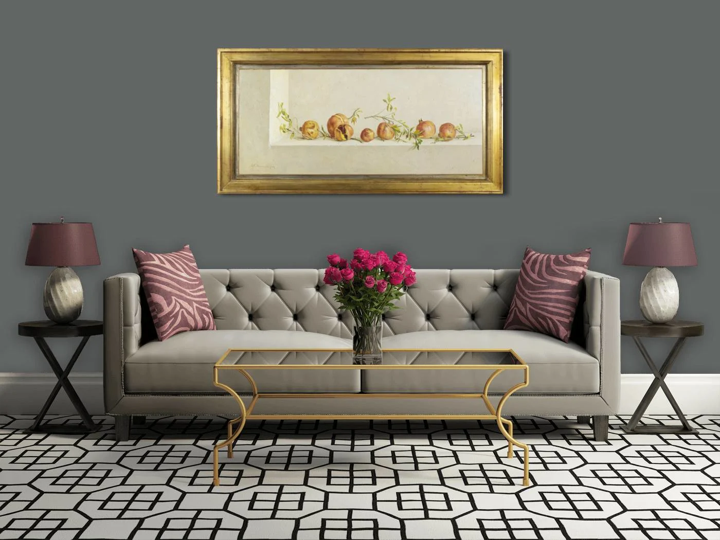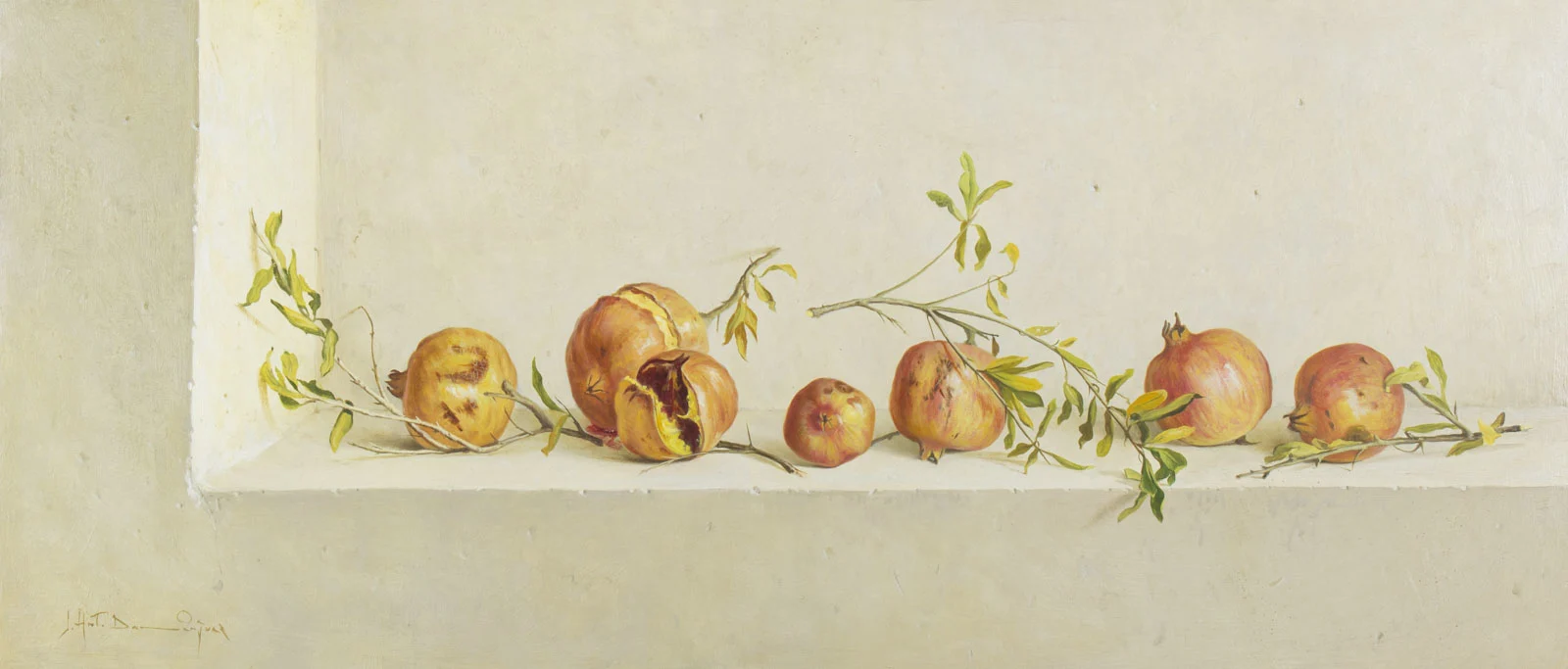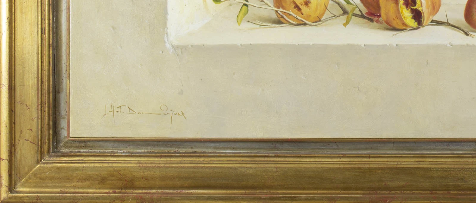Wonderfully calming and minimalist still life oil painting by Spanish artist Juan Antonio Domínguez. Featuring a pleasing arrangement of pomegranates set against a soft tonal wall. Framed in an impressive gold frame with a shallow inset as shown and ready to hang.