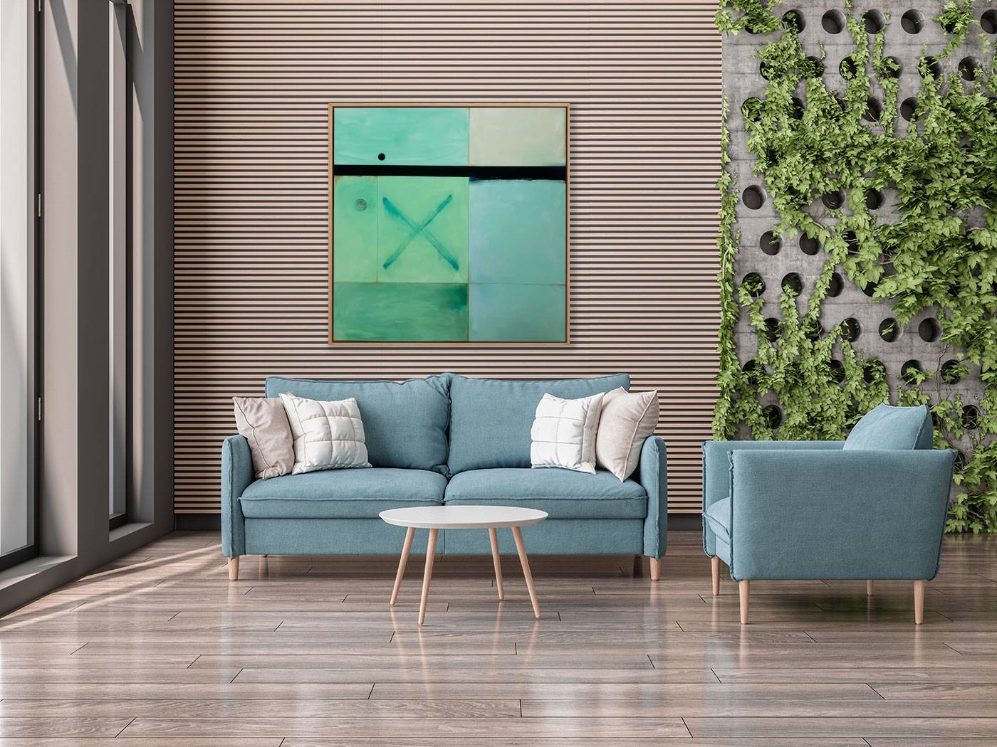 Thought provoking abstract artwork by Spanish artist De Tomàs forming part of his debut collection with Forest Gallery titled ‘Aurora’. Created on multiple wooden panels combined and joined to form one harmonised piece. Presented in a stylish contemporary oak frame as shown and ready to hang.