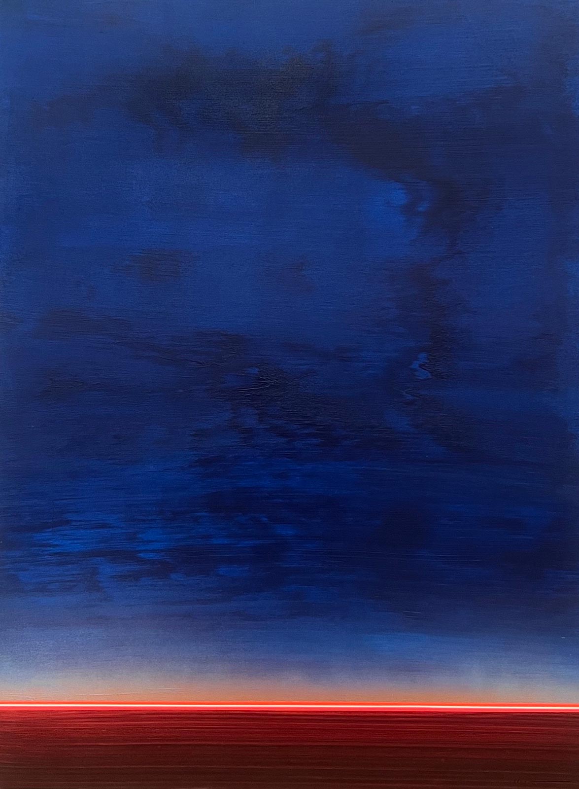 The exploration of materials is an essential part of Rubén’s artistic approach. His works combine acrylic, oil, spray, and airbrushing to create layers of depth and unique atmospheric effects. In many pieces, he dilutes the paint until it becomes almost liquid glazes, achieving transparencies and colour transitions that never repeat, giving each work an unrepeatable character.